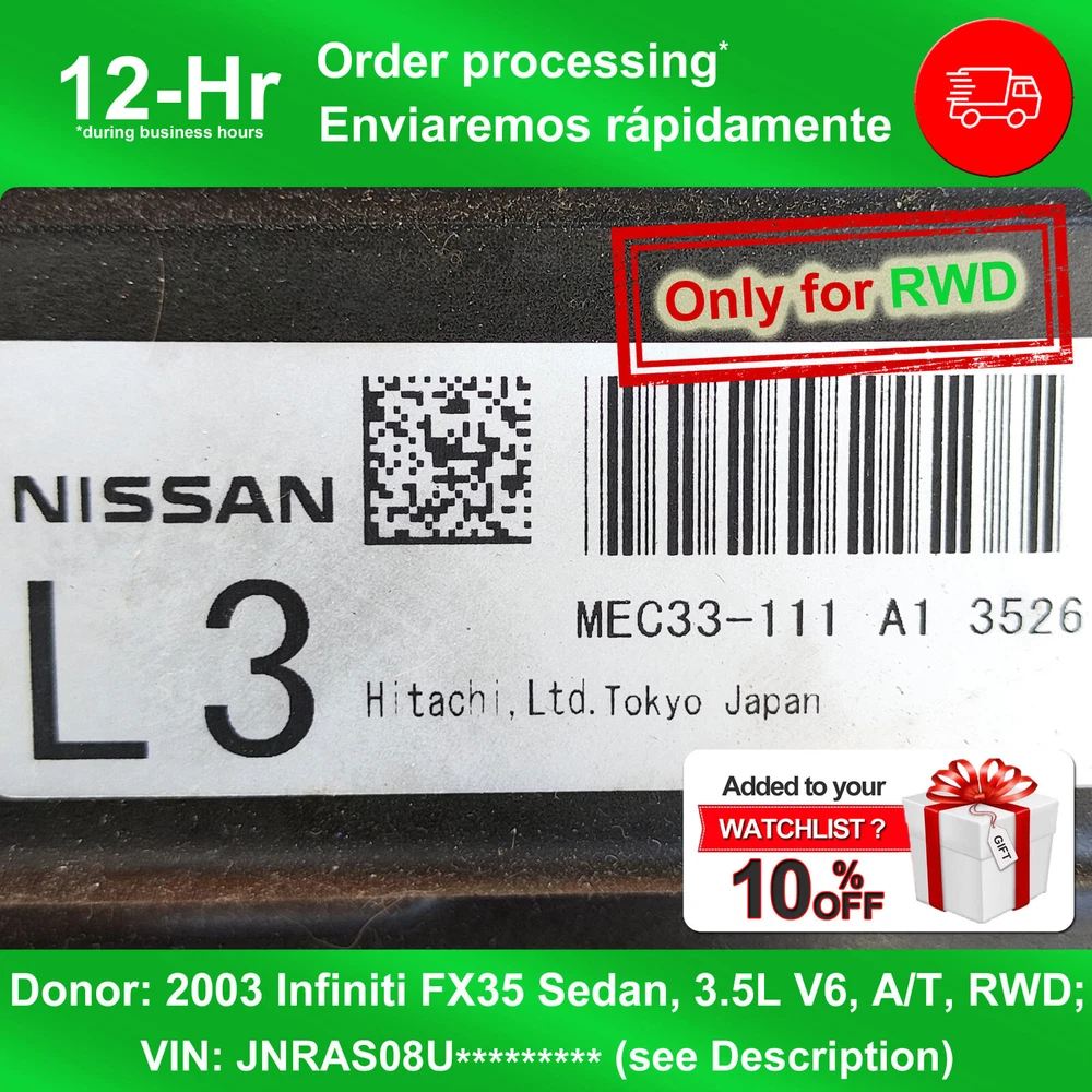 Fast seller ★ ★ ★ ★ ★ Engine Control Module MEC33-111 for 2003 Infiniti FX35 👉 Donor vehicle: 2003 Infiniti FX35 Sedan, 3.5L V6, A/T, RWD; VIN: JNRAS08U13X103008 Reprogramming: Reprogramming may NOT be REQUIRED , but only if your vehicle is identical to the donor vehicle, which could allow you to SAVE money on reprogramming. However, this rule does not apply to all vehicles — please confirm this information with your dealership. If your vehicle is not fully identical to the donor vehicle (e.g., production year, transmission type, body style, or whether it has all-wheel drive), reprogramming will DEFINITELY be necessary. Manufacturer Part Number: MEC33-111, L3 MEC33-111 A1, 23710-CG061, 23710-CG060 🚀 Super fast delivery We ship the vast majority of orders placed during business hours within 6 hours after payment. Enviamos la gran mayoría de los pedidos realizados durante el horario comercial dentro de las 6 horas posteriores al pago. 👌 Buyer Protection 30 day warranty & free returns! ** The part in the pictures are the actual part you will be receiving. After purchase, you are allowed to install and test the module in your vehicle. The warranty remains valid after installation. Not all sellers offer this option. ¡Garantía de 30 días y devoluciones gratuitas! ** La pieza que aparece en las imágenes es la pieza real que recibirás. Después de la compra, se le permite instalar y probar el módulo en su vehículo. La garantía sigue siendo válida después de la instalación. No todos los vendedores ofrecen esta opción. ** Return Policy: The item has security seals. If the item is opened and the security seal is broken, the 30-day warranty and free return are not valid. If the security seals have not been broken, you are guaranteed to receive a 100% refund, regardless of the reason for the return . We do not charge any additional return fees. ** Política de devoluciones: El artículo dispone de precintos de seguridad. Si se abre el artículo y se rompe el precinto de seguridad, no son válidas la garantía de 30 días y la devolución gratuita. Si el artículo no está dañado, tiene la garantía de recibir un reembolso del 100%, independientemente del motivo de la devolución . No cobramos ninguna tarifa de devolución adicional. ECM ECU Nissan for Infiniti FX35 2003 Genuine Original Factory OEM Unit. Hitachi, ltd JAPAN