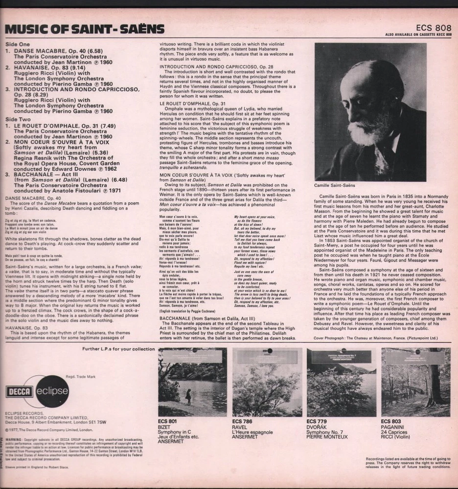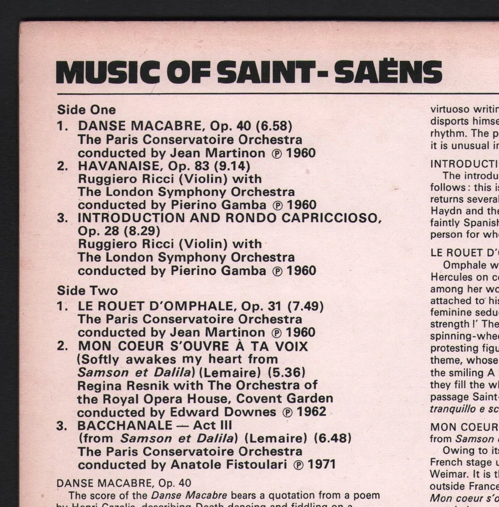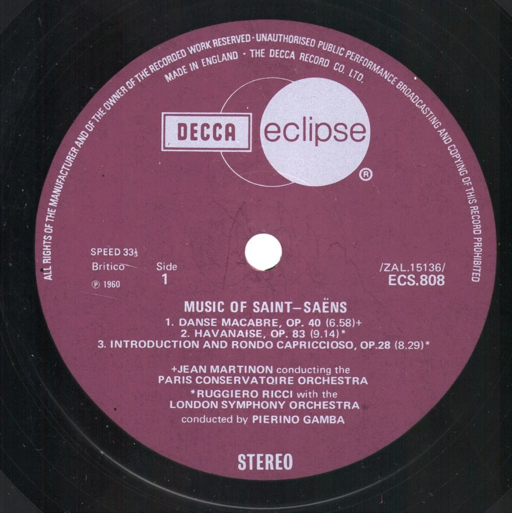 GRADING Our Grading System The table below is an overview of how our grading system works. The first grade is for the sleeve and second grade is for the media/disc, e.g. VG+/EX means that the item's sleeve is in Very Good Plus condition and the media/disc is in Excellent condition. If there is only one condition, e.g. /EX, it means that the item is not in a picture sleeve and that the media/disc is in excellent condition. Records that aren't in picture sleeves will either be in a company sleeve or a generic plain sleeve. If you have any questions, please get in touch. Condition Sleeve Media MINT (10/10) Mint, perfect Mint, perfect EX+ (9/10) Excellent plus, near mint Excellent plus, near perfect EX (8/10) Excellent, well looked after, clean, only slight signs of use Excellent, well looked after, clean, only slight signs of use EX- (7/10) Excellent minus, light wear and signs of use Excellent minus, light wear and signs of use VG+ (6/10) Very good plus, some moderate wear Very good plus, some scuffs, no deep marks VG (5/10) Very good, well used and worn Very good, well used and marked VG- (4/10) Very good minus, very worn Very good minus, very worn and marked GOOD (3/10) Good, some major wear Good, some major wear and scuffing FAIR (2/10) Fair, major wear Fair, major wear and scuffing POOR (1/10) Poor, severe wear Poor, severe wear and scuffing DELIVERY Combined Postage If you add all the items you wish to purchase from us to your shopping basket/cart, and then go to the checkout page from the shopping basket page, the shipping cost will be automatically combined. Packaging All of our items are parcelled using strong specially designed packaging, each vinyl in an order is placed in a clear plastic sleeve and plain paper white sleeve, and is separated from its cover (unless it is advertised as sealed), to prevent any damage during transit. If an item is sealed, and you would prefer the vinyl to be placed outside of its sleeve before dispatch, please let us know. Prices You can see all delivery options and prices for an item on the "Postage and payments" tab. Tracked delivery If you wish to have a tracking number with your order, please select the "Signed" or "Express" delivery option, "Standard" delivery does not include a tracking number. SHOP Click here to view our Ebay shop, with over 200,000 items in stock FAQ Does a used item include the original inner sleeve/insert/poster etc.? We will always include in the description if a used item includes any additional parts, e.g. "with inner" or "includes poster", if you know an item originally came with any additional parts, such as a printed inner sleeve, and it isn't mentioned in the description, then generally the used item won't include it, but please feel free to ask. New items will always be complete, unless otherwise specified. CATEGORIES Shop Home 10" Vinyl Records 12" Vinyl Records 7" Vinyl Records Cassettes (Tape) CDs (Compact Discs) LP Vinyl Records Music Memorabilia Other Artist Various Artists Title Music of Saint-Saens Format LP Vinyl Country UK Label Decca Eclipse Catalogue Number ECS808 Year 1977 Description 6 track stereo Condition (Sleeve/Disc) VG+/VG+ Track List A1. Danse Macabre, Op. 40 (6:58) A2. Havanaise, Op. 83 (9:14) A3. Introduction And Rondo Capriccioso, Op. 28 (8:29) B1. Le Rouet D´Omphale, Op. 31 (7:49) B2. Mos Coeur S´Ouvre Á Ta Voix (Softly Awakes My Heart From Samson Et Dalila) (Lemaire) (5:36) B3. Bacchanale - Act III (From Samson Et Dalila) (Lemaire) (6:48) DELIVERY INFORMATION If you wish to have a tracking number with your order, please choose the Signed or Express delivery option, the Standard delivery option does not include a tracking number. Please note, the Express option for delivery outside of the UK includes a tracking number, but has the same delivery time as the Standard option. WE HAVE MORE VARIOUS ARTISTS ITEMS IN STOCK We have more items in stock by this artist, click here to see them. ABOUT US Vinyl Tap has been in the business of selling music for over 30 years, and in that period we have supplied many thousands of collectors and music fans around the globe with vinyl, CDs and music memorabilia. You can check out the over 200,000 items that we have in stock on our Ebay shop, here . Artist: Various Artists - Title: Music of Saint-Saens - Format: LP Vinyl - Country: UK - Label: Decca Eclipse - Catalogue Number: ECS808 - Year: 1977 - Description: 6 track stereo