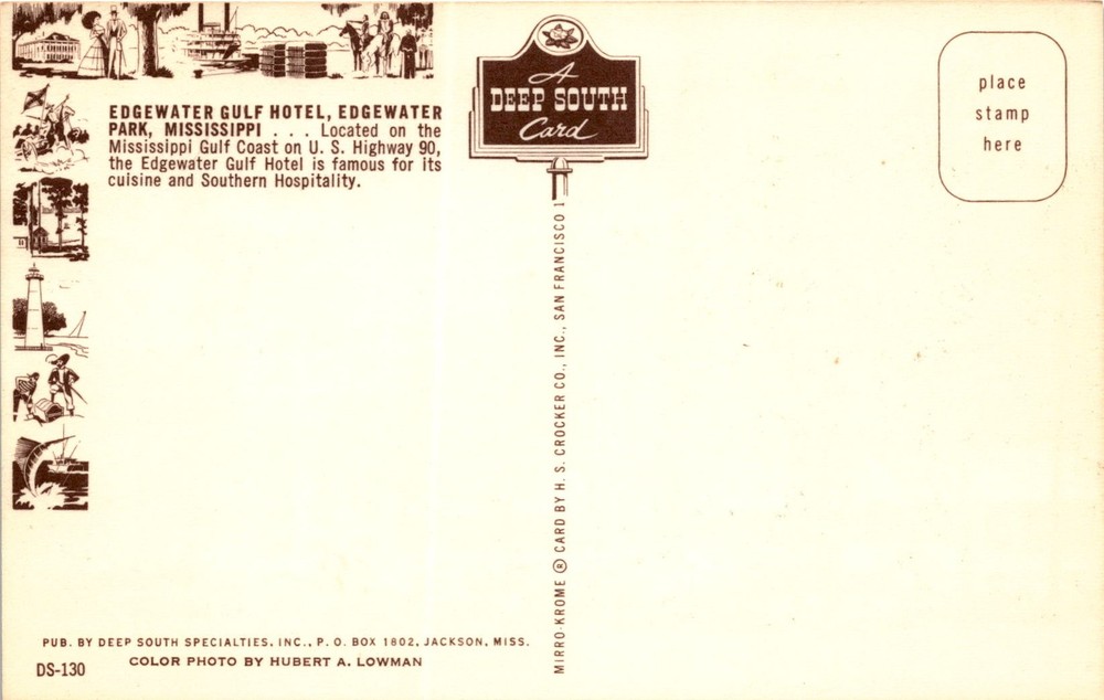 MAKE AN OFFER. THE MORE YOU BUY THE BETTER DEAL I WILL ACCEPT The postcard features the Edgewater Gulf Hotel in Edgewater Park, Mississippi. The hotel is located on the Mississippi Gulf Coast along U.S. Highway 90 and is known for its cuisine and Southern hospitality. The postcard was published by Deep South Specialties, Inc. and features a color photo by Hubert A. Lowman.