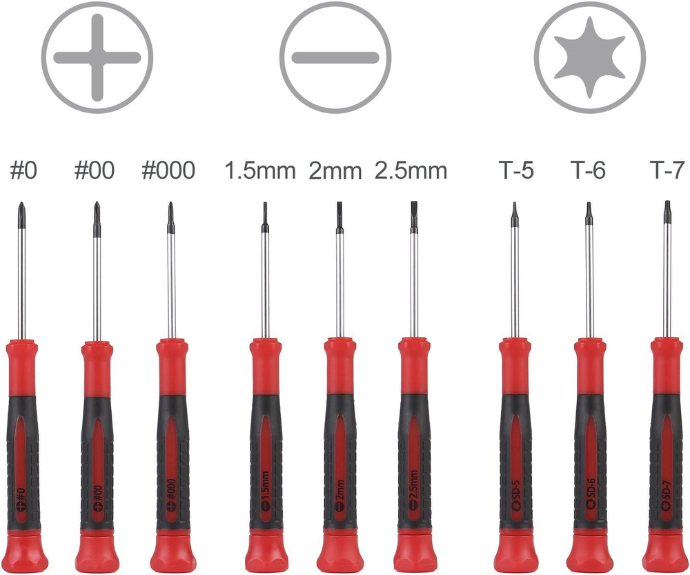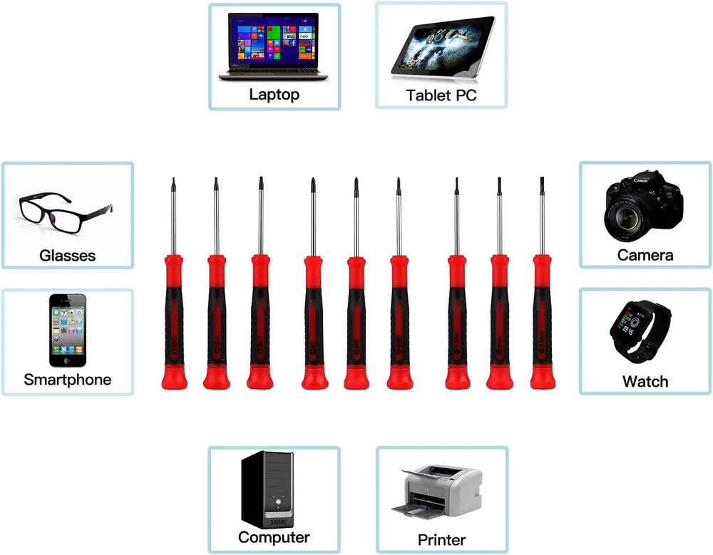 Store New Arrivals Add to Favorite View Feedback Contact EFFICERE 9-Piece Precision Screwdriver Set | Phillips #0, #00, #000 | Flat 1.5Mm, 2.0Mm, 2.5Mm | Torx T5, T6, T7 | Durable Chrome Vanadium Steel Shaft, Magnetic Tip, Ergonomic Grip, and Swivel End Cap Description Item model number 13 Part Number SD-002 Style Durable Number of Items 9 Item Package Quantity 1 Color Red, Silver, Black Special Feature Durable,Rust Resistant Brand EFFICERE Material Chrome Vanadium Steel Batteries Required? No Item Weight 5.6 ounces Head Style Flat, Phillips, Swivel, Torx Head Size #0, #00, #000, 1.5mm, 2.0mm, 2.5mm, T5, T6, T7 Recommended Uses For Product Electronics Item, Eyewear Batteries Included? No Special Features Durable,Rust Resistant Manufacturer UPHILL MERCHANDISE LLC Is Discontinued By Manufacturer No Package Dimensions 6.77 x 5.87 x 0.87 inches Size 9-Pc. Precision Screwdriver High strength chrome vanadium steel shafts reduce wear-outs and stripping for longer tool life Corrosion and rust resistant chrome plating finish provides durability and longevity Precisely machined and magnetized tips for easy holding fasteners to start screwing and also prevent fasteners dropping after unscrewing Swivel end cap allows constant finger pressure while driving and non-slip rubber handle grips for maximum turning power Set includes total 9 pieces mini screwdrivers: (3) Phillips #0, #00, #000; (3) Slotted 1.5mm, 2.0mm, 2.5mm; (3) Torx Star T-5, T-6, T-7 EFFICERE 9-Piece Precision Screw Drivers Set contains a versatile selection of the most commonly used sizes, in Phillips, Flat and Torx (Star). It is the perfect choice for your daily electronics device repairs, including smart cell phones (fits smartphones Apple iPhone 6 6S 7 7S 8 8S Plus X and Samsung note galaxy S5 S6 S7 S8), tablets such as iPad Air, laptops, Mac, Macbook Pro, desktops, computers, cameras, printers, thermostats, game stations, wii, watches, even eyeglasses, jewelry, guitar and a lot more. Constructed from premium chrome vanadium steel with a corrosion-resistant chrome plated finish, these screwdrivers are built to last. All the tips and heads are precisely milled through CNC machine for accurate size that fits exact fastener. Tips are also magnetic and prevent dropped fasteners during installation and removal. Comfortable rubber handles provide a non-slip grip during use. Swivel end caps allow for constant finger pressure while driving. They meet or exceed ANSI standards. Kit includes 3 pc. Phillips sizes #0, #00, #000; 3 pc. Slotted sizes 1.5mm, 2.0mm, 2.5mm; and 3 pc. Torx sizes T5, T6, T7. ABOUT US We offer the best prices around on high quality products. Our E-store includes media such as books, movies, music and games while offering electronics, toys, sporting apparel, clothing, tools, general home, garden items and more. SHIPPING We are always working hard to ensure your package arrives as soon as possible. Please understand that some factors like weather, high postal traffic, and the performance of shipping companies are outside of our control. We offer free shipping to the lower 48 states and ship within 2 business days of payment, usually sooner. We do not accept P.O. Boxes. Please provide a physical address. RETURNS We offer a 30-Day Return Policy on items which you are not completely satisfied with. You have the option for a full-refund or an exchange of the item. No returns are available on items shipped outside of the USA. PAYMENT We accept PayPal. CONTACT US This page content is yet to come Please ad us to your favorite seller and visit again later Thank You CUSTOMER SATISFACTION We try our very best to make sure every customer is completely satisfied. If there's a problem, message us! We're happy to help.