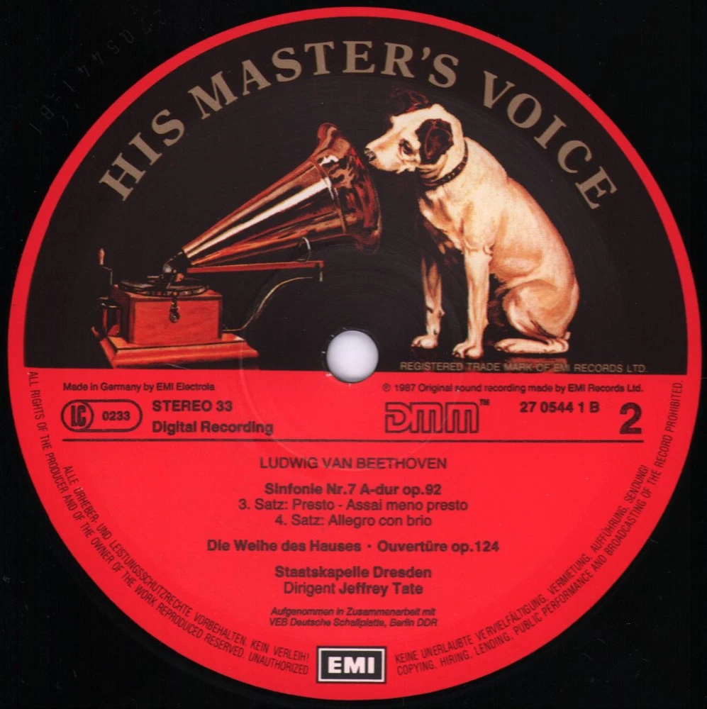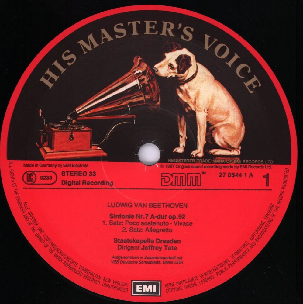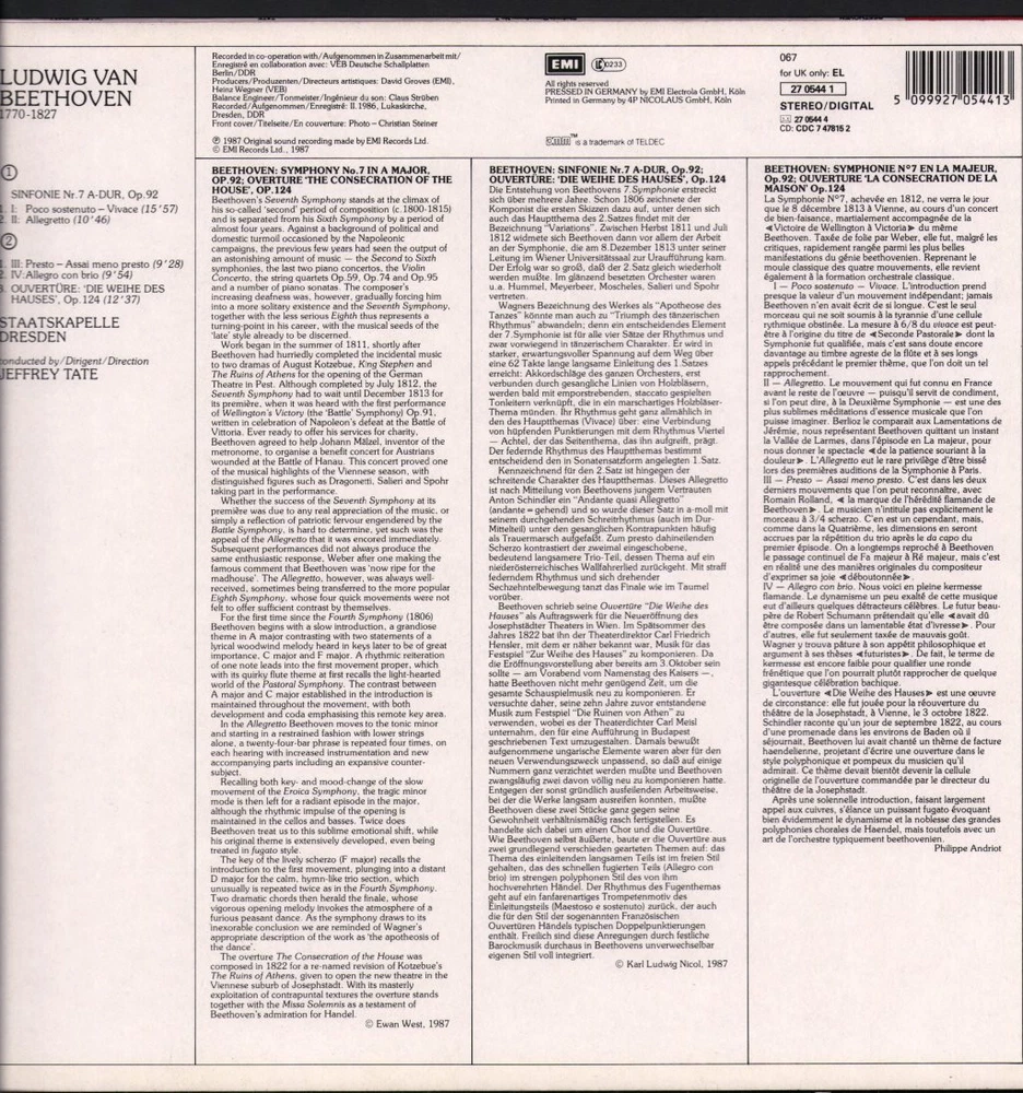 GRADING Our Grading System The table below is an overview of how our grading system works. The first grade is for the sleeve and second grade is for the media/disc, e.g. VG+/EX means that the item's sleeve is in Very Good Plus condition and the media/disc is in Excellent condition. If there is only one condition, e.g. /EX, it means that the item is not in a picture sleeve and that the media/disc is in excellent condition. Records that aren't in picture sleeves will either be in a company sleeve or a generic plain sleeve. If you have any questions, please get in touch. Condition Sleeve Media MINT (10/10) Mint, perfect Mint, perfect EX+ (9/10) Excellent plus, near mint Excellent plus, near perfect EX (8/10) Excellent, well looked after, clean, only slight signs of use Excellent, well looked after, clean, only slight signs of use EX- (7/10) Excellent minus, light wear and signs of use Excellent minus, light wear and signs of use VG+ (6/10) Very good plus, some moderate wear Very good plus, some scuffs, no deep marks VG (5/10) Very good, well used and worn Very good, well used and marked VG- (4/10) Very good minus, very worn Very good minus, very worn and marked GOOD (3/10) Good, some major wear Good, some major wear and scuffing FAIR (2/10) Fair, major wear Fair, major wear and scuffing POOR (1/10) Poor, severe wear Poor, severe wear and scuffing DELIVERY Combined Postage If you add all the items you wish to purchase from us to your shopping basket/cart, and then go to the checkout page from the shopping basket page, the shipping cost will be automatically combined. Packaging All of our items are parcelled using strong specially designed packaging, each vinyl in an order is placed in a clear plastic sleeve and plain paper white sleeve, and is separated from its cover (unless it is advertised as sealed), to prevent any damage during transit. If an item is sealed, and you would prefer the vinyl to be placed outside of its sleeve before dispatch, please let us know. Prices You can see all delivery options and prices for an item on the "Postage and payments" tab. Tracked delivery If you wish to have a tracking number with your order, please select the "Signed" or "Express" delivery option, "Standard" delivery does not include a tracking number. SHOP Click here to view our Ebay shop, with over 200,000 items in stock FAQ Does a used item include the original inner sleeve/insert/poster etc.? We will always include in the description if a used item includes any additional parts, e.g. "with inner" or "includes poster", if you know an item originally came with any additional parts, such as a printed inner sleeve, and it isn't mentioned in the description, then generally the used item won't include it, but please feel free to ask. New items will always be complete, unless otherwise specified. CATEGORIES Shop Home 10" Vinyl Records 12" Vinyl Records 7" Vinyl Records Cassettes (Tape) CDs (Compact Discs) LP Vinyl Records Music Memorabilia Other Artist Jeffrey Tate / Staatskapelle Dresden Title Beethoven - Sinfonie Nr. 7 / Ouvertüre: Die Weihe Des Hauses Format LP Vinyl Country Europe Label His Master's Voice Catalogue Number EL2705441 Year 1987 Description 5 track stereo Condition (Sleeve/Disc) EX-/EX Track List Sinfonie Nr. 7 A-Dur, Op. 92 - A1. I: Poco Sostenuto - Vivace (15:57) - A2. II: Allegretto (10:46) - B1. III: Presto (9:28) - B2. IV: Allegro Con Brio (9:54) B3. Ouvertüre: 'Die Weihe Des Hauses', Op. 124 (12:37) DELIVERY INFORMATION If you wish to have a tracking number with your order, please choose the Signed or Express delivery option, the Standard delivery option does not include a tracking number. Please note, the Express option for delivery outside of the UK includes a tracking number, but has the same delivery time as the Standard option. WE HAVE MORE JEFFREY TATE / STAATSKAPELLE DRESDEN ITEMS IN STOCK We have more items in stock by this artist, click here to see them. ABOUT US Vinyl Tap has been in the business of selling music for over 30 years, and in that period we have supplied many thousands of collectors and music fans around the globe with vinyl, CDs and music memorabilia. You can check out the over 200,000 items that we have in stock on our Ebay shop, here . Artist: Jeffrey Tate / Staatskapelle Dresden - Title: Beethoven - Sinfonie Nr. 7 / Ouvertüre: Die Weihe Des Hauses - Format: LP Vinyl - Country: Europe - Label: His Master's Voice - Catalogue Number: EL2705441 - Year: 1987 - Description: 5 track stereo
