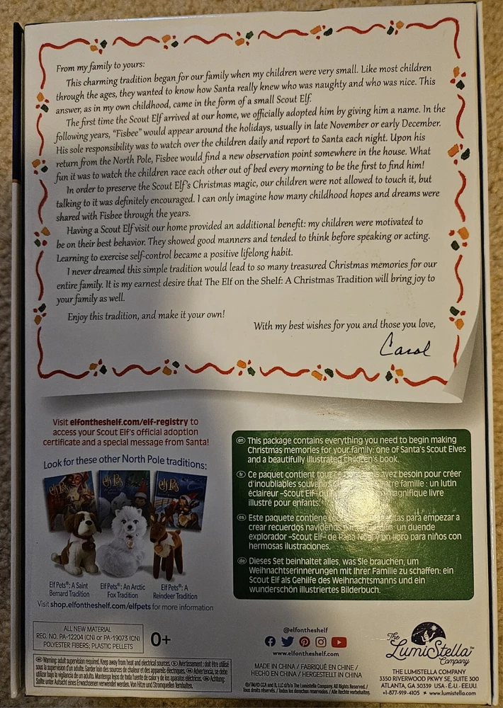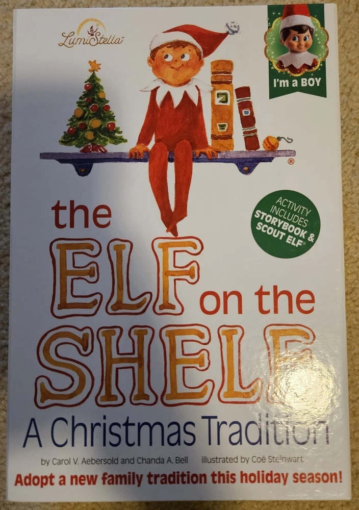 This beloved family tradition has captured the hearts of children everywhere who embrace the magic of having a Scout Elf® mascot who reports to Santa each night during the holidays. This boxed set has everything needed to make lasting Christmas memories! Includes: Adoptable elf in red hat with white trim and solid red suit with white collar. The Elf on the Shelf® Tradition: A Christmas Tradition storybook in English. Keepsake box. Official adoption certificate. Access adoption certificate on website. The items are new with some scuffs on boxes from shipping and handling.
