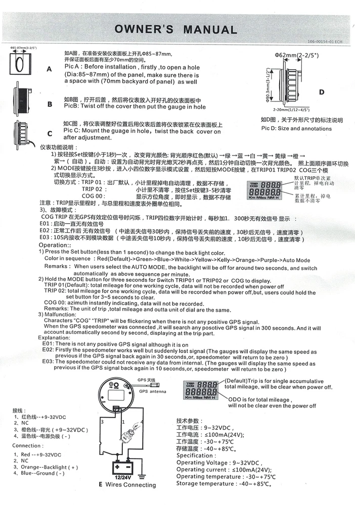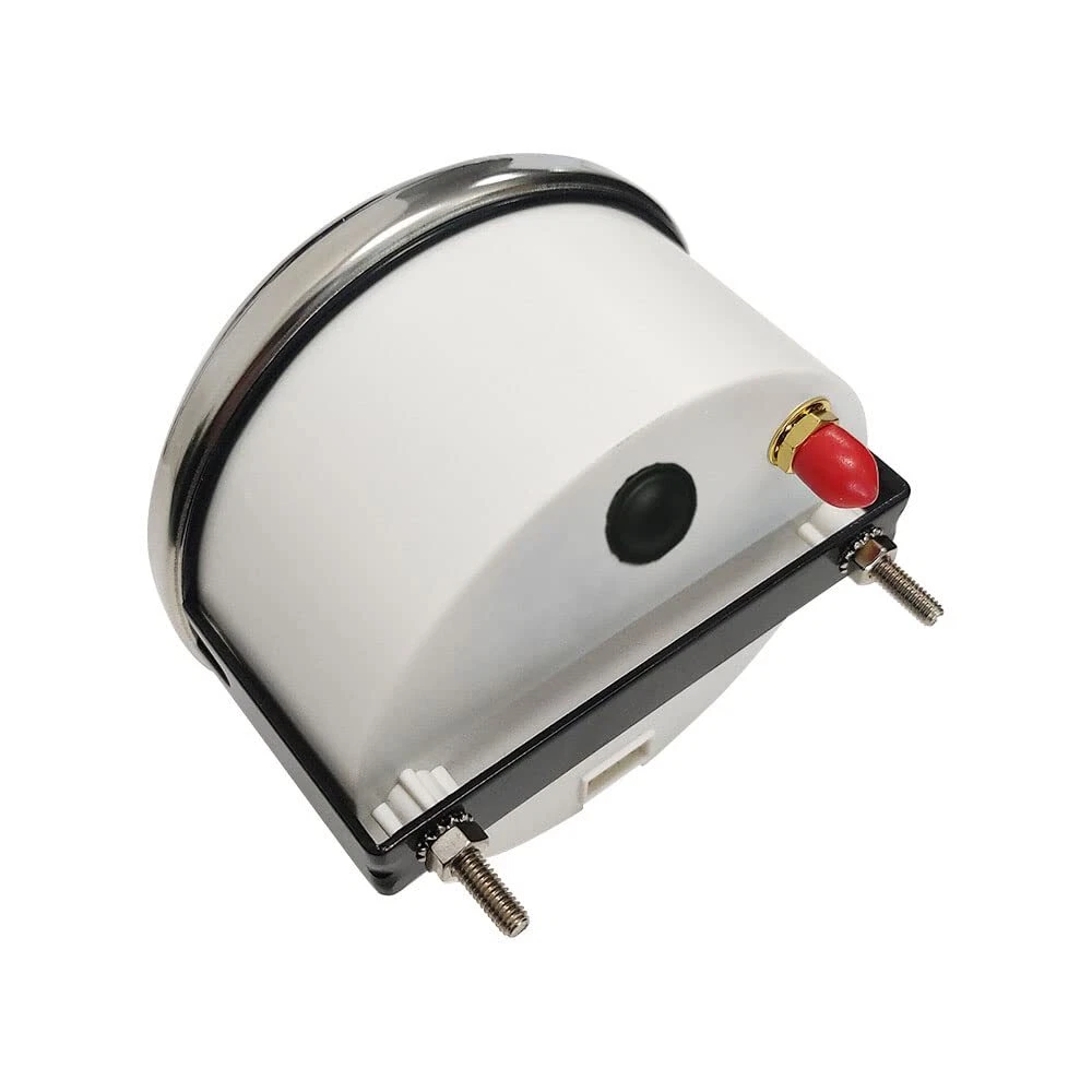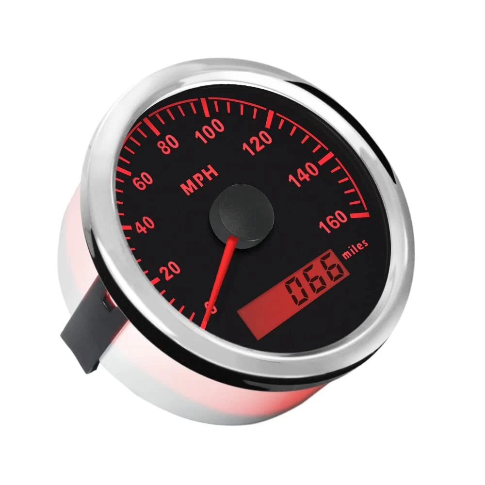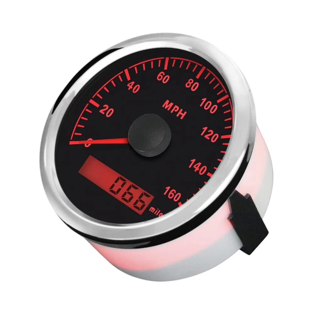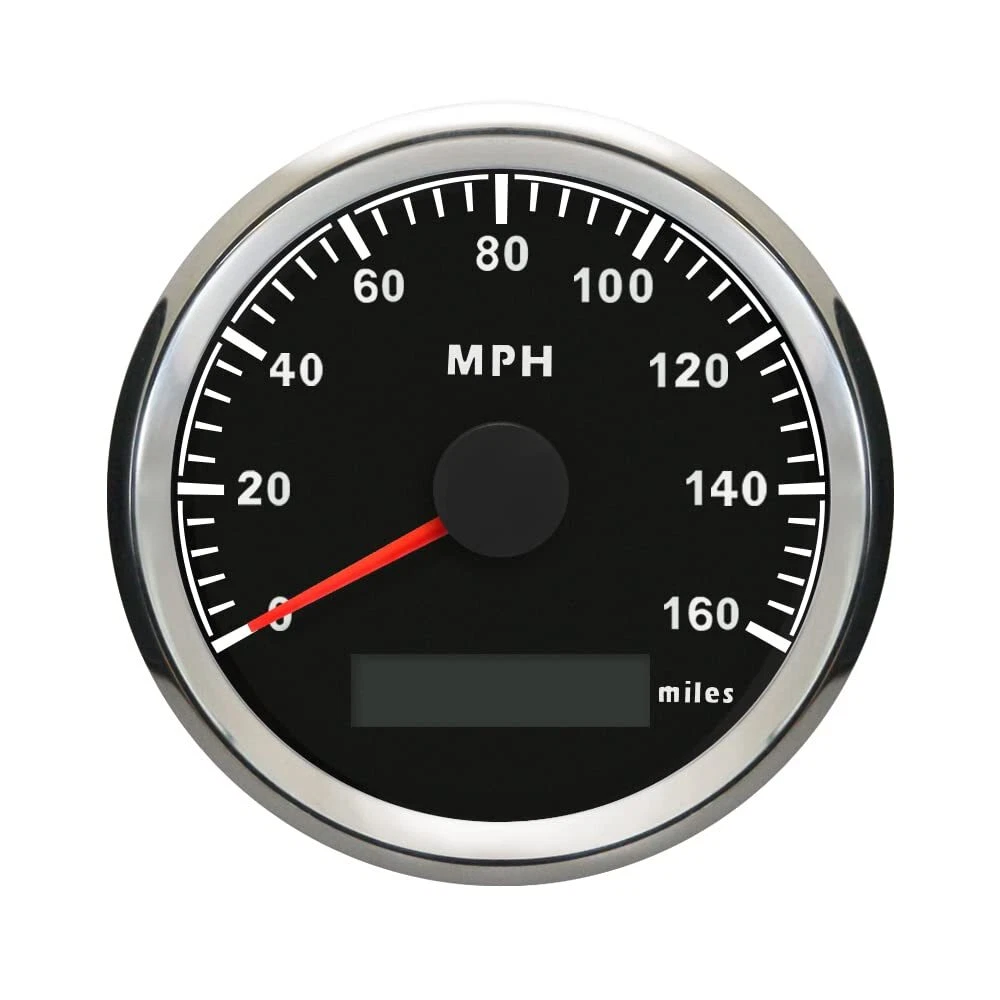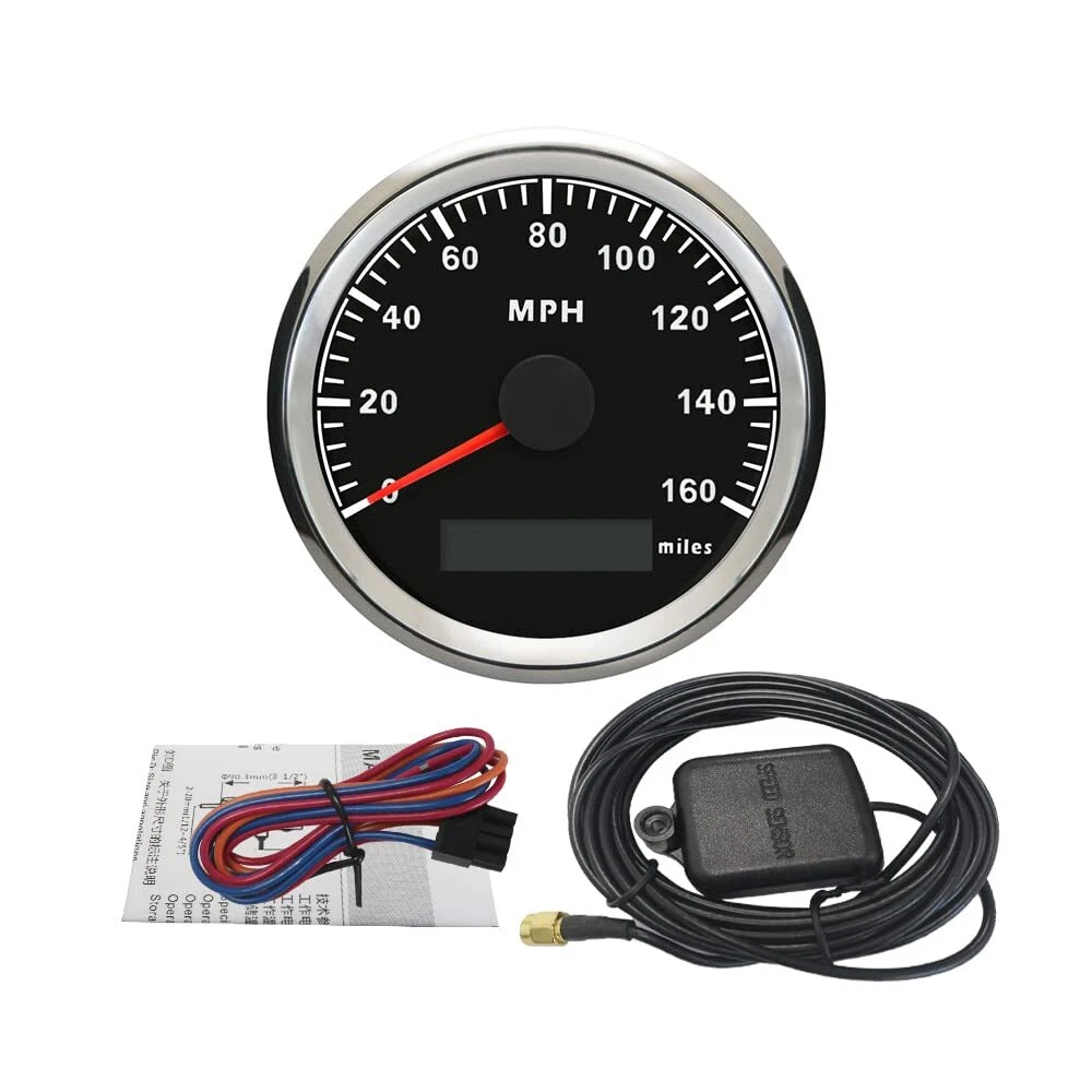 Product Features: -Suitable for all vehicles, boats and off-road vehicles -The signal comes directly from the satellite signal receiver(GPS Speed Sensor) -The gauge has the advantages of high precision, quick location confirmation and short start up time. -IP67 waterproof and dustproof grade -Stepper motors used for full range of stepping gauges, great feature with its less power consumption, longer life, higher precision, etc. -With curved glass (with anti-fogging function) -With ultra-wide working voltage design( long-term operating voltage: 9-32V, Maximum up to: 36V (≤ 1 min)). Technical Data: -Fixing dimension: 85mm(3-3/8") -Indicating Range: 0-160MPH -Faceplate Color: black with Stainless Steel. If you need Black, pls. search for B074J8SG86 (BN) and B074J9MFQV (WS)-Working Voltage: 9-32VDC(12VDC/24VDC) -Backlight: Red -Functions: current speed and total mileage(it's just odometer, not trip meter, cannot be reset) -Connection: Blue wire--Negative/Ground, Red wire--Positive, Orange wire--Positive(lighting wire)-This GPS Speedometer is complete unit, can work directly with gps sensor together, not need other sensor cables. Sensor can be mounted at any position, on or under the dashboard. -After connection, it takes about 30 seconds to get signal in the first time, but less than 3 seconds after that. It gets quicker under a clear view of the sky. Sometimes if signal is missing, pls. reconnect all wires and restart it.-Operation mode: LCD display, stepper motor Package Includes: 1x GPS speedometer 1x GPS Speed Sensor 1x Multi-plug socket 1x Installation Instruction Cut an 85mm (3 3/8") hole in the panel and allow a clearance of 70mm (2 3/4”) behind the panel to fit the gauge. Put the gauge in the hole. Using M4 nut and C type bracket to seal up the gauge. For the GPS antenna, you should securely fasten it in the flat position, black side upwards, preferably outside (or inside front windscreen) so that it has a clear view of the sky to pick up satellite signal. Connect the antenna cable to socket in the back of the gauge. And do not cut cable. It takes about 30 seconds to get signal in the first time, but less than 3 seconds after that. It gets quicker under a clear view of the sky. Sometimes if signal is missing, pls. reconnect all wires and restart it. It shows current speed and odometer(cannot be reset), no trip meter. If you also need trip meter, pls. search for ASIN B07KPHDFDB, B07KPHC1ML or B07KPG7XT3 9-32VDC(12VDC/24VDC) Working Voltage, Red Backlight