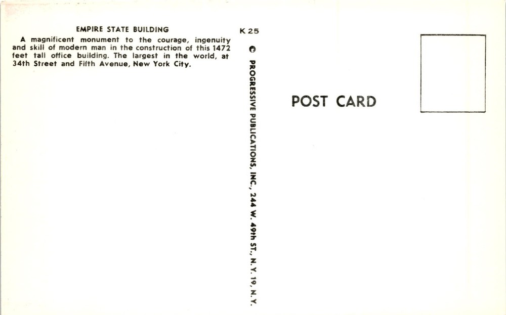 MAKE AN OFFER. THE MORE YOU BUY THE BETTER DEAL I WILL ACCEPT The postcard features an image of the Empire State Building, a famous skyscraper located at 34th Street and Fifth Avenue in New York City. The building stands at a height of 1472 feet, making it the tallest office building in the world. It is considered a magnificent monument that showcases the courage, ingenuity, and skill of modern construction.