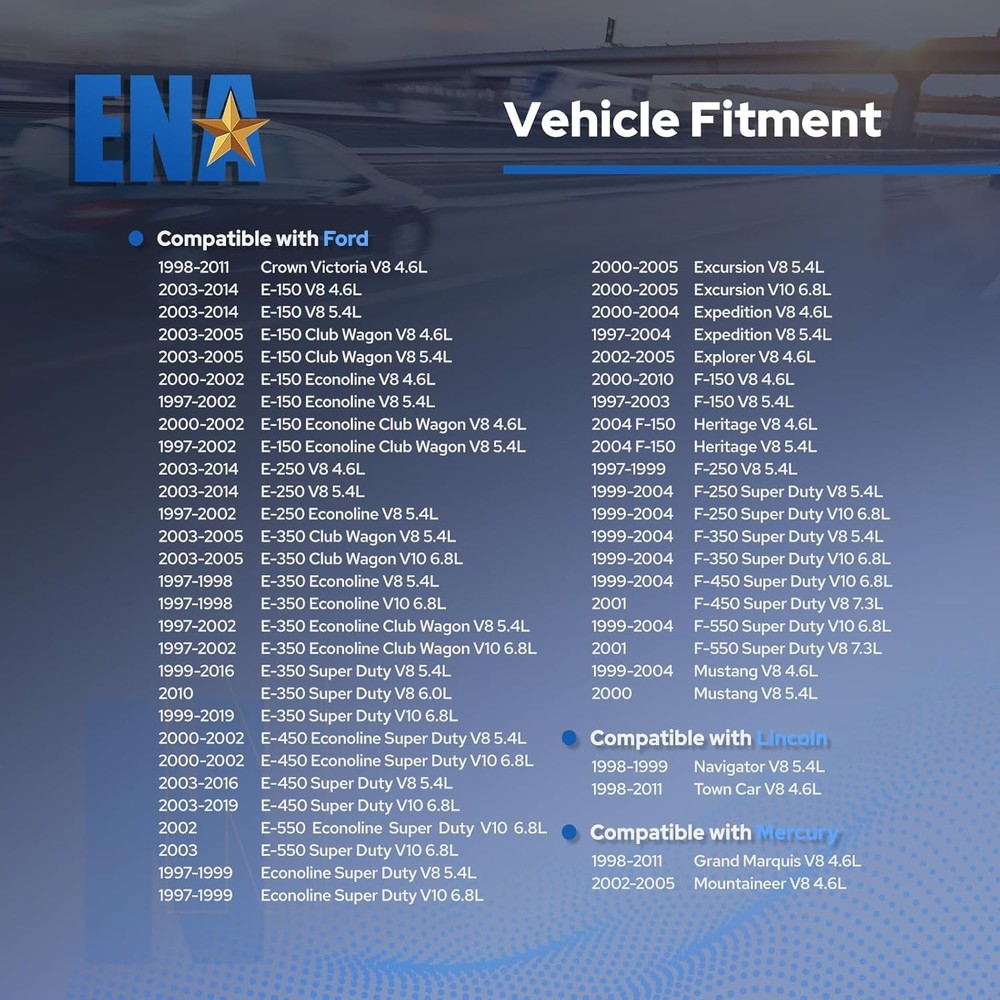 ENA Set of 8 Curved Boot Ignition Coil Pack Compatible with Ford Lincoln Mercury 4.6L 5.4L V8 Replacement for DG508 C1454 C1417 FD503 1L2U12029AA I2LU-12A388-AA C1417 DG473 DG481 DG491 About this item Ignition Coils are engineered for original equipment and replacement applications; Every component either matches or improves on the OE design to ensure fast and easy installation with superior performance and reliability Lifetime Warranty - Please use enter your vehicle in your Amazon Garage above to see if this part is compatible with your vehicle Designed and manufactured to operate reliably under all operating conditions and throughout the entire engine speed range for peak engine performance ENA products are designed to meet or exceed OE specifications in form, fit and function › See more product details #8,006 in Automotive ( See Top 100 in Automotive ) #5 in Automotive Replacement Ignition Coils Shipping Welcome to our store! We are based in the United States. We offer fast and free shipping on all products within the contiguous 48 states. However, customers in Puerto Rico, Alaska, Hawaii, and other US territories must contact us prior to purchasing to confirm if we can ship to their location. For international orders, we use eBay’s Global Shipping Program. Return Returns are accepted if reported within seven (7) days and the items are in their original packaging and unused condition. Failure to meet these conditions may result in the return claim being rejected or the application of restocking fees. Payment We accept payments through PayPal and all major credit cards. Please visit our eBay store to check out other items for sale! Thank you for shopping at our store.