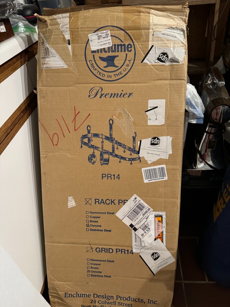 Made by hand in the USA. Enclume is French for "anvil". Don't put made in China junk in your Made in the USA kitchen! You've spent so much getting that kitchen perfect. Cap it off with the best made in the USA CHROME pot hanger no longer available. Note: Quoted shipping rates are for lower 48 states only. All others please message me for rates to your area prior to bidding. Item is long (41in. and has some weight to it. Please note shipping charges prior to bidding. Thanks Please check out my other listing for more items of interest. Keep your kitchen organized with this top-of-the-line pot rack from Enclume. Crafted from high-quality metal, this oval-shaped rack is perfect for contemporary kitchens and can hold a variety of cookware. Measuring 41.5 inches in length, it's large enough to store all your pots and pans while keeping them easily accessible. Whether you're a home cook or a professional chef, this pot rack is a must-have for any kitchen. Hang it from the ceiling to save space and keep your cookware in pristine condition. With its heavy chrome finish and sleek design, it's sure to impress your guests and make cooking a breeze. Note: They discontinued the chrome PR14 offering (they still offer hammered and stainless steel). Probably too expensive to produce (and polish). Bought a few years ago and brought to every country we were based at, but could never move into a house with a kitchen ceiling to handle the weight. This thing has been to New Zealand (twice!), Australia, the Philippines, Taiwan, Hong Kong, San Francisco. Time for it to pay it's travelling fees, lol. You'll be hard pressed to find a brand new unused chrome PR-14. It's night and day to the stainless steel version. Once again, this is a brand new with (well travelled) open box item. It's travel alone will be a conversation piece for years to come. Not to mention the discontinued rarity of it. Priced based on rarity. That and the fact that someone out there knows what quality is. This is the Rolls Royce of pot racks. Everything else is Toyota. Please check out my other auctions for more items that may interest you. Thanks