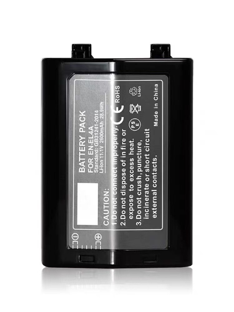 Battery Description Item model number:EN-EL4A Battery Type : Li-ion Battery Capacity : 28.9Wh/2600mAh Battery Voltage: 11.1V Battery Cell Composition:Lithium Ion Product Dimensions:3.27 x 2.19 x 1.06 inches Compatible Camera Models:For Nikon D2Z D2H D2Hs D2X D2Xs D3 D3S D3X F6 EN-EL4 ENEL4 ENEL4A Package: 1 Pack EN-EL4A Battery