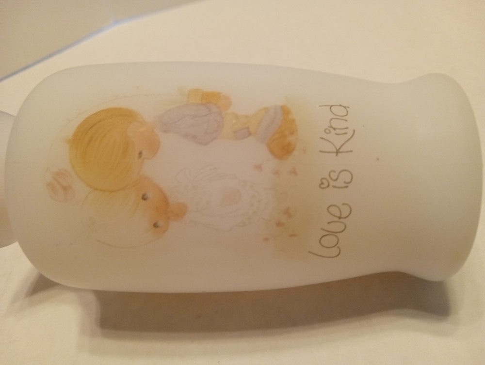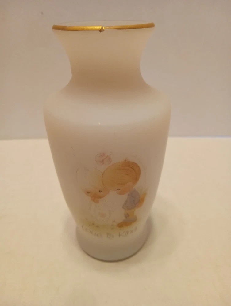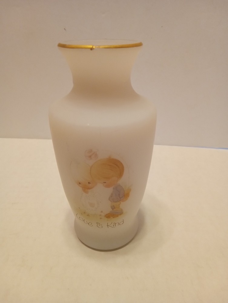 The ENESCO JONATHAN & DAVID 1970s LOVE IS KIND PRECIOUS MOMENTS 4.5" Mini BUD VASE is a small round vase made of frosted white glass, featuring a vintage 1970s style. This decorative collectible from the Precious Moments brand is perfect for all occasions and can be enjoyed by teens, boys, adults, kids, and even toddlers. Its original design and small size make it a charming addition to any home decor setting.