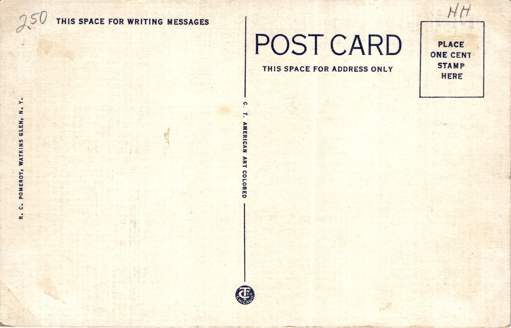 This postcard features an image of the entrance to the amphitheater at Watkins Glen, New York. Watkins Glen is a village located in Schuyler County, known for its scenic beauty and outdoor recreation opportunities. The Watkins Glen State Park is a popular attraction, featuring a stunning gorge with waterfalls, cliffs, and hiking trails.