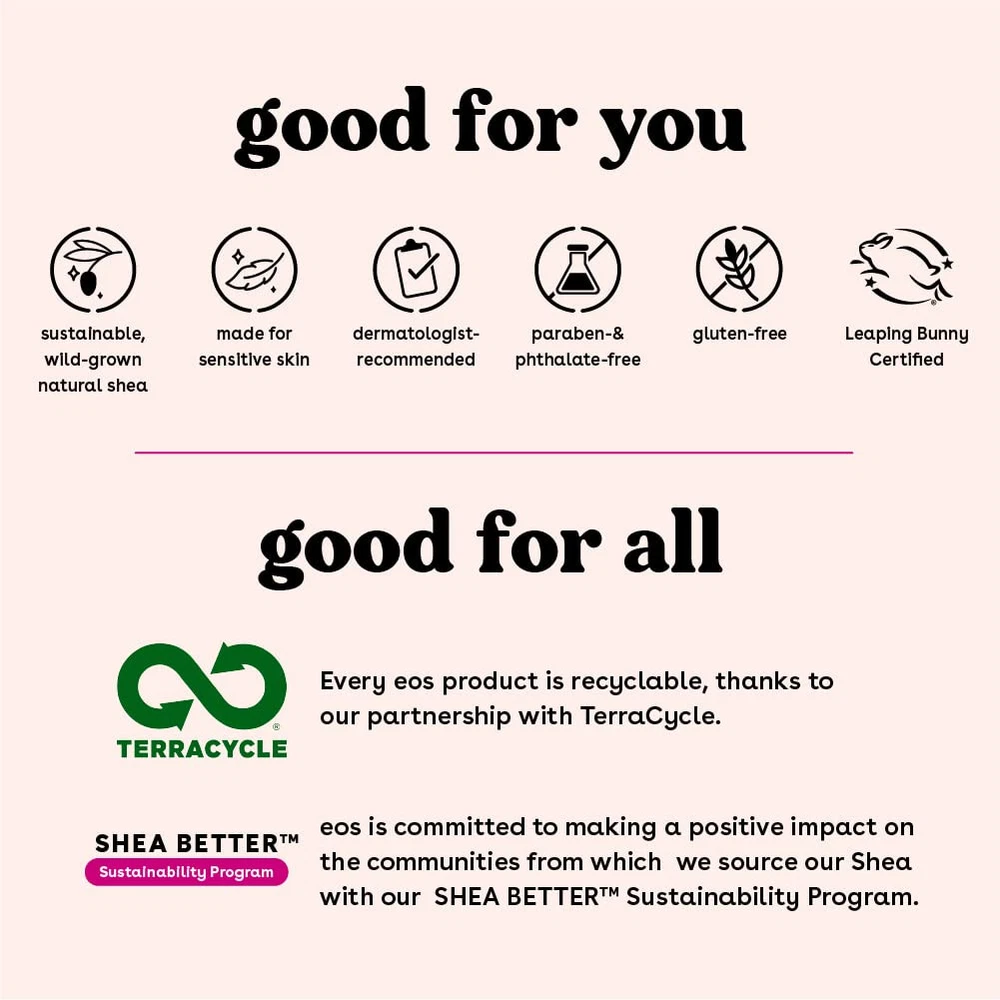 PINK LEMONADE: Pink Lemonade tastes like fresh-squeezed meyer lemonade and muddled jewel strawberries 24H MOISTURE LIP MASK: We make our eos Sunset Sips lip butter collection with sustainably-sourced shea butter, and nourishing coconut and jojoba oils for long-lasting hydration SWIPE ON: Apply this smooth and moisturizing lip butter to nourish and hydrate your lips. A delicious treat for your lips! MADE FOR SENSITIVE SKIN: Our Dermatologist-recommended lip balm is formulated for sensitive skin and hypoallergenic SUSTAINABLY-SOURCED INGREDIENTS: eos lip balms have wild grown, sustainably sourced, natural shea butter and oil to leave your lips smooth and nourished
