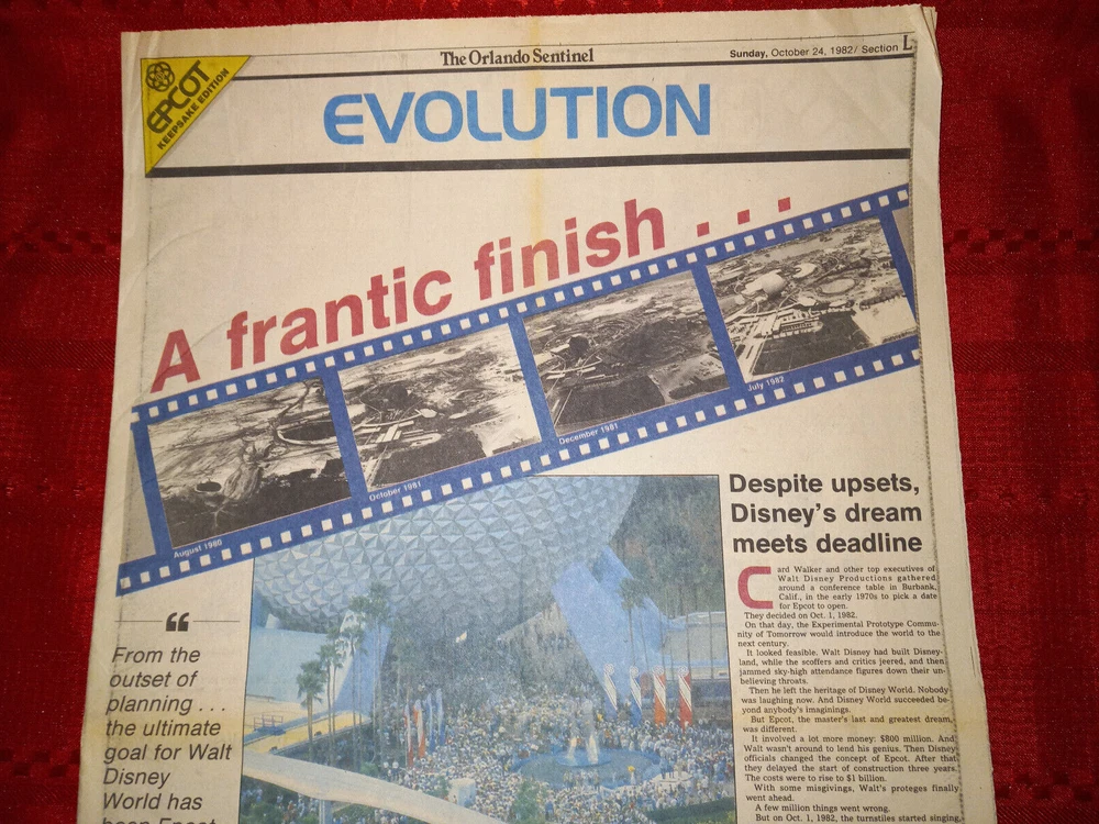 The special section of the Orlando Sentinel on the opening of EPCOT Center in Orlando Florida in 1982. The second theme park on the Orlando Property. In excellent condition. I can try to roll it and send it media mail if desired to save on shipping - which if cheaper the difference would be refunded to the buyer