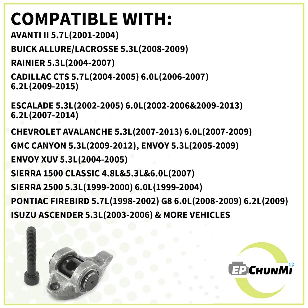 The Rocker Arms with Bolts Kit Compatible with Avanti/Buick/Cadillac/Chevrolet/GMC/Isuzu/Pontiac/Saab 4.8L 5.3L 5.7L 6.0L 6.2L Engines ,MR-1341,10214664 . Feature: 100% With High Quality According to the factory specifications. Perfectly match for your car. Reasonable Price with stable shipping Application: For 2004-2005 Cadillac CTS 5.7L For 2006-2007 Cadillac 6.0L For 2009-2015 Cadillac 6.2L For 2002-2005 Escalade 5.3L For 2002-2006/2009-2013 Escalade 6.0 L For 2007-2014 Escalade 6.2 L For 2003-2006 Escalade ESV 6.0L For 2007-2014 Escalade ESV 6.2L For 200 2 -20 06 Escalade EXT 6.0L For 2007-201 3 Escalade EXT 6. 2 L For 2008-2009 Buick Allure & Lacrosse 5.3L For 2004-2007 Buick Rainier 5.3L For 2007-201 3 Chevrolet Avalanche 5.3L For 2007-20 09 Chevrolet Avalanche 6.0L For 2002-2006 Chevrolet Avalanche 1500 5.3L For 2000-2002 Chevrolet Camaro 5.7L For 2010-2015 Chevrolet Camaro 6.2L For 2011-2017 Chevrolet Caprice 6.0L For 2009-2012 Chevrolet Colorado 5.3L For 2000-2004 Chevrolet Corvette 5.7L For 2005-2007 Chevrolet Corvette 6.0L For 200 8 -2013 Chevrolet Corvette 6.2L For 2003-2014 Chevrolet Express 1500 5.3L For 2003-2015 Chevrolet Express 2500 4.8L For 20 17 Chevrolet Express 2500 4.8L For 2003-2005 Chevrolet Express 2500 5.3L For 2003-2007/2008-2020 Chevrolet Express 2500 6.0L For 2016-2017/2004-2015 Chevrolet Express 3500 4.8L For 2008-2020/2003-2007 Chevrolet Express 3500 6.0L For 2009-2020 Chevrolet Express 4500 6.0L For 2006-2009 Chevrolet lmpala 5.3L For 2016-2018 Chevrolet LCF 3500 6.0L For 2006-2007 Chevrolet Monte Carlo 5.3L For 1999-2013 Chevrolet Silverado 1500 4.8L For 1999-2013 Chevrolet Silverado 1500 5.3L For 2007-2009/2003-2006/2009-2013 Chevrolet Silverado 1500 6.0L For 2009-2013 Chevrolet Silverado 1500 6.2L For 2007 Chevrolet Silverado 1500 Classic 4.8L For 2007 Chevrolet Silverado 1500 Classic 6.0 L For 2001-2003/2005-2006 Chevrolet Silverado 1500 HD 6.0L For 2007 Chevrolet Silverado 1500 HD Classic 6.0L For 1999-2000 Chevrolet Silverado 2500 5.3L For 1999-2004 Chevrolet Silverado 2500 6.0L For 2007-2019/2001-2006 Chevrolet Silverado 2500 HD 6.0L For 2007 Chevrolet Silverado 2500 HD Classic 6.0L For 2001-2006 Chevrolet Silverado 3500 6.0L For 2007 Chevrolet Silverado 3500 Classic 6.0L For 2007-2019 Chevrolet Silverado 3500 HD 6.0L For 2014-2017 Chevrolet SS 6.2L For 2003-2004 Chevrolet SSR 5.3L For 2005-2006 Chevrolet SSR 6.0L For 2000-2004 Chevrolet Suburban 1500 5.3L For 2007-2009/2006 Chevrolet Suburban 6.0L For 2007-2013/2000-2006 Chevrolet Suburban 2500 6.0L For 2016-2019 Chevrolet Suburban 3500 HD 6.0L For 2000-2009 Chevrolet Tahoe 4.8L For 2000-2014 Chevrolet Tahoe 5.3 L For 2008-2013 Chevrolet Tahoe 6.0L For 2008-2009 Chevrolet Tahoe 6.2L For 2006-2008 Chevrolet Trailblazer 5.3L For 2006-2009 Chevrolet Trailblazer 6.0L For 2003-2006 Trailblazer EXT 5.3L For 2009-2012 GMC Canyon 5.3L For 2005-2009 GMC Envoy 5.3L For 2003-2006 GMC Envoy XL 5.3L For 2004-2005 GMC Envoy XUV 5.3L For 2003-2014 GMC Savana 1500 5.3L For 2003-2015/2017 GMC Savana 2500 4.8L For 2003-2005 GMC Savana 2500 5.3L For 2008-2020/2003-2007 GMC Savana 2500 6.0L For 2016-2017/2004-2015 GMC Savana 3500 4.8L For 2008-2020/2003-2007 GMC Savana 3500 6.0L For 2009-2019 GMC Savana 4500 6.0L For 1999-2013 GMC Sierra 1500 4.8L For 1999-2013 GMC Sierra 1500 5.3L For 2007-2009/2001-2006/2009-2013 GMC Sierra 1500 6.0L For 2007-2013 GMC Sierra 1500 6.2L For 2007 GMC Sierra 1500 Classic 4.8L/5.3L/6.0L For 2001-2003/2005-2006 GMC Sierra 1500 HD 6.0L For 2007 GMC Sierra 1500 HD Classic 6.0L For 1999-2000 GMC Sierra 2500 5.3L For 1999-2004 GMC Sierra 2500 6.0L For 2007-2019/2001-2006 GMC Sierra 2500 HD 6.0L For 2007 GMC Sierra 2500 HD Classic 6.0L For 2001-2006 GMC Sierra 3500 6.0L For 2007 GMC Sierra 3500 6.0L For 2007-2019 GMC Sierra 3500 HD 6.0L For 2000-2009 GMC Yukon 4.8L For 2000-2014 GMC Yukon 5.3L For 2001-2006/2008-2013 GMC Yukon 6.0L For 2007-2014 GMC Yukon 6.2L For 2000-2014 GMC Yukon XL 1500 5.3L For 2007-2009/2001-2006 GMC Yukon XL 1500 6.0L For 2007-2014 GMC Yukon XL 1500 6.2L For 2007-2013 GMC Yukon XL 2500 6.0L For 2001-2004 Avanti II 5.7L For 2005-2009 Saab 9-7X 5.3L For 2008-2009 Saab 9-7X 6.0L For 2003-2006 Isuzu Ascender 5.3L For 1998-2002 Pontiac Firebird 5.7L For 2008-2009 Pontiac G8 6.0L For 2009 Pontiac G8 6.2L For 2005-2008 Pontiac Grand Prix 5.3L For 2004 Pontiac GTO 5.7L For 2005-2006 Pontiac GTO 6.0L Package included: 1 x Rocker Arm & 1 x Bolt Notes: Please double-confirm the OEM and compatibility before purchasing. We strongly recommend professional installation.