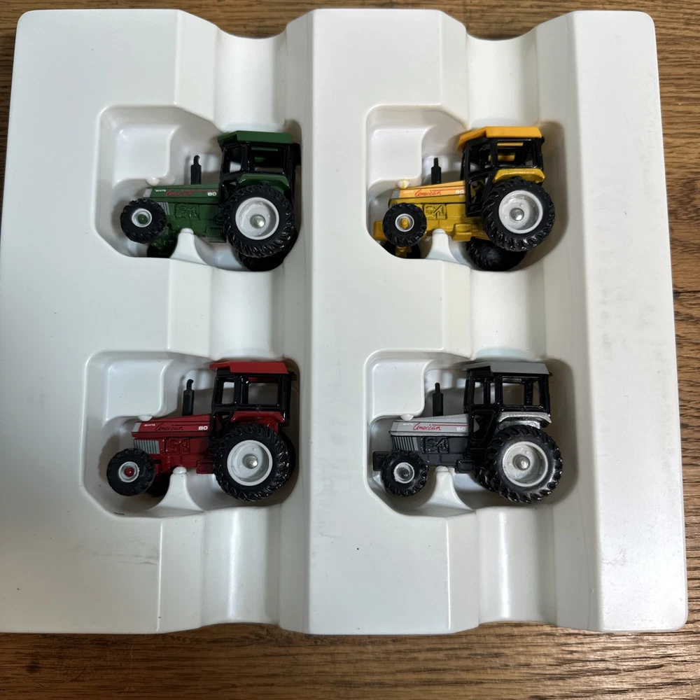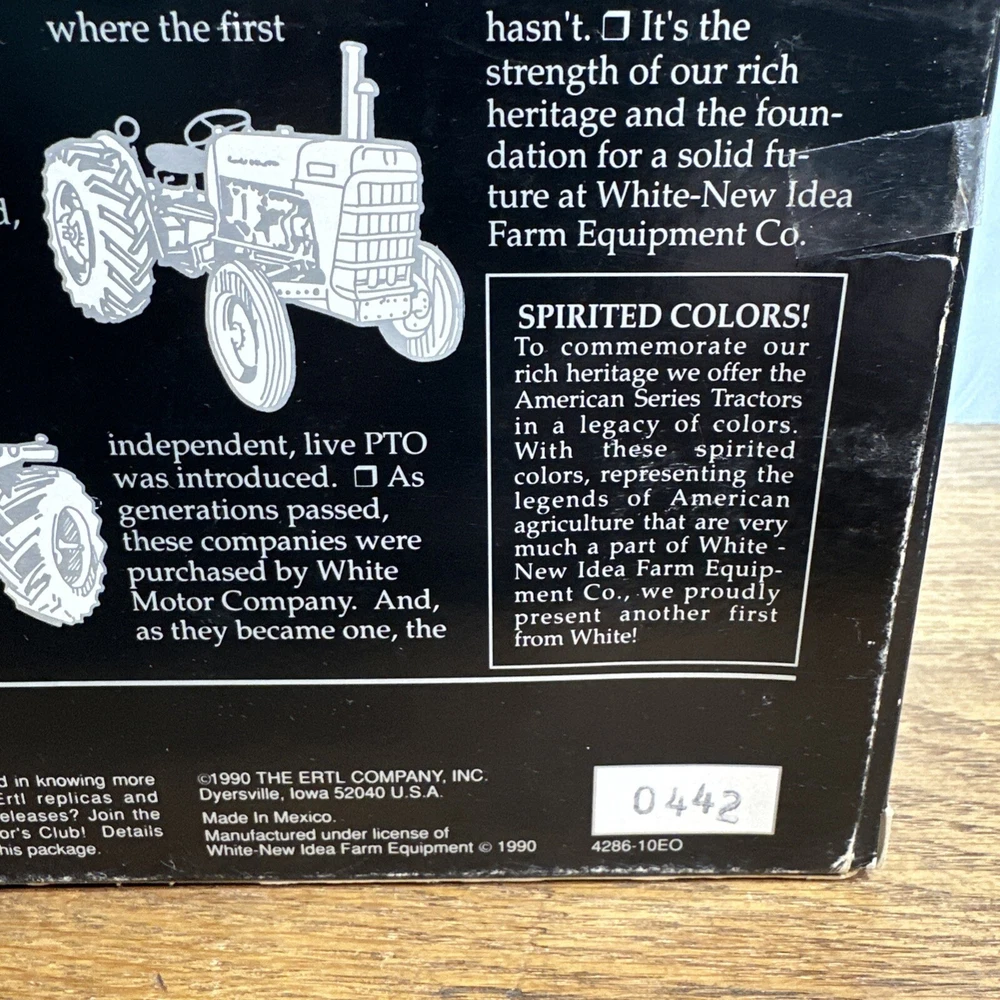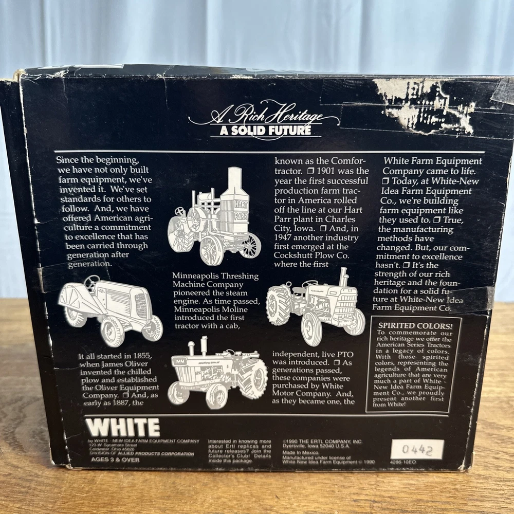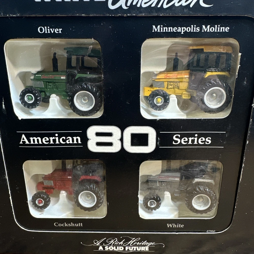 The ERTL 1/64 White American 80 Series toy tractors were released in 1990 as part of the White American Series. These vintage toys are age-appropriate for collectors aged 8 years and up and were manufactured in Mexico. The set includes models from Minneapolis Moline, Cockshutt, Oliver, and White brands, making it a desirable addition for vintage toy enthusiasts. Comes in original box. Pre-owned condition. Box has some damage. See photos.