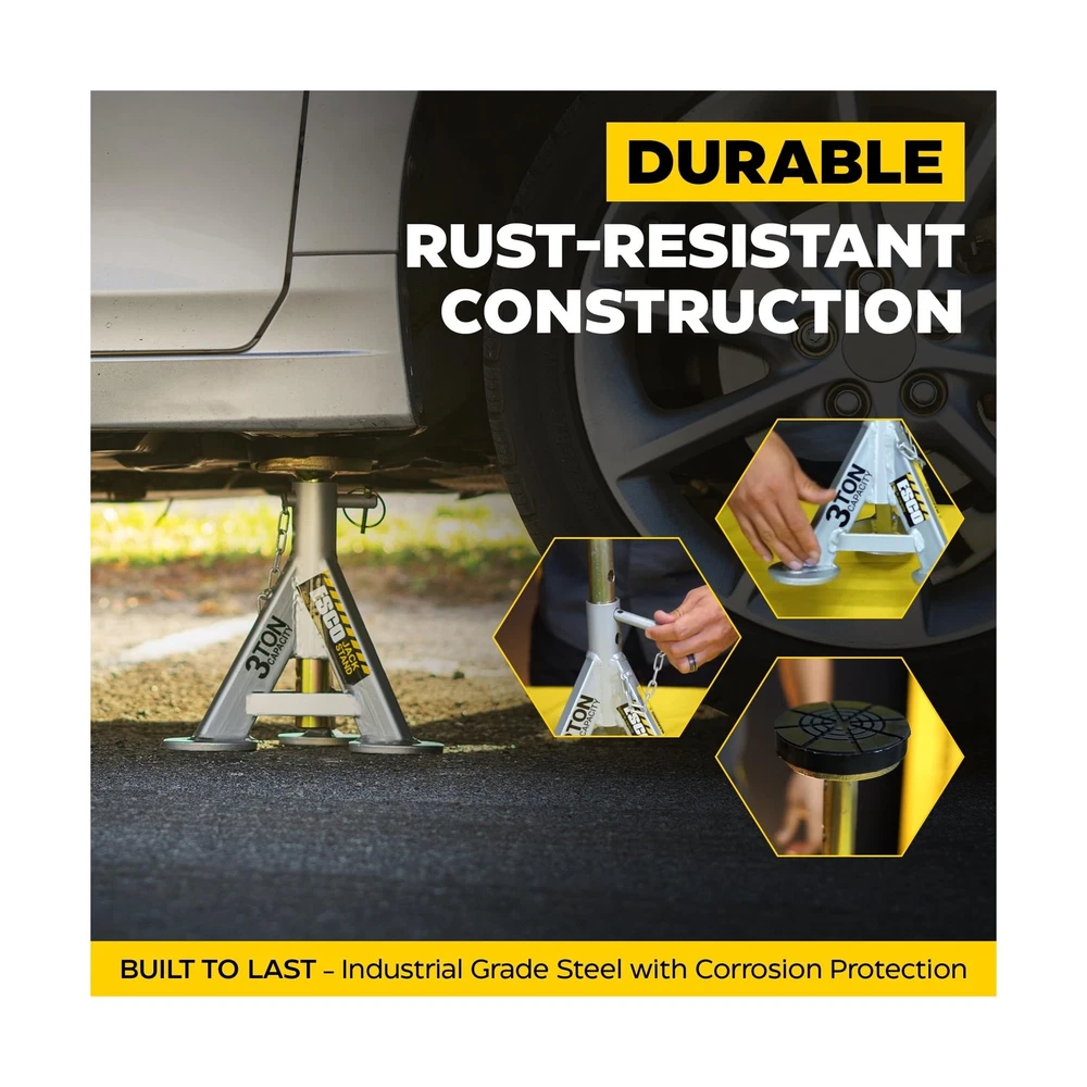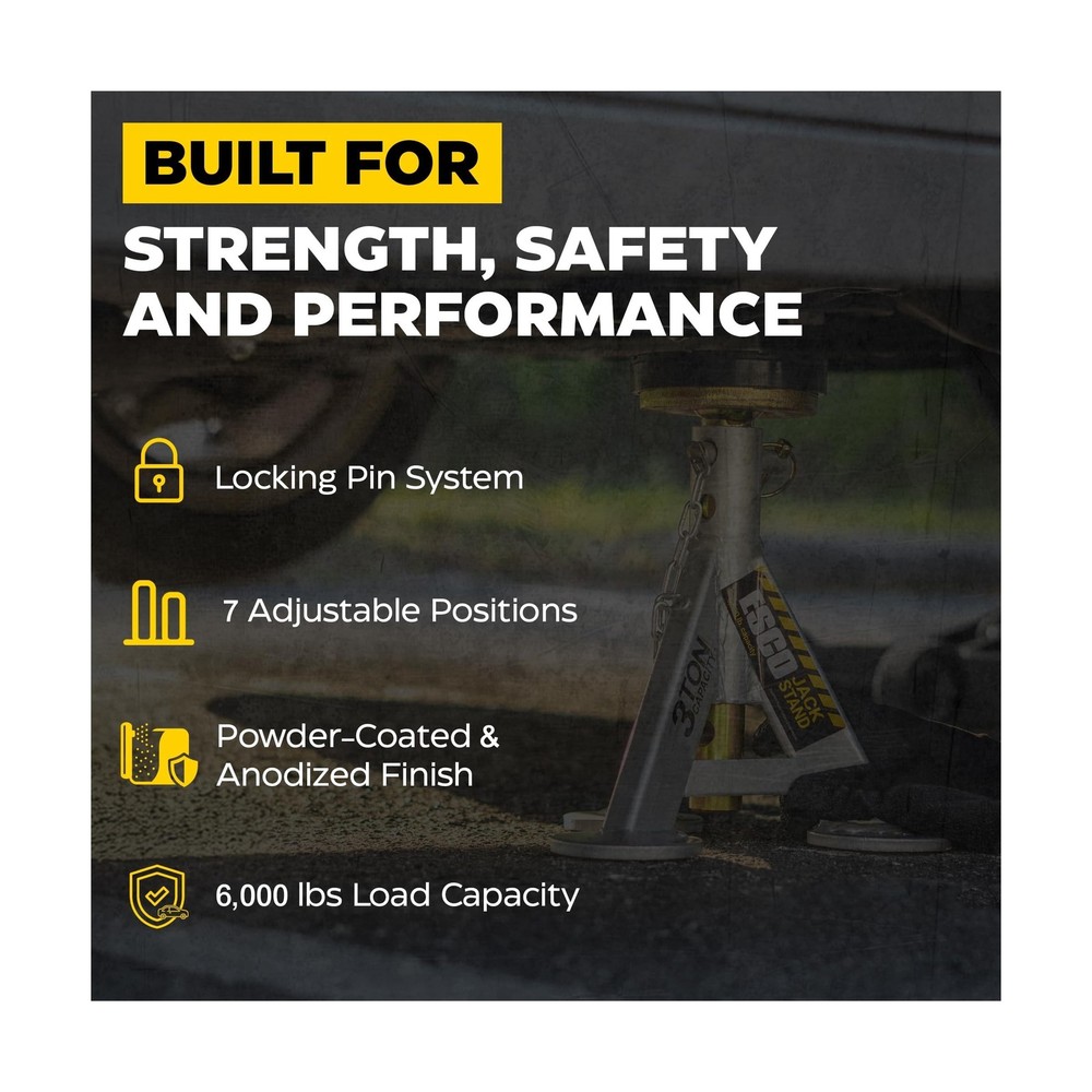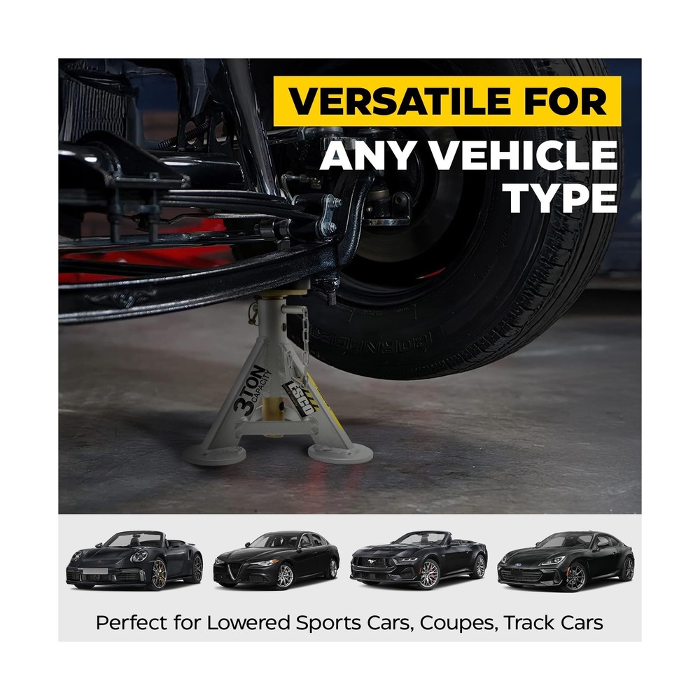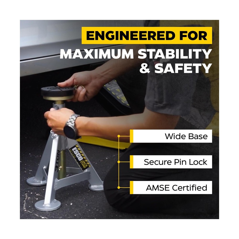 ESCO 3 Ton Performance Shorty Low Profile Jack Stands, 1 Pair Description The ESCO 3 Ton Performance Shorty Jack Stands, 1 Pair (Model 10499) is designed for the automotive professional with incredible quality and durability. These short low height professional grade jack stands are perfect for the garage or shop. Includes 2 jack stands with rubber top posts offering exceptional grip and support. Uniquely designed removable flat top rubber saddle protects the car frame better than the traditional curved axle post jacks stands. Each stand provides 7 adjustable height settings providing the exact support height needed for the job. Quickly and safely lock the position with the included locking pin. Tested to ASME standards by A2LA Certified Testing Facility. Features: 7 adjustable height positions Anodized post and powder coated base to prevent rusting and corrosion 6,000 lb. capacity per stand, includes 2 stands Minimum height 11 in., Maximum height 17 in. Base dimensions 9.5 x 9.5 in. Tested to ASME standards by A2LA Certified Testing Facility Product Details: Load Capacity: 3 Tons Maximum Lifting Height: 17 Inches Brand: ESCO Color: Grey Item dimensions L x W x H: 10 x 10 x 11 inches Load Capacity: 3 Tons Maximum Lifting Height: 17 Inches Brand: ESCO Color: Grey Item dimensions L x W x H: 10 x 10 x 11 inches Style: Low Profile Automotive Fit Type: Universal Fit Manufacturer: ESCO UPC: 816904025120 Model: 3 Ton Performance Shorty Low Profile Jack Stands, 1 Pair Item Weight: 21 pounds Product Dimensions: 10 x 10 x 11 inches Item model number: 10499-PAIR Manufacturer Part Number: 10499-PAIR Date First Available: August 5, 2022 Delivery We Do Not Ship Outside of the Continental US. Return Policy All items qualify for returns within 30 days of receipt. Seller is responsible for return shipping on any item that is not damaged. Feedback We take our reputation seriously, we buy and sell online, so we understand the value of trust. If you are unsatisfied with your order, please contact us and we will work with you to resolve it to your satisfaction.