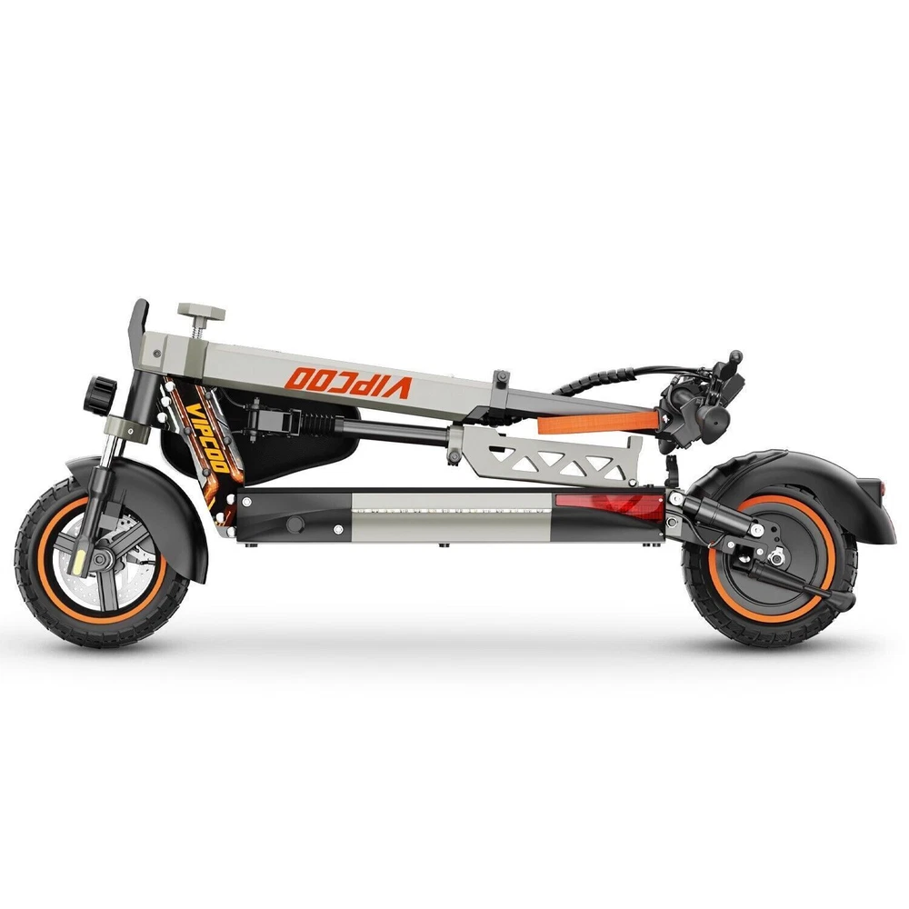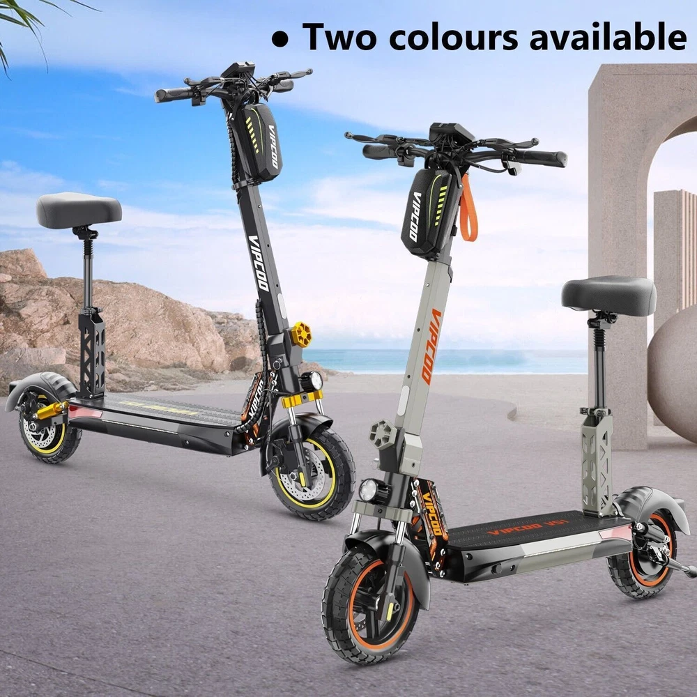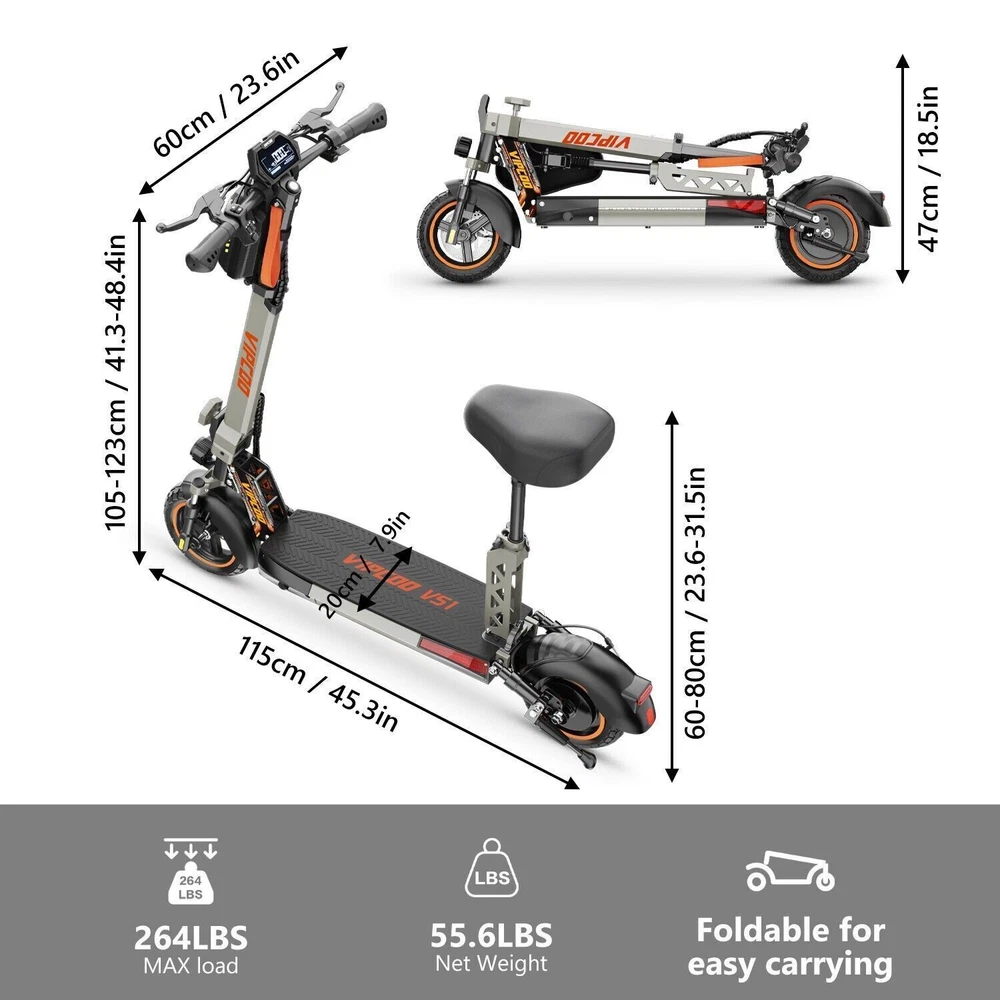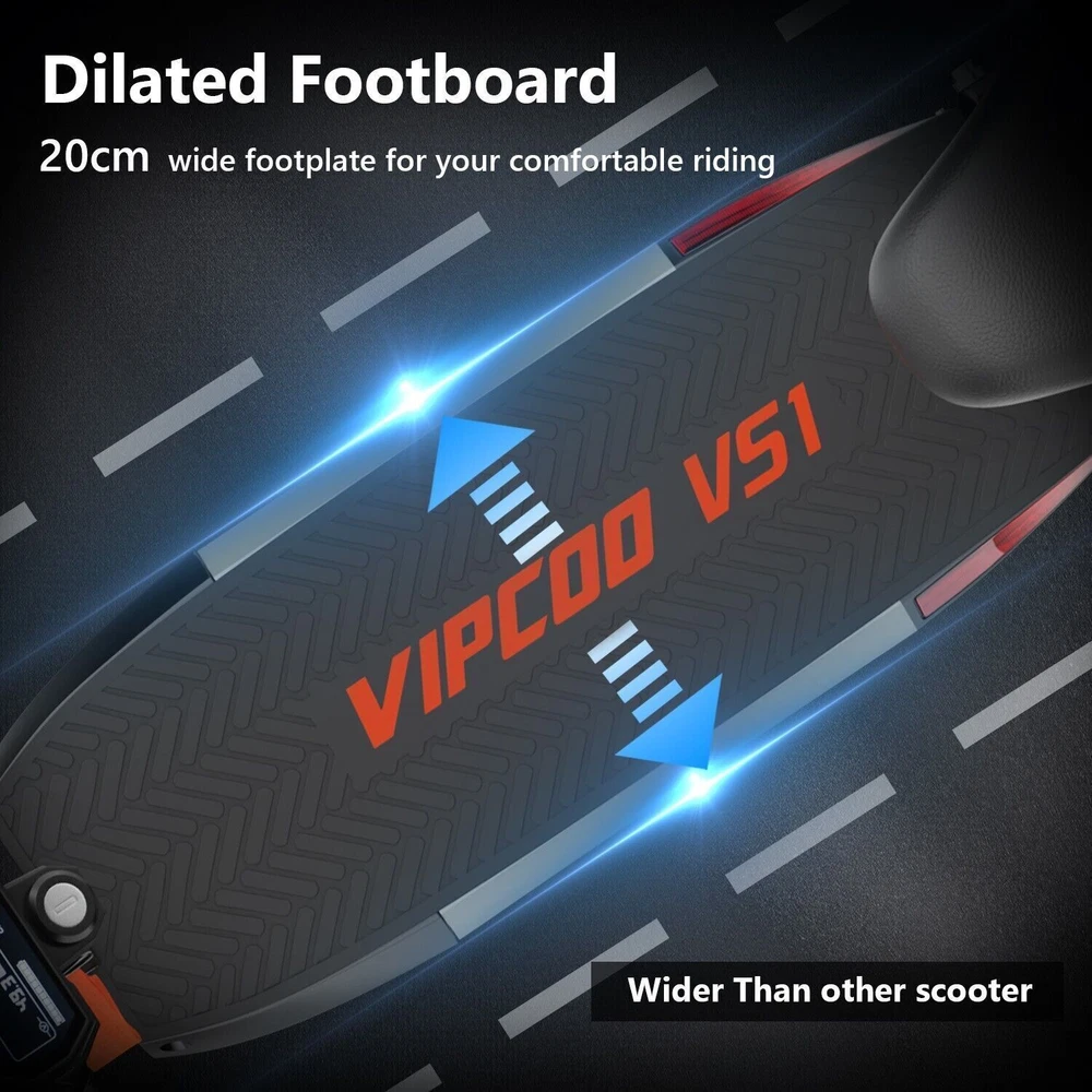 VS-S Electric Scooter, 700W, 28mph, 19miles, Folding Commute eScooter Fast Speed US STOCK Upgraded Electric Scooter: The VIPCOO VS-S electric scooter can speed up to 28 mph, travel range of 45 miles per charge, and max load of 264 lbs. Come with a powerful 700W motor that can allow the electric scooter climb to 15-25°slope. Newly Long-range Battery: Equipped with a high-capacity(48V 12.5AH) battery, the VIPCOO VS-S electric scooter can travel up to 45miles per charge, the longest range of city commuting e scooter. Great for city commuting. Safety and Comfortable Commuting: VIPCOO VS-S electric scooter features a front-wheel mechanical drum brake and a rear regenerative e-brake to enhance safety. The front and rear wheels are equipped with 10-inch air-filled tires to ensure max comfort, even on bumpy roads. Easy to Fold: VIPCOO VS-S can be folded quickly (folded size: 20.5inches, unfolded size: 45.7*23.6*46-51.2*27.6-29.9* inches). It can be carried on public transportation, easily stored in car trunks/elevators/subway, and other compact spaces. Specification: Model: VIPCOO VS-S Electric Scooter Body: Aluminium alloy Motor: 700W ( 900w Peak Power ) Battery: 48V 13AH Lithium Battery Brakes: Disc brake + Electronic brake Tires: 10" Off-road Tires Lights: Front LED headlight, turn signals and taillight Max. speed: 25 - 28 mph Maximum range: 15 - 45 miles Charging time: 6 -8Hours Package contents: 1 x VS-S Electric scooter. 1 x Instruction 1 x Tool set. 1 x Main charger. 1 x Bag 1 x Toolkit 1 x Rear Trunk