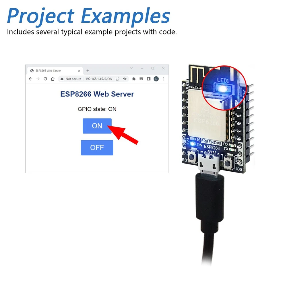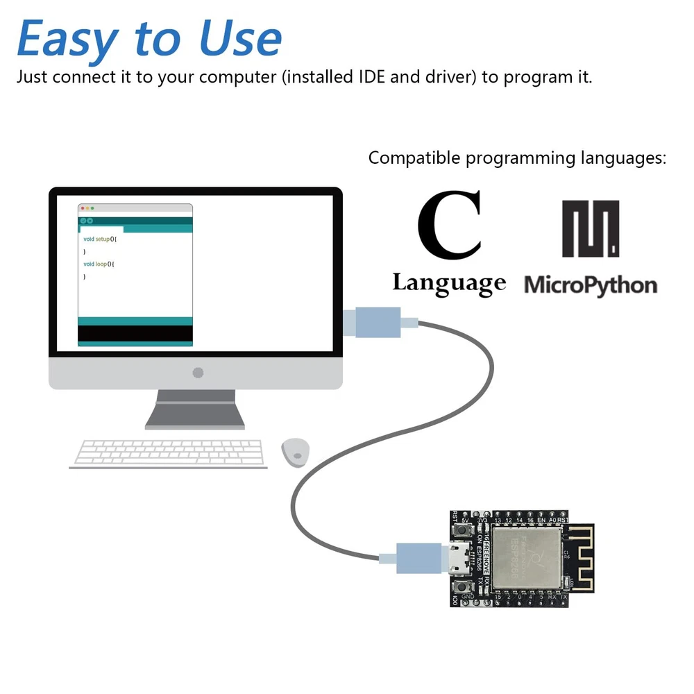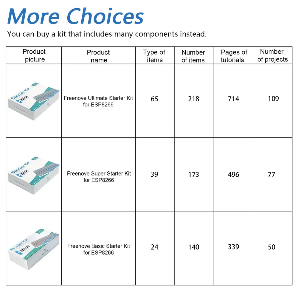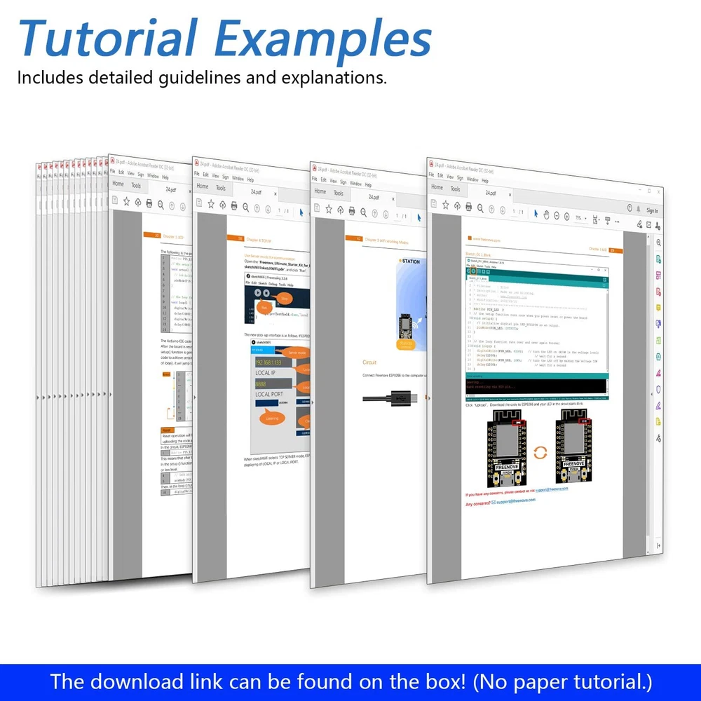 Overview: ESP8266 (ESP-12S) is a powerful and small controller with onboard Wi-Fi. This kit helps you learn and use it with its tutorial and project examples. We provide free technical support to help you with any questions and problems. Tutorial and Code: Comes with detailed tutorial and MicroPython, C code. (Download needed, no paper tutorial.) The download link can be found on the product box. Contents of MicroPython / C Tutorial: Preface ESP8266 Programming Software Environment Configuration Chapter 1 LED Project 1.1 Blink Chapter 2 Serial Communication Project 2.1 Serial Print Project 2.2 Serial Read and Write Chapter 3 WiFi Working Modes Project 3.1 Station Mode Project 3.2 AP Mode Project 3.3 AP+Station Mode Chapter 4 TCP/IP Project 4.1 As Client Project 4.2 As Server Chapter 5 Smart Home Project 5.1 Control LED through Web What's Next? ESP8266 (ESP-12S) -> A powerful and small controller with onboard Wi-Fi. Tutorial with MicroPython and C code -> The download link can be found on the product box. (No paper tutorial.) Example projects -> The tutorial will show you several typical projects with code and explanations. Easy to use -> Just connect it to your computer (installed IDE and driver) with a USB cable to program it. Get support -> Our technical support team is always ready to answer your questions.