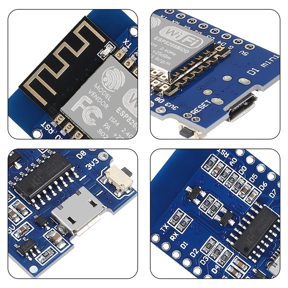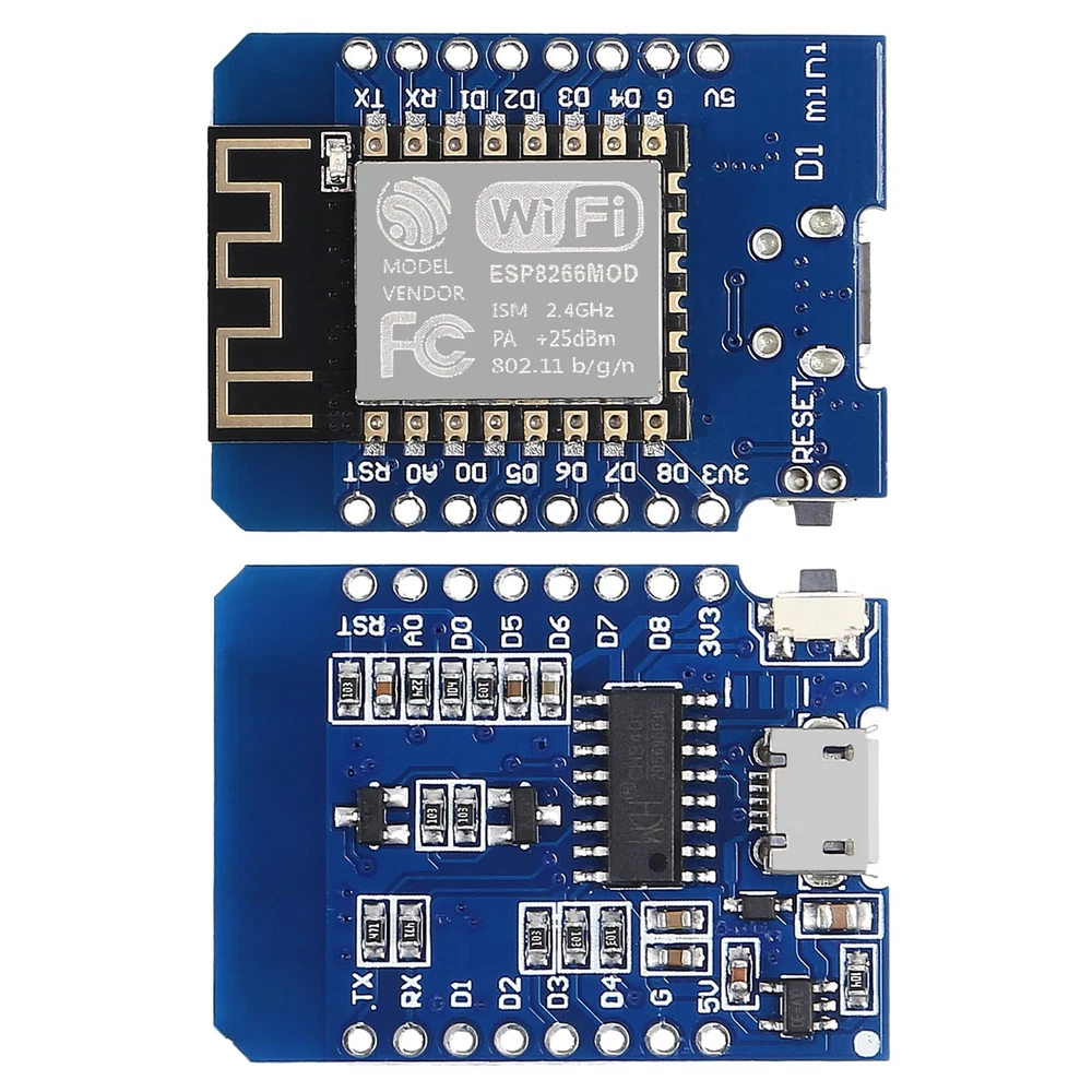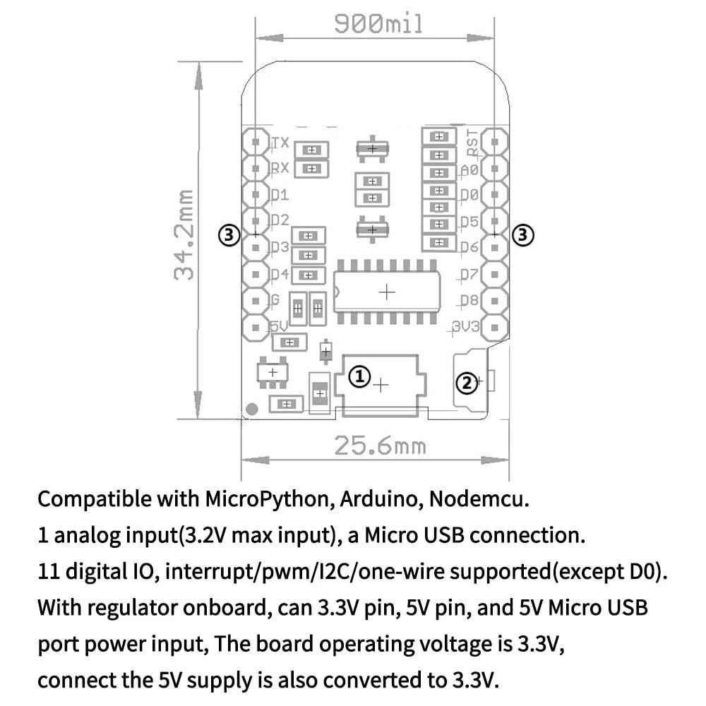 A mini wifi board with 4MB flash based on ESP8266EX Product Specification: Support OTA on line. 1 Micro USB connection. Main Chip: ESP8266 CH340G. 1 analog input (3.2V max input). 11 digital input/output pins, all pins have interrupt/pwm/I2C/-wire supported(except D0). With regulator onboard, can 3.3V pin, 5V pin, and 5V Micro USB port power input, The board operating voltage is 3.3V, connect the 5V supply is also converted to 3.3V, and not advised to use more than a 5V power supply. How to get it started for Arduino: - Setup driver Before you use the Development Board, you need to set up a CH340g driver. - Python On Windows, you need to install Python 2.7.10. On Linux, MAC OSX, you don't need to install it, comes preinstalled with OS. - Installing Hardware package "Boards Manager or GIT". We recommend using GIT, you can always get the latest version. Package Includes: 3*2 Pcs x Normal pins 3*2 Pcs x Long female pins 3*2 Pcs x Short female pins 3*1 Pcs x Esp8266 D1 mini wifi board The esp8266 WIFI development board with 4 MB of flash memory This is D1 mini module based on ESP8266EX, mini and compact design, can fit on a solderless breadboard, saves space for your project The esp8266 D1 mini development board is with Arduino, MicroPython, and Nodemcu, just like for Wemos D1 mini clones. can be programmed with for the Arduino IDE This esp8266 board has 11 digital input/output pins, all pins have interrupt/PWM/I2C/-wire supported(except D0), and a Micro USB connection. 1 analog input (3.2V max input) The esp8266 board with regulator onboard, can 5V pin or 5V Micro USB port power input, if 3.3V supply, can use 3.3V pin connect. The board operating voltage is 3.3V, connect the 5V supply is also internally converted to 3.3V, and not advised to use more than a 5V power supply