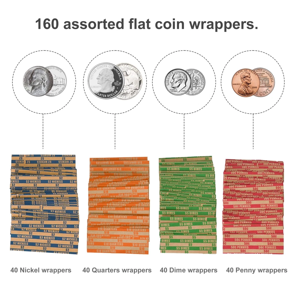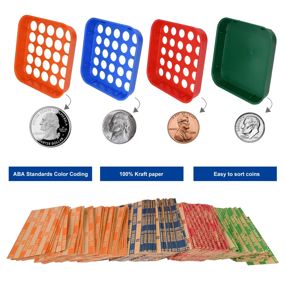 ESSENTIAL Coin Sorters Tray, 4 Color-Coded Coin Sorting Tray with 160 Assorted Coin Roll Wrappers ABA Standards Color Coding: Blue= Nickels, Green= Dimes, Orange= Quarters, Red= Pennies, Grey = Dollars. Coin Wrappers: Total 160 assorted flat coin wrappers distributed by 40 Quarters wrappers, 40 Dime wrappers, 40 Nickel roll and 40 Penny wrappers. Just need to put the coin into the Sorters Tray and shake it to separate the coin successfully. Applicable to banks, accounting, stores, education, families and supermarkets. ESSENTIAL: We are specialized in producing coin wrappers. If you need to buy more coin wrappers, please check in our store. ABA STANDARDS COLOR CODING: Blue= Nickels, Green= Dimes, Orange= Quarters, Red= Pennies. COIN WRAPPERS: Total 160 assorted flat coin wrappers distributed by 40 Quarters wrappers, 40 Dime wrappers, 40 Nickel wrappers and 40 Penny wrappers. HOW TO USE: Just need to put the coin into the Sorters Tray and shake it to separate the coin successfully. APPLICABILITY: Applicable to banks, accounting, stores, education, families and supermarkets. ESSENTIAL: We are specialized in producing coin wrappers. If you need to buy more coin wrappers, please check in our store.