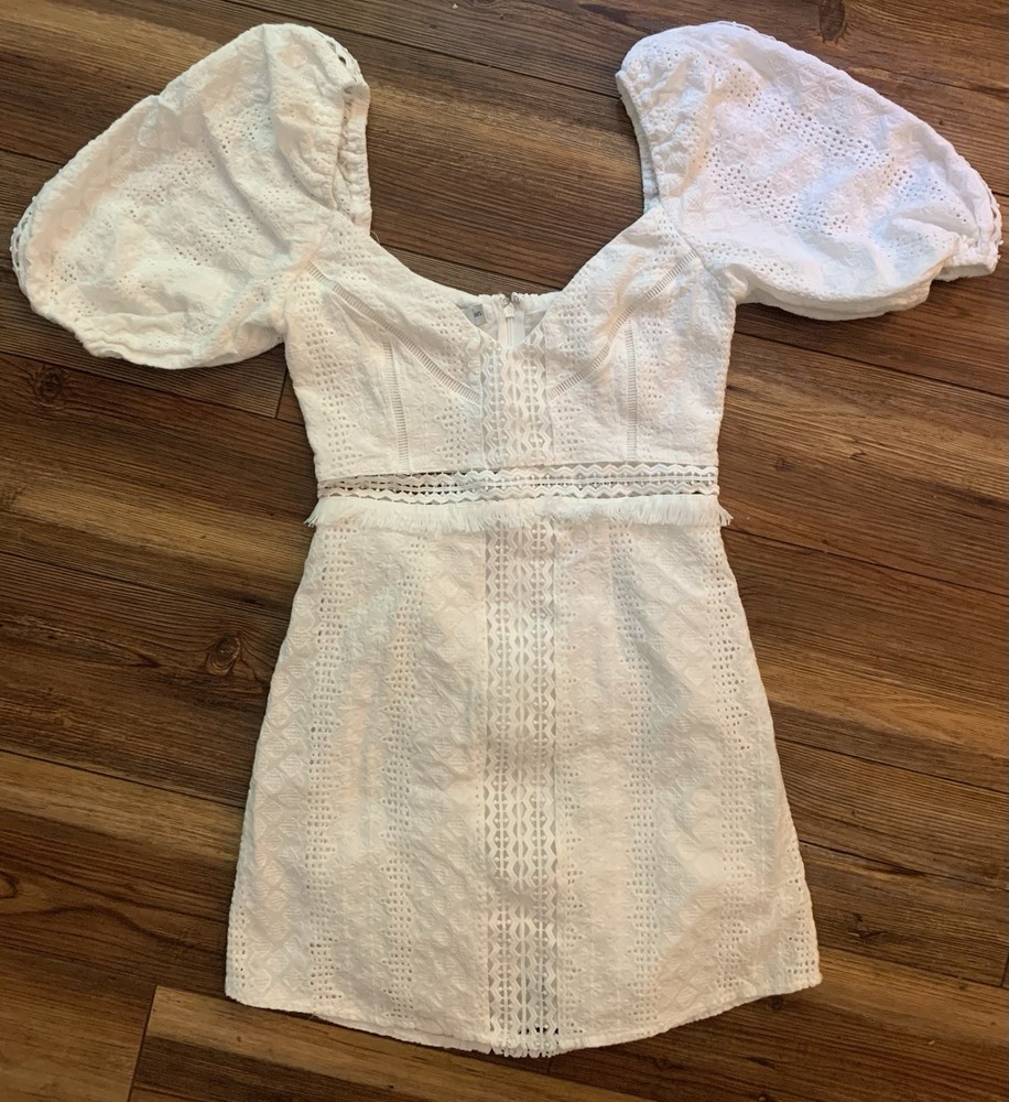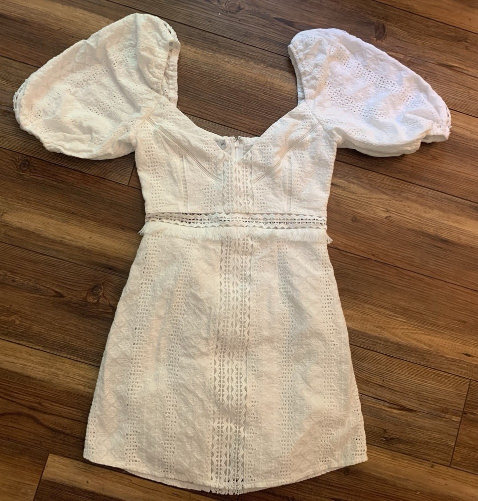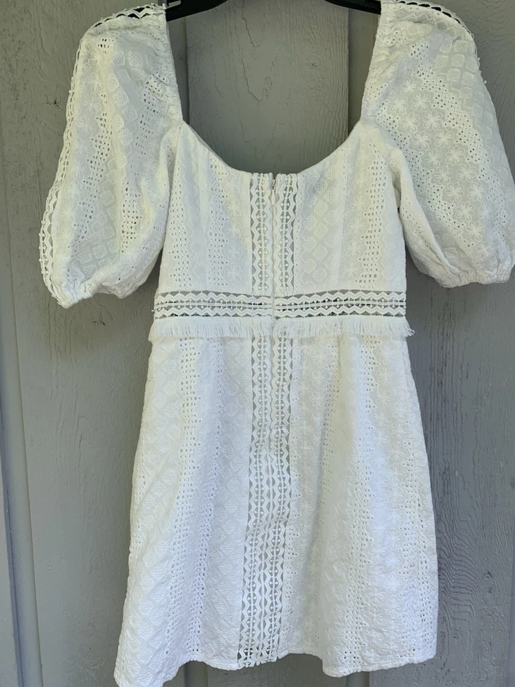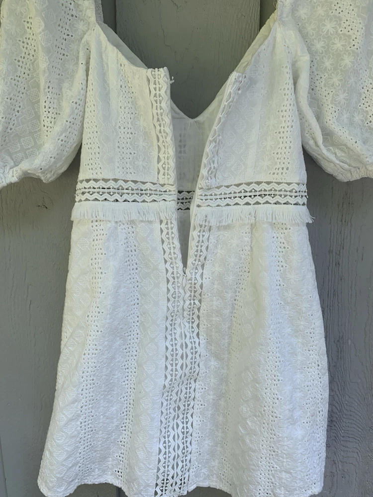 The ESTHER White Lace Puff Sleeve Lined Mini Dress in size S/8 is a stylish and versatile piece suitable for various occasions such as formal events, parties, or casual outings. The dress features a flattering V-neck and short puff sleeves, made from delicate lace fabric with a comfortable cotton lining. Its short length adds a trendy and playful touch, while the zipper and hook & eye closure ensures a secure fit. Perfect for any season, this elegant dress exudes a blend of hipster, princess, and bohemian styles, making it a standout choice for women looking for a chic and trendy look. Please see photos for measurements and condition. This item is sized as S/8.
