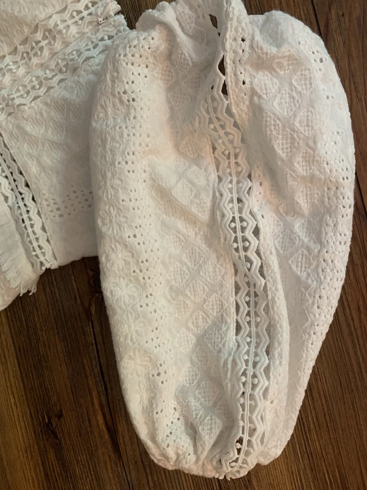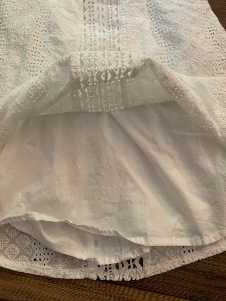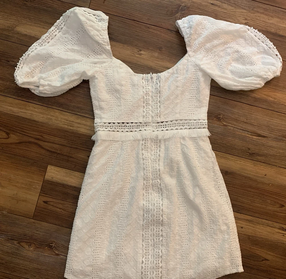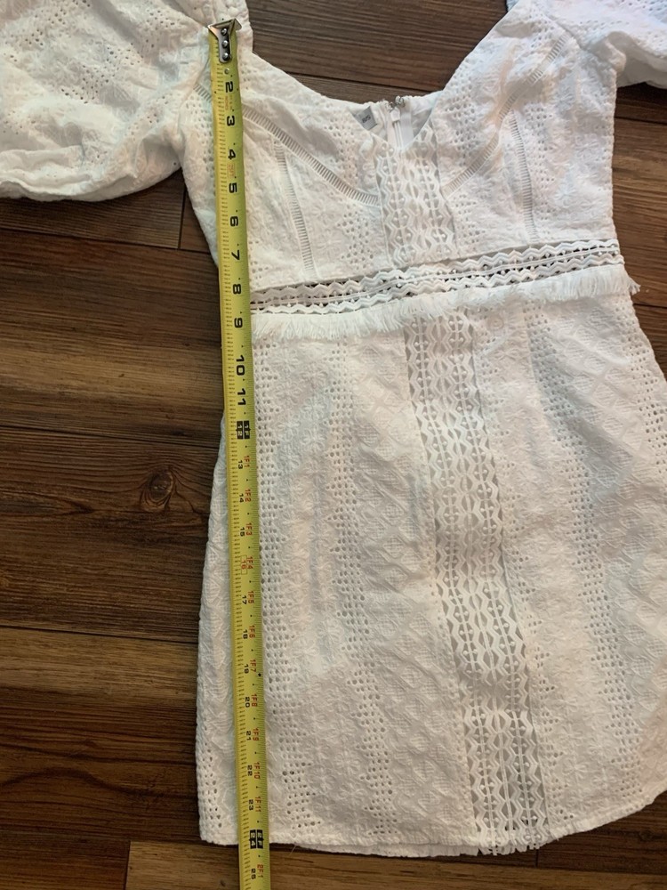 The ESTHER White Lace Puff Sleeve Lined Mini Dress in size S/8 is a stylish and versatile piece suitable for various occasions such as formal events, parties, or casual outings. The dress features a flattering V-neck and short puff sleeves, made from delicate lace fabric with a comfortable cotton lining. Its short length adds a trendy and playful touch, while the zipper and hook & eye closure ensures a secure fit. Perfect for any season, this elegant dress exudes a blend of hipster, princess, and bohemian styles, making it a standout choice for women looking for a chic and trendy look. Please see photos for measurements and condition. This item is sized as S/8.