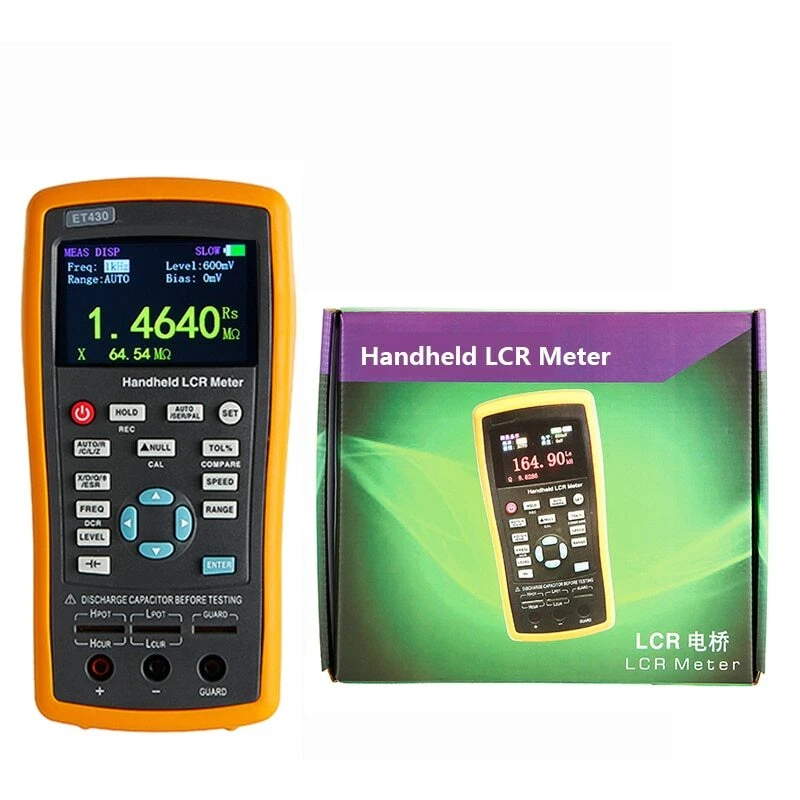 Product description: ET43 series handheld bridge features 2.8” TFT display screen, easy key operation and USB communication. Its high capacity lithium battery ensures long run. It can measure comprehensive parameters, and supports for screening and deviation measurement, with continuously adjustable output frequency. The basic accuracy reaches 0.2%/0.3% Product features: Measurable frequency up to 100k Hz, continuously adjustable at a step of 1 Hz. Measurement of DC resistance and electrolytic capacitor supported Internal bias voltage output (10 mV-500 mV) Automatic identification of measured component Support for screening and deviation measurement 2.8” TFT display screen, a 4 1/2 digit display USB communication interface Power supply by high capacity lithium battery Support for SCPI protocol System configuration available for setting of language, buzzer and display brightness Basic measuring accuracy 0.2%, adjustable measuring speed Manual and automatic range Open circuit and short circuit calibration Multiple testing ports