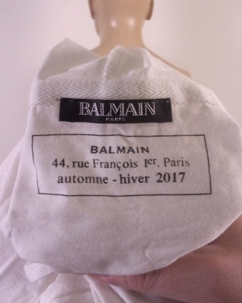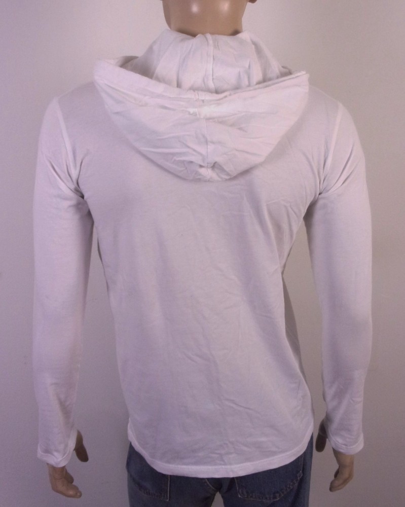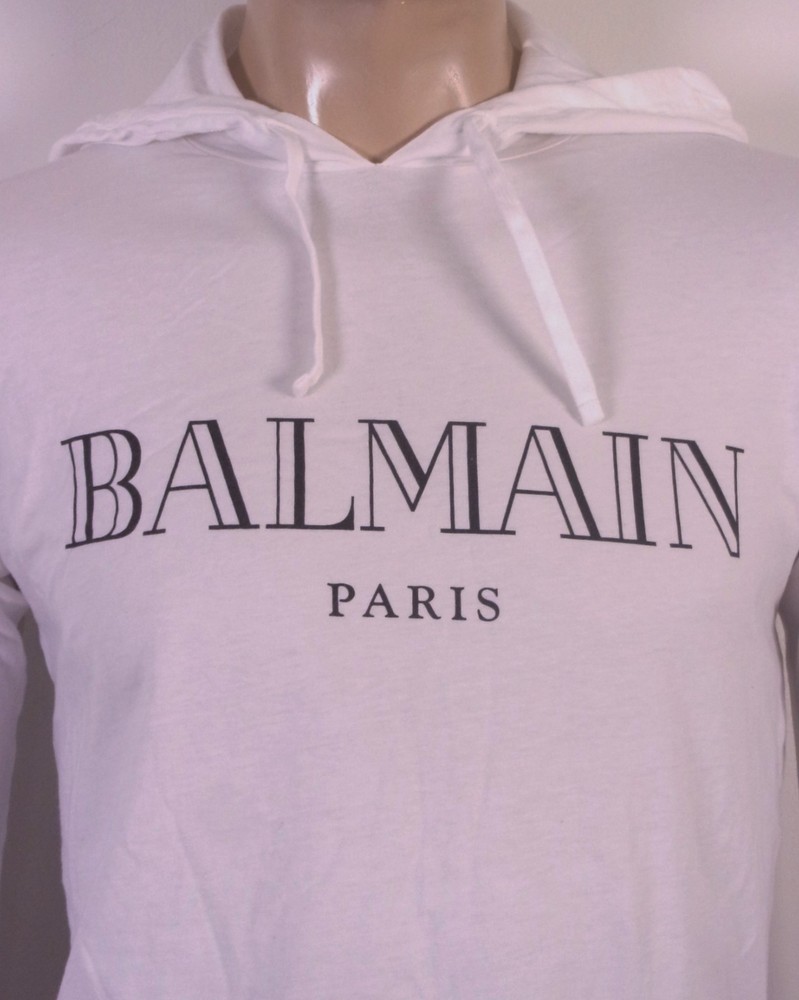 The EUC Balmain Paris 2017 Hoodie T-Shirt is a stylish and versatile addition to any wardrobe. Made from cotton, this long sleeve shirt features a drawstring hood and spell out logo, perfect for a casual yet fashionable look. With a size M and regular fit, it is suitable for both men and women and can be worn throughout all seasons. The designer brand Balmain Paris adds a touch of luxury to this wardrobe staple, making it a must-have for those looking to elevate their style with a trendy and high-quality piece. Pit to Pit: 19.5 Sleeves: 25 Length: 27