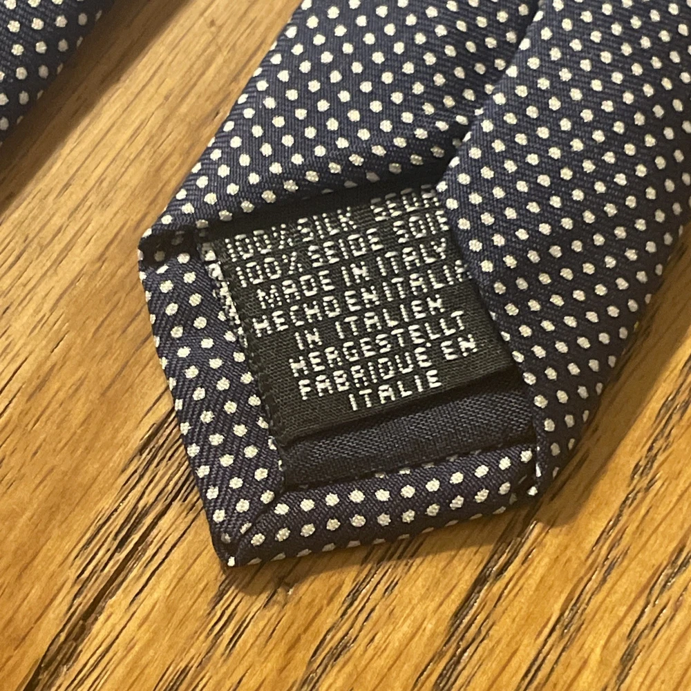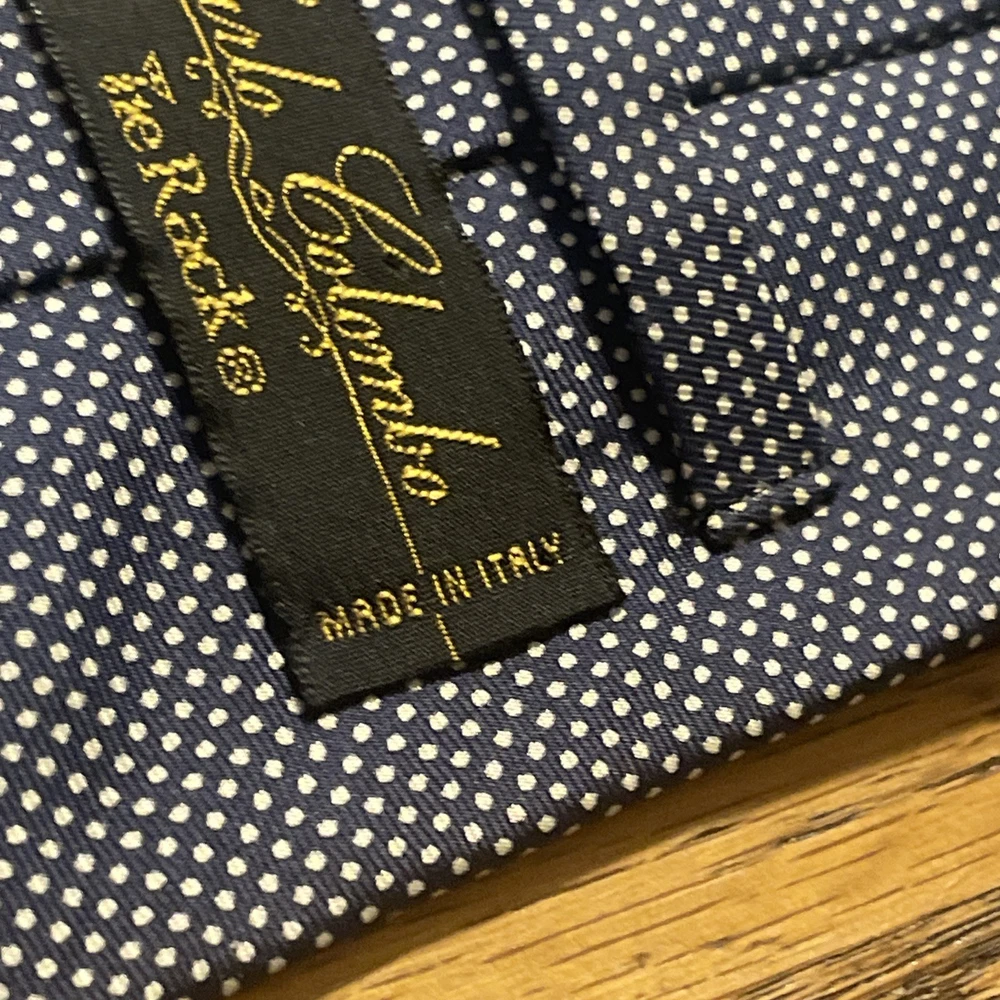 The EUC Carlo Colombo For Tie Rack Silk Fine Dot Pattern Necktie is a designer tie made in Italy from 100% silk. Featuring a classic width and a preppy style, this multicolor tie is crafted with a satin fabric and a fine dot pattern, making it a stylish addition to any man's accessory collection. The Carlo Colombo / Tie Rack brand ensures quality and sophistication in this timeless piece.