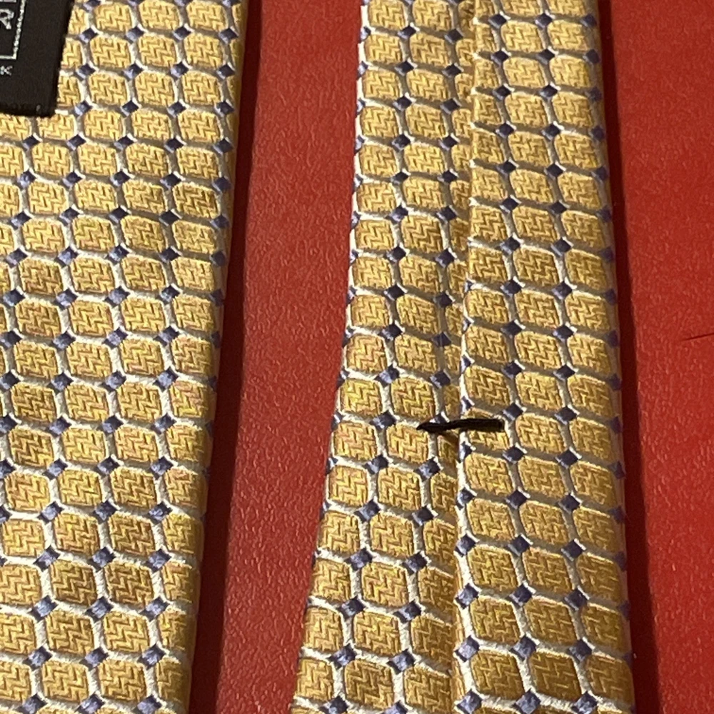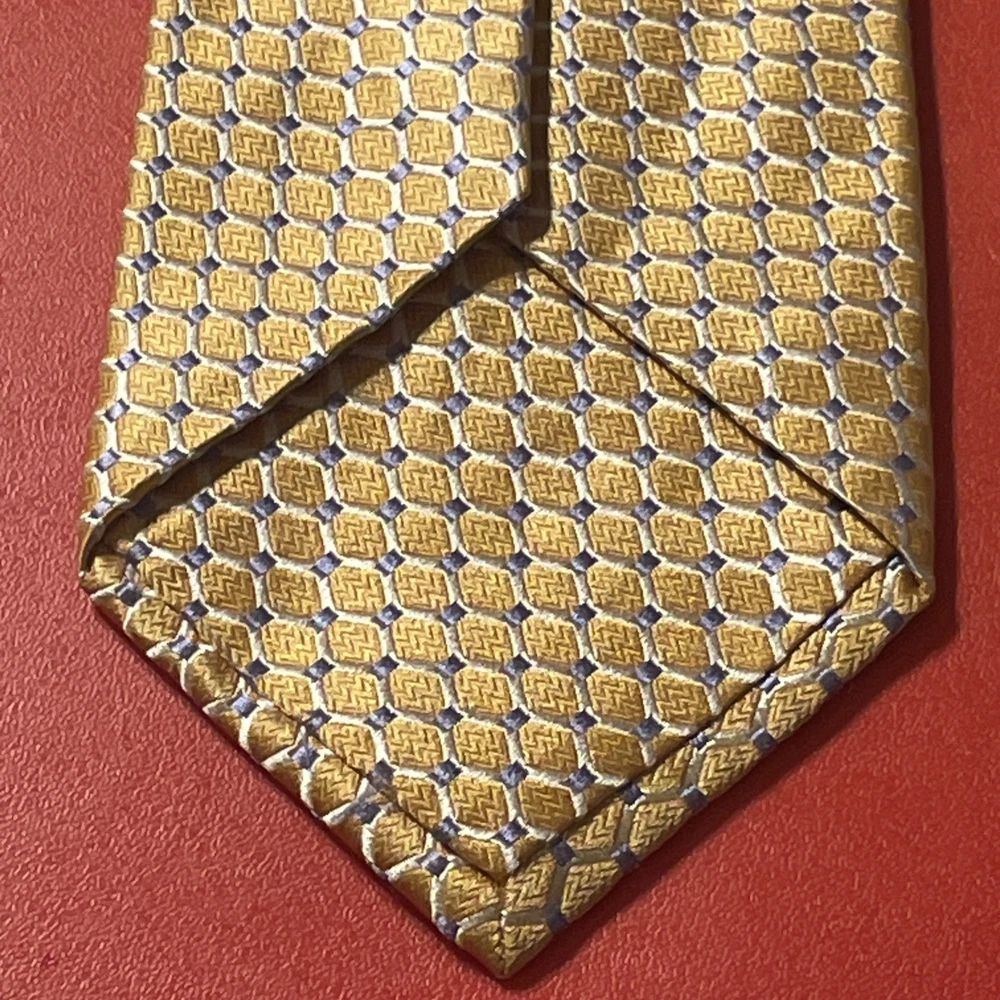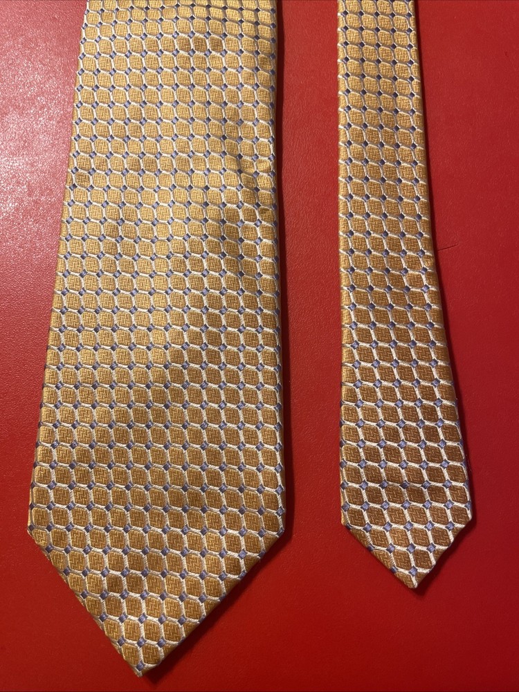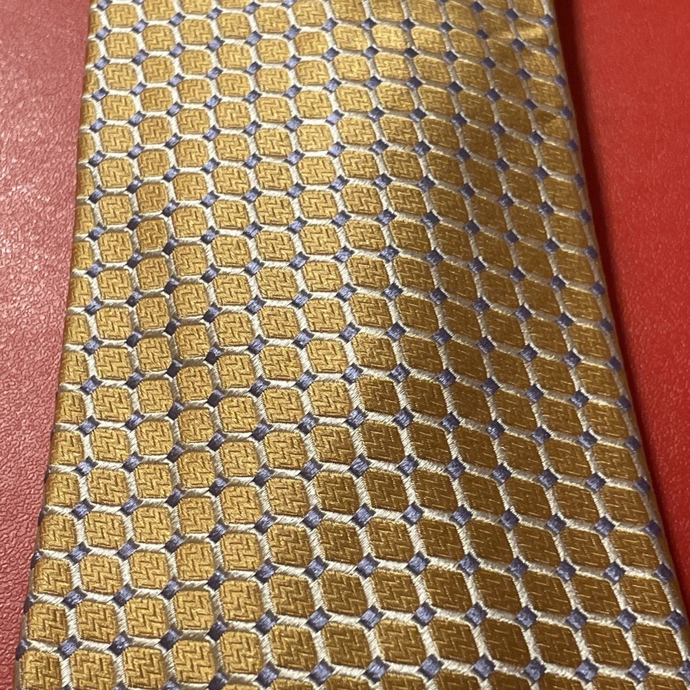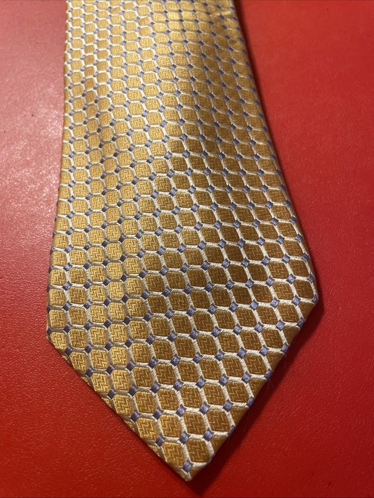 The EUC Ike Behar Thick Woven Silk Geometric Tie is a designer power tie made in the USA. Hand tailored from 100% silk fabric, this multicolor geometric tie is a classic accessory for men. With its intricate design and high-quality material, this tie adds a touch of sophistication to any formal outfit, making it a versatile and stylish addition to any man's wardrobe.