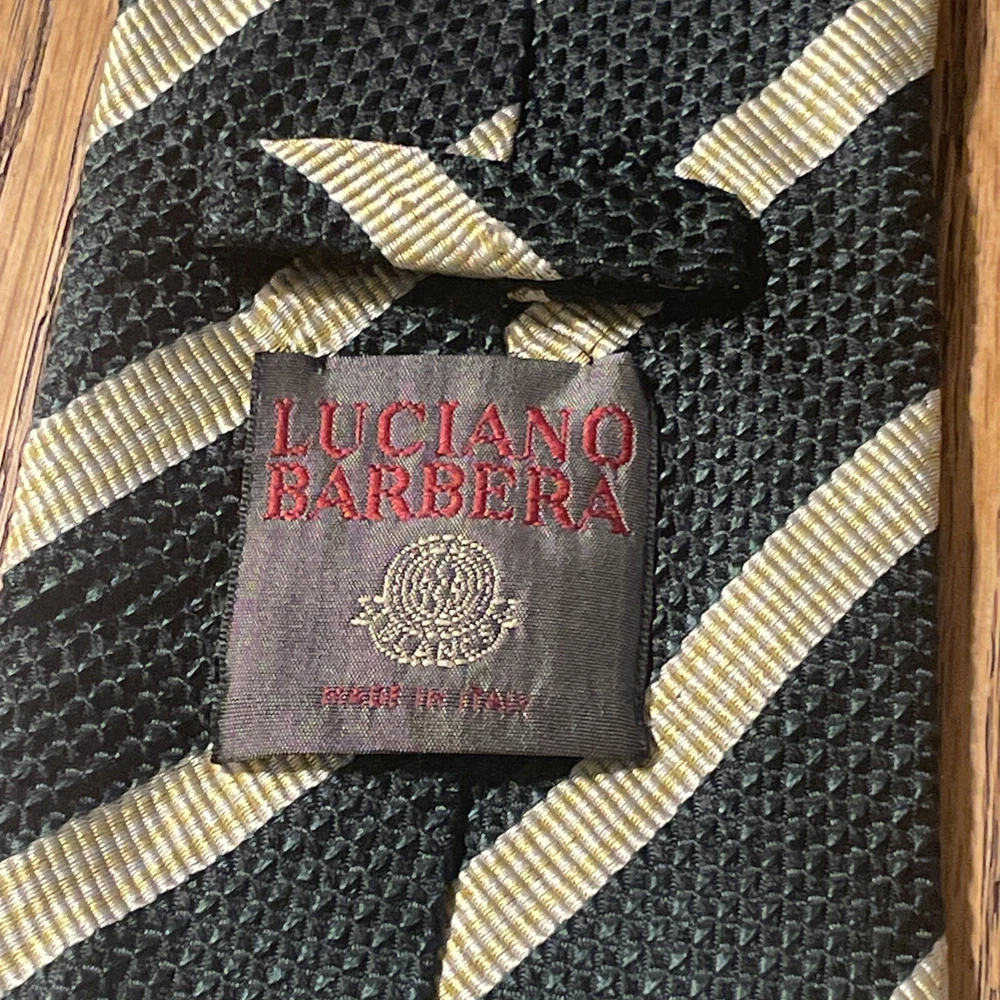 The product is a stylish and luxurious Luciano Barbera striped tie made in Italy. This designer tie is crafted from 100% silk in a classic width, perfect for a preppy and sophisticated look. The multicolor stripes add a touch of elegance to any men's outfit, making it a versatile and high-quality accessory for formal occasions or business events. With its woven fabric and impeccable craftsmanship, this tie exudes a sense of refinement and luxury that is sure to impress.
