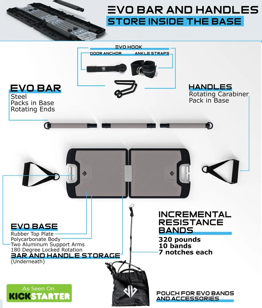 AS SEEN ON KICKSTARTER - PATENT PENDING - We were dissatisfied with other home gyms. So, we developed a better one. EVO Gym is ultra portable while delivering unrivalled strength, durability, and quality. No sacrifices made. Right out of the box you can train with anywhere from 10 to 320LBS of fine-tuned resistance and perform hundreds of exercises. A FULL GYM YOU CAN TAKE ANYWHERE - EVO Gym is the world’s only fully-equipped home gym that fits in your backpack, delivering peerless portability. Simply pack your bars and handles into the base and you can store it in your carry on or even a large purse. Others may claim to be portable, but are far too bulky and inconvenient to travel with. MAXIMUM TENSION & MAXIMUM RESULTS - EVO Gym provides a workout experience second to none. Reinforced with Aircraft-Grade Aluminum, our base will never wobble or bend when you load it up for your work out. With EVO Bands, you don’t have to worry about keeping tension when performing movements. Squats, deadlifts, presses. You name it. It just works. LIMITLESS VARIETY - With EVO Gym's versatile set of accessories, you can track your progress and move toward your goals for weight loss & muscle gain. With our ankle straps, door anchor, & EVO hook, the possibilities are endless. Our portable workout equipment is perfect for men, women, beginner, and advanced weight trainers. SAFETY GUIDE, TRAINING VIDEOS, AND 1 YEAR WARRANTY - When you get your EVO Gym, you will be emailed a link to all of our training videos, safety Instructions, and Guides. Plus, EVO Gym comes with a year long band warranty for your 10 Bands - 2x10lbs, 2x20lbs, 2x30lbs, and 4x50lbs. With an extra pair of 50lb bands, you can load up to 400lbs!