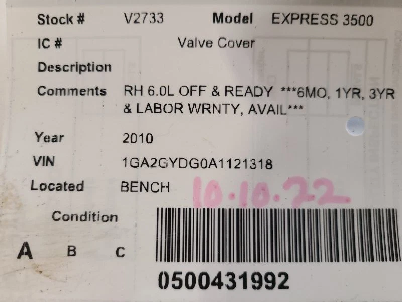 Powered by Frooition All Items See our eBay store for more great items >> Shop Categories ABS Anti-Lock Brake Part Other Aftermarket Stereos Air Bags Amplifiers Anti-Lock Brake Part Automobiles Stereos A/V Equipment CD Changers Center Caps + Wheel Covers Chassis Brain Box Coil Packs Computer + Control Modules Distributors Door Mirrors Door Panels DVD Equipment Engines Front Lamps Grilles Headlamp & Front Lamps Heat A/C Control Heater Motor/Blower Starters Interior Switches Interior Switch / Controls Keyless Entry FOB Owners Manual's Speedometers Tail Lights Transmission Wheels + Tires Alternators Fuel Pumps Window Regulators & Controls Steering Pumps Wiper Motors Compressors INFO/GPS/TV SCREENS Radiator Windshield Washer Bottles Condenser Shifters Windows & Sunroof Turbo Superchargers Glass Doors Air Cleaner Box Spindles Drive Shafts EXPRESS35 2010 Valve Cover 1633233 Item Description This listing is for the item pictured. It is ready to ship and comes with a 90 day warranty! eBay compatibility may be incorrect. See below for fitment information and any notes pertaining to this specific part. Feel free to contact us if you have any questions. Thanks for looking! Donor Vehicle: Year: 2010 Model: EXPRESS35 Stock #: V2733 Mileage: 233000 Notes: RH 6.0L OFF READY 6MO, 1YR, 3Y This part will only fit: For more parts from this vehicle, CLICK HERE . About Us About Us Payment Shipping Terms Returns About Us We are a family-owned business with over 30 years in the used car parts industry. We're proud to provide excellent quality used auto parts at famously discounted prices! Over time we have grown to 4 locations in Harrison, MI, Lansing, MI, Saint Johns, MI, and Toledo, OH. We are here to serve you Monday thru Friday 8 a.m. to 5 p.m. EST. If you have any concerns or questions, please feel free to message us here on eBay. We will normally get back to you within 12 hours during the work week. Payment Payment We accept Paypal, all major credit cards and cash (if you are picking up the item). Payment is required within 2 days of winning a listing. If payment is not made after 2 days, an unpaid item case will be opened. Shipping Shipping Most items will ship ground with UPS or USPS. We may use other carriers at our discretion. In some instances, freight orders will require a business address with a loading dock or forklift. A good working phone number is required for all orders. Local pickup is also an option on any order. Our 4 locations are open Monday thru Friday from 8 a.m. to 5 p.m. EST. Please check with us before driving out to make sure we have the part ready at the location nearest to you. Terms Terms Most items include a 90-day warranty (unless otherwise indicated). This coverage is included on all new or used parts unless otherwise stated in the listing or on the front of the invoice. This warranty is non-transferable. Labor is not covered under any circumstance unless a separate labor warranty is purchased. Extended warranties are also available. Please see our website for complete details and exclusions. Returns Returns We allow 60 days for returns. If you ordered the incorrect part or simply do not need it, you are responsible for the origin and return shipping. Helpful Links Add to Favorite Sellers Sign up to Newsletter View Feedback Contact Seller Visit seller's eBay Shop About Seller Page More Items! View more great items PUSH BUTTON IGNITION SWITCH 2015-2016 CHRYSLER 300 WORKS GREAT! $107.09 Wheel 18x8 Alloy 8 Spoke Fits 14-17 INFINITI QX50 1615364 $224.99 Passenger Right Headlight Fits 04-06 MDX 1623916 $89.99 Passenger Right Headlight Fits 07-09 ASPEN 1610956 $84.99 Powered by Frooition Frooition | No-js Template | eBay design, eBay store design, eBay shop design, eBay template design, eBay listing design (ver:froo_no_js) This listing is currently undergoing maintenance, we apologise for any inconvenience caused.