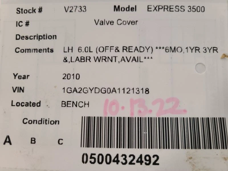 Powered by Frooition All Items See our eBay store for more great items >> Shop Categories ABS Anti-Lock Brake Part Other Aftermarket Stereos Air Bags Amplifiers Anti-Lock Brake Part Automobiles Stereos A/V Equipment CD Changers Center Caps + Wheel Covers Chassis Brain Box Coil Packs Computer + Control Modules Distributors Door Mirrors Door Panels DVD Equipment Engines Front Lamps Grilles Headlamp & Front Lamps Heat A/C Control Heater Motor/Blower Starters Interior Switches Interior Switch / Controls Keyless Entry FOB Owners Manual's Speedometers Tail Lights Transmission Wheels + Tires Alternators Fuel Pumps Window Regulators & Controls Steering Pumps Wiper Motors Compressors INFO/GPS/TV SCREENS Radiator Windshield Washer Bottles Condenser Shifters Windows & Sunroof Turbo Superchargers Glass Doors Air Cleaner Box Spindles Drive Shafts EXPRESS35 2010 Valve Cover 1633888 Item Description This listing is for the item pictured. It is ready to ship and comes with a 90 day warranty! eBay compatibility may be incorrect. See below for fitment information and any notes pertaining to this specific part. Feel free to contact us if you have any questions. Thanks for looking! Donor Vehicle: Year: 2010 Model: EXPRESS35 Stock #: V2733 Mileage: 233000 Notes: LH 6.0L OFF READY 6MO,1YR 3YR This part will only fit: For more parts from this vehicle, CLICK HERE . About Us About Us Payment Shipping Terms Returns About Us We are a family-owned business with over 30 years in the used car parts industry. We're proud to provide excellent quality used auto parts at famously discounted prices! Over time we have grown to 4 locations in Harrison, MI, Lansing, MI, Saint Johns, MI, and Toledo, OH. We are here to serve you Monday thru Friday 8 a.m. to 5 p.m. EST. If you have any concerns or questions, please feel free to message us here on eBay. We will normally get back to you within 12 hours during the work week. Payment Payment We accept Paypal, all major credit cards and cash (if you are picking up the item). Payment is required within 2 days of winning a listing. If payment is not made after 2 days, an unpaid item case will be opened. Shipping Shipping Most items will ship ground with UPS or USPS. We may use other carriers at our discretion. In some instances, freight orders will require a business address with a loading dock or forklift. A good working phone number is required for all orders. Local pickup is also an option on any order. Our 4 locations are open Monday thru Friday from 8 a.m. to 5 p.m. EST. Please check with us before driving out to make sure we have the part ready at the location nearest to you. Terms Terms Most items include a 90-day warranty (unless otherwise indicated). This coverage is included on all new or used parts unless otherwise stated in the listing or on the front of the invoice. This warranty is non-transferable. Labor is not covered under any circumstance unless a separate labor warranty is purchased. Extended warranties are also available. Please see our website for complete details and exclusions. Returns Returns We allow 60 days for returns. If you ordered the incorrect part or simply do not need it, you are responsible for the origin and return shipping. Helpful Links Add to Favorite Sellers Sign up to Newsletter View Feedback Contact Seller Visit seller's eBay Shop About Seller Page More Items! View more great items Speedometer Cluster US Market MPH EX-L Leather Fits 09-10 ODYSSEY 1627356 $89.99 Wheel VIN J 11th Digit Limited 18x7-1/2 6 Spoke Fits 13-17 ACADIA 1594540 $124.99 Power Steering Pump Fits 04-08 FORENZA 1596364 $74.99 Transfer Case Transfer Case Opt NP0 ID 5822 Fits 16-19 SUBURBAN 1500 1595954 $687.74 Powered by Frooition Frooition | No-js Template | eBay design, eBay store design, eBay shop design, eBay template design, eBay listing design (ver:froo_no_js) This listing is currently undergoing maintenance, we apologise for any inconvenience caused.