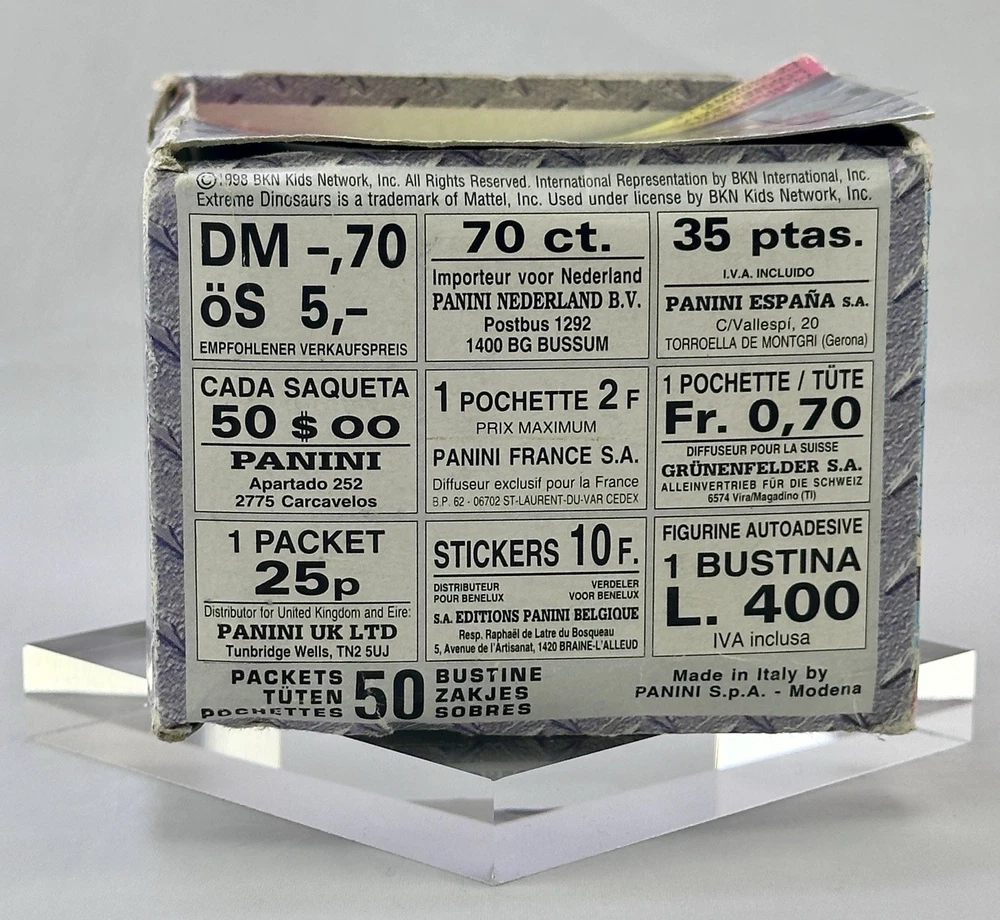 EXTREME DINOSAURS PANINI STICKERS FIGURINE BOX 50 SEALED BAGS RARE MADE IN ITALY Box contenente 50 bustine di figurine. Box aperto con segni di usura e strappi. Bustine sigillate, tranne una che è stata aperta sull’estremità superiore. Il resto è intatto! Articolo per collezionisti adulti. Fare riferimento alle immagini, chiedere per ulteriori informazioni. Per spedizioni internazionali e fuori dall’Italia, prima di acquistare, si prega di contattarci prima al fine di stabilire con precisione l’importo. Spedizione combinata per l’acquisto di più oggetti. Spedizione tracciata. Ti ringraziamo per averci scelto. Ti informiamo che i tempi di consegna sono indicativi e possono variare a seconda delle condizioni di spedizione. Se non hai ricevuto il tuo oggetto entro il termine previsto, ti invitiamo a contattarci prima di aprire una controversia. Saremo lieti di assisterti e di trovare una soluzione soddisfacente per entrambi. Ti chiediamo gentilmente di attendere la nostra risposta prima di procedere con eventuali reclami. La tua soddisfazione è la nostra priorità. Gentile cliente, si prega di notare che ogni articolo disponibile nel nostro negozio è dotato di un esclusivo sistema di identificazione invisibile. Questo ci permette di verificare l'autenticità degli oggetti in caso di reso. Qualsiasi incongruenza tra l'oggetto venduto e quello restituito sarà prontamente rilevata e segnalata. Vi ringraziamo per la vostra cortese attenzione e collaborazione. Gli oggetti alimentati a batteria vengono forniti senza batteria. Se il pagamento non viene effettuato entro 4 giorni dall'acquisto, l'oggetto sarà rimesso automaticamente in vendita e la vendita sarà annullata. EXTREME DINOSAURS PANINI STICKERS FIGURINE BOX 50 SEALED BAGS RARE MADE IN ITALY Sealed packets, except for one that has been opened at the top edge. The rest are intact! Sealed packets, except for one that has been opened at the top edge. The rest are intact! Item for adult collectors. Please refer to pictures, ask for further information. For international and out of Italy shipment please contact us before to buy in order to define exactly the costs. Combined shipping for the purchase of several items. Tracked shipping. Thank you for choosing us. Please note that delivery times may vary depending on shipping conditions. If you have not received your item by the deadline, please contact us before opening a dispute. We will be happy to assist you and find a mutually satisfactory solution. We kindly ask you to wait for our reply before proceeding with any complaints. Your satisfaction is our priority. Dear customer, please note that every item available in our shop is tagged with an exclusive invisible identification system. This allows us to verify the authenticity of the items in the event of a return. Any discrepancies between the item sold and the item returned will be promptly detected and reported. We thank you for your attention and cooperation. Battery-powered devices are supplied without batteries. If payment is not made within 4 days since purchase, the item will be automatically relisted for sale and the transaction will be canceled. Item for adult collectors. Please refer to pictures, ask for further information. For international and out of Italy shipment please contact us before to buy in order to define exactly the costs. Combined shipping for the purchase of several items. Tracked shipping. Thank you for choosing us. Please note that delivery times may vary depending on shipping conditions. If you have not received your item by the deadline, please contact us before opening a dispute. We will be happy to assist you and find a mutually satisfactory solution. We kindly ask you to wait for our reply before proceeding with any complaints. Your satisfaction is our priority. Dear customer, please note that every item available in our shop is tagged with an exclusive invisible identification system. This allows us to verify the authenticity of the items in the event of a return. Any discrepancies between the item sold and the item returned will be promptly detected and reported. We thank you for your attention and cooperation. Battery-powered devices are supplied without batteries. If payment is not made within 4 days since purchase, the item will be automatically relisted for sale and the transaction will be canceled. Il nostro negozio si trova in Italia (Unione Europea). Eventuali dazi doganali o tasse di importazione non sono inclusi nel prezzo e sono a carico dell?acquirente, secondo le normative del Paese di destinazione. "Our store is located in Italy (European Union). Import duties, taxes, and customs charges are not included in the item price or shipping cost. These costs are the buyer?s responsibility according to the regulations of the destination country.