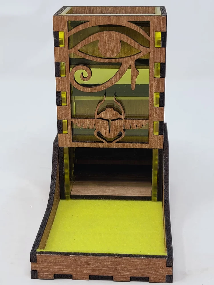 EYE OF RA Dice Tower Tray wood & acrylic nesting portable tabletop games DND This simple, yet elegant dice tower does a wonderful job of keeping your dice in the tower, rather than crashing across your tabletop or rolling onto the floor! Length: 5 1/8 in Width: 3 in Depth: 1 2/4 in Accommodates standard 6 sided die, DND 7 piece dice set (including 20 sided die). Folds up for easy storage and portability in your pocket, bag or backpack. Felt covered baffles and dice tray reduce the sound of the dice rolling. Please visit our store to purchase other dice towers, as well as our MTG Deck Boxes. We develop new products through Kickstarter regularly so please check back for more items soon! We will combine shipping costs for multiple items if requested.