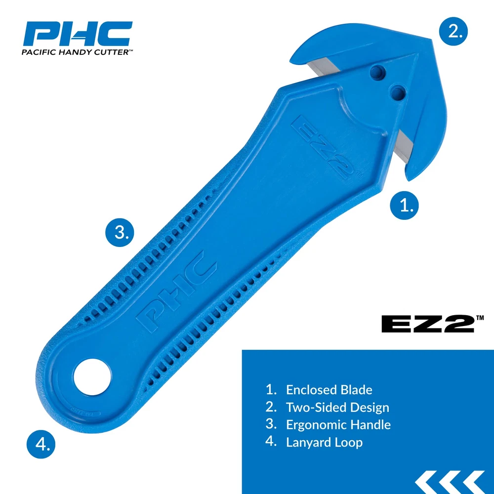 The EZ2 Concealed Blade Safety Cutter helps reduces potential injuries by protecting the user from contact with the sharp blade. This easy-to-use tool cuts boxes, shrink wrap, plastic strapping, twine and features a convenient tape splitter. The disposable EZ2 eliminates loose blades from the workplace. Attach to CL-36 Coil Lanyard for better retention. The EZ2 is proudly made in the USA. Enclosed Blade eliminates loose blades from the workplace Versatile two-sided design with a high quality steel blade Nominal Ambidextrous Disposable Included components: ez2 concealed blade safety cutter