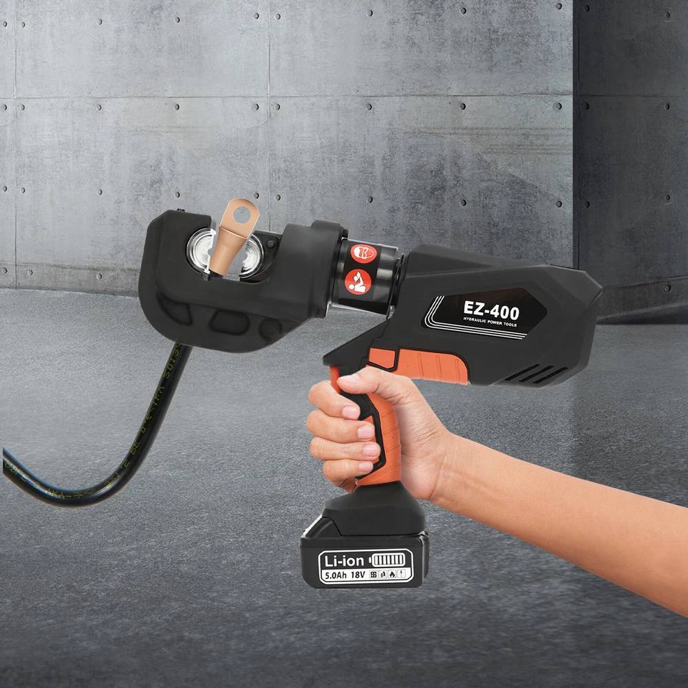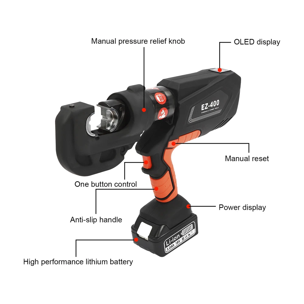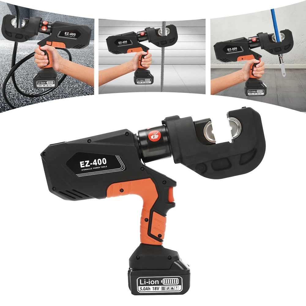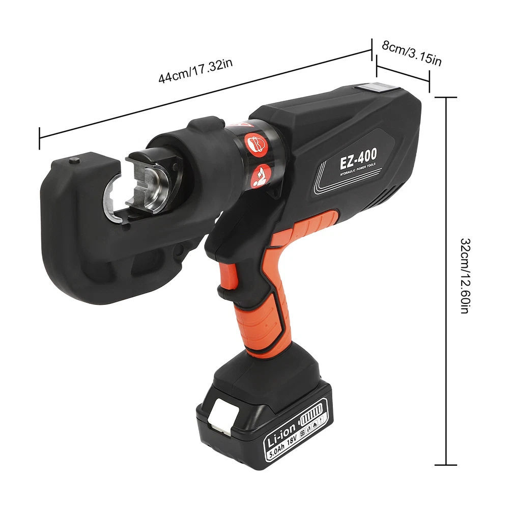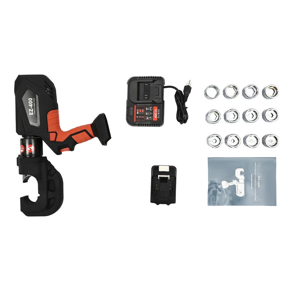 Specification Model: EZ-400 Material: 40Cr Steel, Q235 Steel, Plastic Process: Forging, Finishing, Injection Molding Color: Black, Red Style: Modern Motor Type: Pure Copper Motor Plug Type: US Standard Assembly Required: Yes Number of Battery: 1 Output Power: 400W Voltage: 110V Battery Capacity: 4.0Ah 18V Charger: 21.5V 2A Charging Time: 1.5-2h Continuous Use Time: 1.5h Maximum Output Force: 150KN Working Stroke: 42mm/ 1.65in Crimping Range: 400mm² (Copper Terminal), 300mm²(Aluminum Terminal) Die Size: 16, 25, 35, 50, 70, 95, 120, 150, 185, 240, 300, 400mm² Package Included 1* Electric Hydraulic Pliers 1* Lithium Battery 1* Battery Charger 12* Dies 1* Toolbox 1* English Manual EZ-400 Rechargeable Cable Electric Hydraulic Pliers Crimping Tool Set 18V 400mm² Description Our electric hydraulic plier is made of high-quality materials and is sturdy and durable. Its 360° rotatable head can be adapted to different working environments, the OLED display allows you to easily observe the number of crimps, remaining power, and temperature, and the 12 different die sizes allow for a wider range of crimps. In addition, the ergonomic handle is comfortable to grip and easy to operate with one hand. Our product is sure to be the ideal choice for your crimping job! Key Features Good Material: This product is made of 40Cr steel, Q235 steel, and engineering plastic, with the forging, finishing, and injection molding processes, which makes the product strong and durable, high hardness, anti-impact, anti-corrosion, and anti-rust. Humanized Design: The ergonomic handle is easy to grip without slipping and can effectively reduce hand fatigue caused by long hours of work. The 360° swivel design and LED light make your operation more flexible and can help you work well in different situations. OLED Screen: It can display the number of crimps, remaining power, and real-time temperature, which is convenient for you to operate, and also prevents the machine from burning out due to high temperature. Save Time and Effort: Compared with manual hydraulic pliers, our electric one can be controlled by only one button, and it can be automatically reset when crimping is completed, which saves both time and effort. Continuous Work: The 4.0Ah lithium-ion battery can provide longer battery life without frequent charging and worrying about insufficient electricity that affects your work. The equipped charger can help recharge the two batteries to save money and energy. Good Compatibility: The provided 12 different sizes of crimping dies(16, 25, 35, 50, 70, 95, 120, 150, 185, 240, 300, and 400mm²) can help you process different sizes of metal materials, making the product more widely used. Convenient to Carry: Equipped with a toolbox that can hold this product and its accessories, it is convenient for you to carry it to different work sites. Easy Assembly: You just need to install the suitable die on it and then install the battery and you can start using it, which is very easy. Details Pure Copper Motor: It provides strong power for the product, accelerates crimping speed, improves efficiency, and prolongs service life. Battery Lock: It secures the battery to the bottom of the product, preventing it from falling off during use and making it easy to remove the battery. Heat Dissipation Holes: They can ensure that the product can dissipate heat quickly and timely, avoiding the motor burning out due to the high temperature when working. Application It is suitable for electric power repair, construction work, copper terminal crimping, and aluminum terminal crimping. Specification Model: EZ-400 Material: 40Cr Steel, Q235 Steel, Plastic Process: Forging, Finishing, Injection Molding Color: Black, Red Style: Modern Motor Type: Pure Copper Motor Plug Type: US Standard Assembly Required: Yes Number of Battery: 1 Output Power: 400W Voltage: 110V Battery Capacity: 4.0Ah 18V Charger: 21.5V 2A Charging Time: 1.5-2h Continuous Use Time: 1.5h Maximum Output Force: 150KN Working Stroke: 42mm/ 1.65in Crimping Range: 400mm² (Copper Terminal), 300mm²(Aluminum Terminal) Die Size: 16, 25, 35, 50, 70, 95, 120, 150, 185, 240, 300, 400mm² Gross Weight: 15kg/ 33.07 lbs Package Size: 60*50*14 cm/ 23.62*19.69*5.51in Product Size: 44*8*32 cm/ 17.32*3.15*12.6 in Package Included 1* Electric Hydraulic Pliers 1* Lithium Battery 1* Battery Charger 12* Dies 1* Toolbox 1* English Manual Notes Please read the operating manual completely before use. And pay particular attention to the safety instructions included. The fully charged time is approximately 1.5-2H, and it is recommended not to charge for too long to avoid battery capacity loss. It is strictly prohibited to crimp without a crimping die to avoid damage to the clamp head. Please allow the slight color difference caused by the shooting light and the 1-3 cm error due to manual measurement, and make sure you do not mind before ordering. Payment Delivery details Terms of sales About us Contact us Payment We accept ebay payment 。 Fees such as import duties, taxes are not included in the item price or shipping costs. These charges are the buyer's responsibility. Delivery details Shipping: 2-9 working days to: USA Terms of sales We maintain high standards of excellence and strive for hundred percent customer satisfaction. Feedback is very important to us. We hope that you contact us immediately before you give neutral or negative feedback, so that we can address your concerns. It is impossible to address issues if we do not know about them! About us Your satis faction is our ultimate goal. We work hard to earn your trust and future business. Our certified technicians have tested each item before shipping. The unit comes with 1 year limited warranty on all manufacturing defects. a) If you receive a defective item, you may return it or ask for a discount. Please contact us within 14 days after you receive the package. b) What you returned must be intact and in its original packaging as re? u. Custom