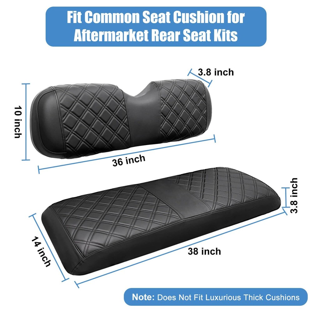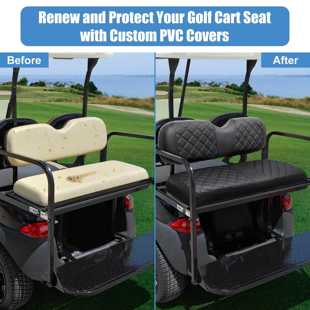 Golf Cart Rear Seat Covers for EZGO Club Car Yamaha Aftermarket Rear Seat Cushion, Rear Seat Cover with Concave and Convex Design, Thick Vinyl Leather Comfortable, Breathable & Easy to Clean ✅ FIT Models: Golf cart rear seat covers is only suitable for a common seat cushion for aftermarket rear seat kits of EZGO,Yamaha, Club Car and Icon golf carts. This golf cart rear seat cover kit contains 1*Back backrest cover (about L36 x W10 x H3.8 inches) and 1*Back Bench seat cover (about L38 x W14 x H3.8 inch). Please measure the size of seat before purchasing. ✅Luxury Appearance: Golf cart rear seat cover adopts a unique square stitching form, seat covers inner layer are made of thick breathable sponge, reducing body pressure and fatigue while improving ride comfort. Concave and convex design appearance, make your golf cart look more luxurious. ✅Premium Material: Seat cover is made of high-quality breathable PVC faux leather, which is very soft, harmless, durable, scratch-resistant, and easy to clean. It is resistant to wear and tear as well as UV exposure, eliminating concerns of cracking and fading. ✅Upgrade Design: ①Smooth vinyl PVC leather material and black color make it easy to clean and dirty resistance. ②Square concave and convex design appearance makes your golf cart brand new and fashion. ③Adjustable shoulder straps and retractable buckles design make install easily. ✅Easy Installation: Golf cart black leather seat cover is a fully molded seat cover that perfectly covers the old seat cover of the golf cart without the use of gun nails and without removing the old vinyl seat cover. In addition, the adjustable shoulder straps and retractable buckle design help to easily install and remove in minutes. Golf Cart Seat Covers Kit for Aftermarket Rear Seat, for Common Seat Cushion, Thick Vinyl Leather Comfortable, Breathable & Easy to Clean Feature: High-quality PVC faux leather, resistant to wear and tear as well as UV exposure, no need to worry about fading and cracking. Black color and smooth vinyl PVC leather material make it dirty resistance and easy to clean. Square concave and convex design appearance makes your golf cart brand new and fashion. Package Include: 1*Back backrest cover (about L36 x W10 x H3.8 inches) 1*Back Bench seat cover (about L38 x W14 x H3.8 inch) About What can we offer ? brand has been established for more than 10 years now, it is a professional manufactuer of golf cart accessories, we could offer most kinds of accessories mainly in brand Club car, Ezgo, Yamaha.We are still constantly adding and updating our products. Shipping We offer FREE shipping on all orders! We ship within Three business days of payment, usually sooner. We use a selection of shipping services such as UPS, FedEx, USPS etc. We only ship to the lower 48 states, no APO/FPO addresses or PO Boxes allowed. Local pickups and combined shipping options are not provided at this time. Return You can return a product for up to 30 days from the date you purchased it. Any product you return must be in the same condition you received it and in the original packaging. Please keep the receipt. Payment We accept payment by any of the following methods: PayPal Please pay as soon as possible after winning an auction, as that will allow us to post your item to you sooner! Feedback Customer satisfaction is very important to us. If you have any problem with your order, please contact us and we will do our best to make you satisfied. Contact Us If you have any queries, please contact us via ebay. We usually respond within 24 hours on weekdays. Please visit our eBay store to check out other items for sale! Thank you for shopping at our store.