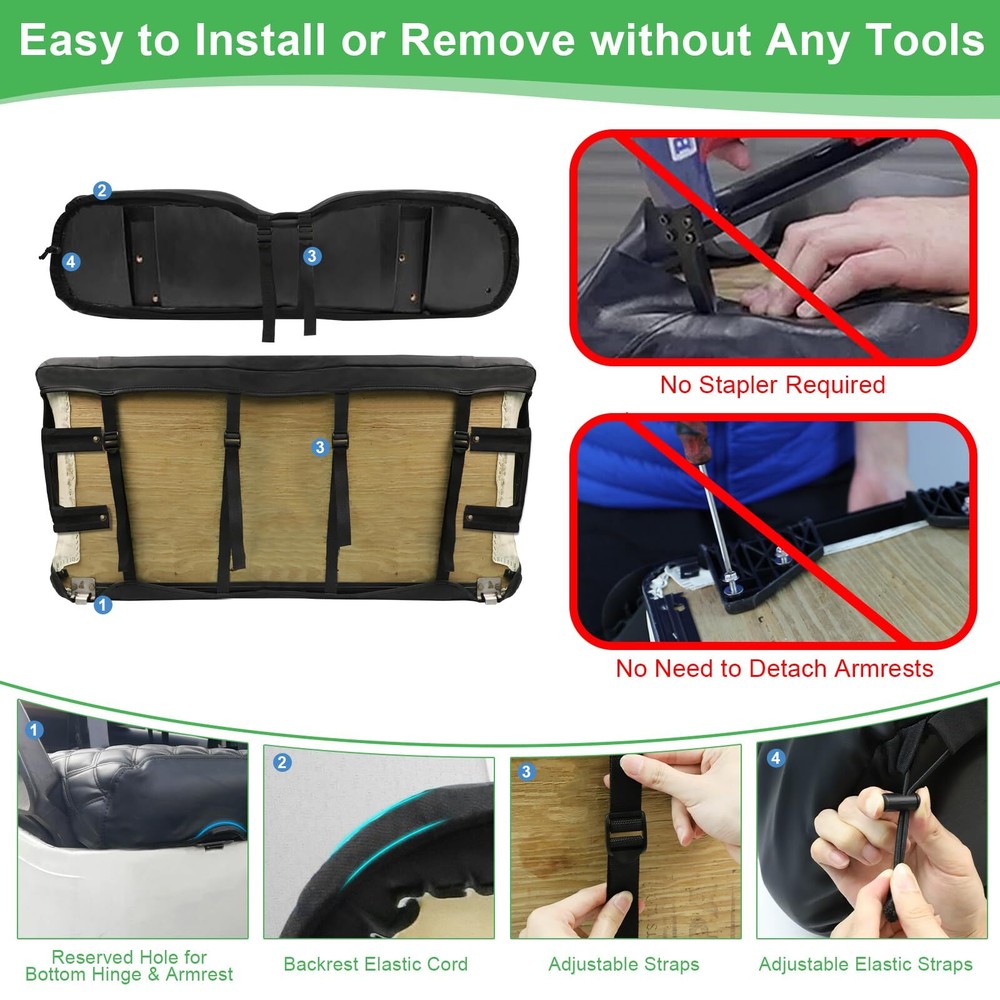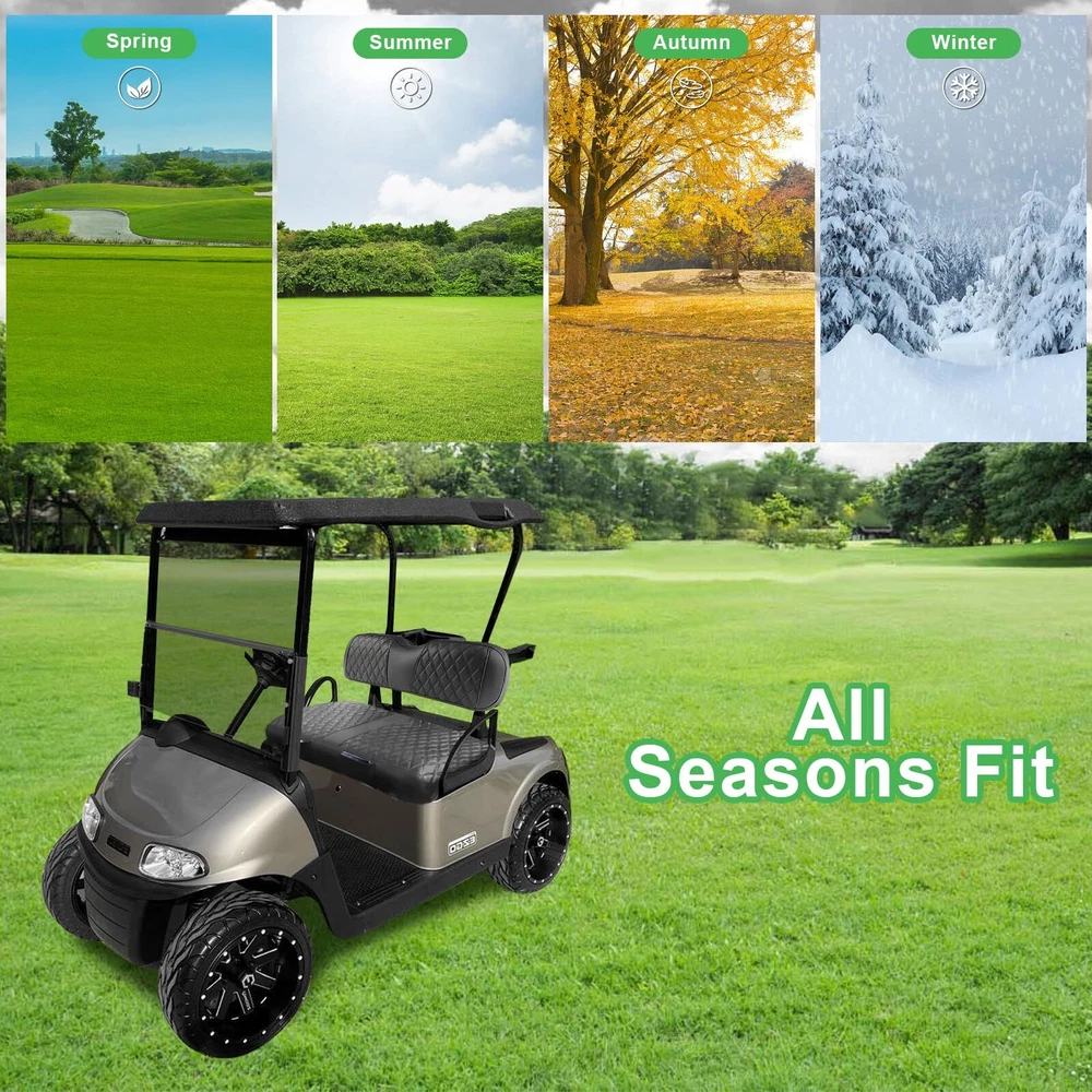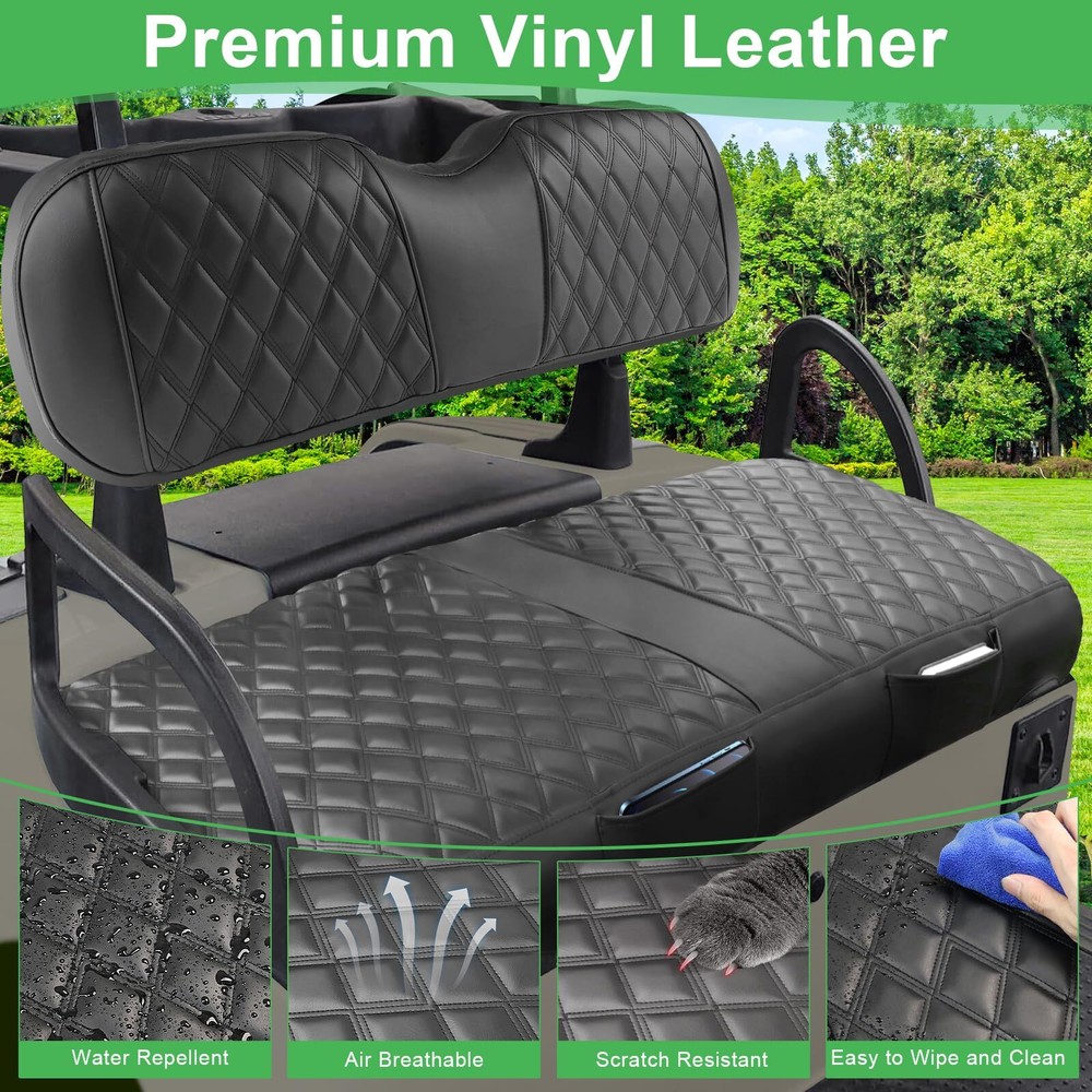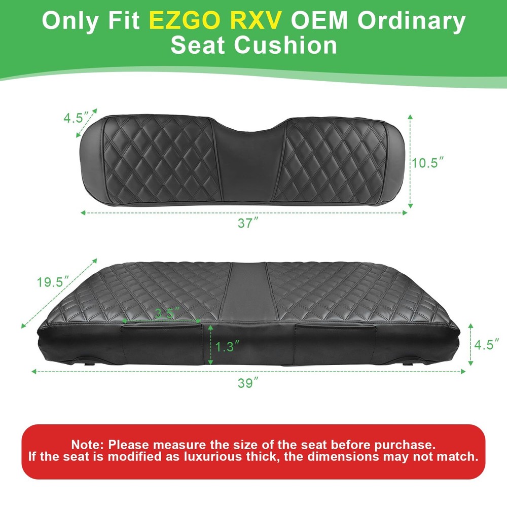 EZGO RXV Seat Cover, Golf Cart Front Seat Cover Fit for EZGO RXV OEM Ordinary Seat Cushion, Thick Vinyl Leather Comfortable/Breathable, No Need Any Tools or Detaching Armrests Compatible Models: Golf cart seat covers fit EZGO RXV front OEM ordinary seats only. This EZGO seat cover kit contains 1 front backrest cover (about 37 X 10.5 X 4.5 inches) and 1 front bench seat cover (about 39 X 19.5 X 4.5 inches). Note: NOT fit luxurious thick cushions, NOT fit rear seat Simplified Setup: This ezgo rxv front seat cover is designed for hassle-free installation, requiring no tools or the removal of armrests. The inclusion of straps ensures a smooth installation process, eliminating the need for nails or the removal of the existing vinyl seat cover. Simply drape the cover over your old seat, and with the adjustable shoulder straps and retractable buckles, you can install or remove the seat cover in a matter of minutes Superior Construction: Crafted from premium, long-lasting thick PVC faux leather, these ezgo front seat covers offer unparalleled softness, safety, durability, water resistance, scratch protection, UV defense, and effortless maintenance. Fading and cracking are not a concern. Additionally, the interior boasts a thick, breathable sponge layer with exceptional resilience, enhancing your comfort and overall golfing experience Exquisite Diamond Aesthetic: Transform your worn or damaged golf cart seat with bespoke, luxurious diamond-patterned ezgo seat covers set for the front. These covers enhance the style and elegance of your golf cart, adding a touch of sophistication. Constructed from high-quality, durable PVC vinyl leather with breathable foam padding, they offer a perfect blend of durability, comfort, and fashion, ensuring a supremely enjoyable and comfortable golfing experience Enhanced Configuration: Featuring a sleek vinyl PVC leather material in a black hue, this design offers exceptional ease of cleaning and dirt resistance. The deluxe diamond pattern revitalizes your golf cart, lending it a modern and fashionable look. High-quality elastic rope and adjustable buckles ensure that the seat covers fit securely around the cushions, providing stability. Additionally, a small pocket provides convenient storage for keys, cards, phones, and other essential items EZGO RXV Seat Cover, Golf Cart Front Seat Cover Fit for EZGO RXV OEM Ordinary Seat Cushion, Thick Vinyl Leather Comfortable/Breathable, No Need Any Tools or Detaching Armrests Shipping We offer FREE shipping on all orders! We ship within Three business days of payment, usually sooner. We use a selection of shipping services such as UPS, FedEx, USPS etc. We only ship to the lower 48 states, no APO/FPO addresses or PO Boxes allowed. Local pickups and combined shipping options are not provided at this time. Return You can return a product for up to 30 days from the date you purchased it. Any product you return must be in the same condition you received it and in the original packaging. Please keep the receipt. Payment We accept payment by any of the following methods: PayPal Please pay as soon as possible after winning an auction, as that will allow us to post your item to you sooner! Feedback Customer satisfaction is very important to us. If you have any problem with your order, please contact us and we will do our best to make you satisfied. Contact Us If you have any queries, please contact us via ebay. We usually respond within 24 hours on weekdays. Please visit our eBay store to check out other items for sale! Thank you for shopping at our store.