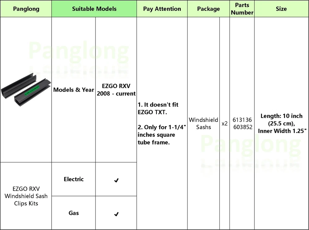 EZGO RXV Windshield Sash Clips 10" OME 603852 for 2008 Up Golf Cart Models: For 2008 - current EZGO RXV Gas and Electric Golf Cars(It doesn't fit EZGO TXT). Length: 10 inches (25.5 cm), inner width 1.25", only for 1-1/4" inches square tube frame. Replaces EZGO Part # 613136 , 603852.Package included:2pcs Windshield Sash for E-Z-GO RXV. EZGO RXV Windshield Sash Clips are made of excellent material,durable and long-lasting, easy to install and better secure the windscreen of your golf cart. Produced by : is committed to providing quality products and is very welcome to any product questions from our customers! Windshield Sash Clips Kits, Width 1.25" Length 10", OME52 for EZGO RXV 2008 Up Golf Cart Shipping We offer FREE shipping on all orders! We ship within Three business days of payment, usually sooner. We use a selection of shipping services such as UPS, FedEx, USPS etc. We only ship to the lower 48 states, no APO/FPO addresses or PO Boxes allowed. Local pickups and combined shipping options are not provided at this time. Return You can return a product for up to 30 days from the date you purchased it. Any product you return must be in the same condition you received it and in the original packaging. Please keep the receipt. Payment We accept payment by any of the following methods: PayPal Please pay as soon as possible after winning an auction, as that will allow us to post your item to you sooner! Feedback Customer satisfaction is very important to us. If you have any problem with your order, please contact us and we will do our best to make you satisfied. Contact Us If you have any queries, please contact us via ebay. We usually respond within 24 hours on weekdays. Please visit our eBay store to check out other items for sale! Thank you for shopping at our store.