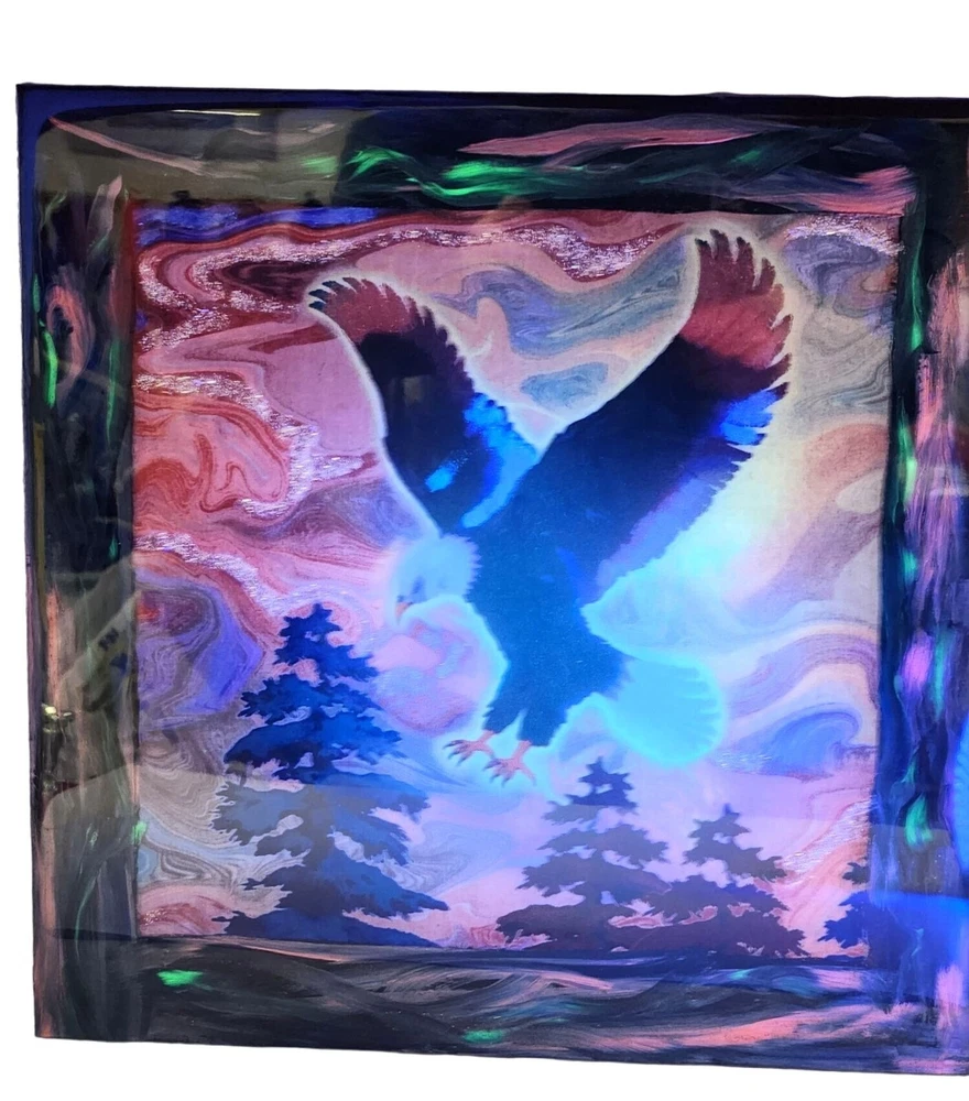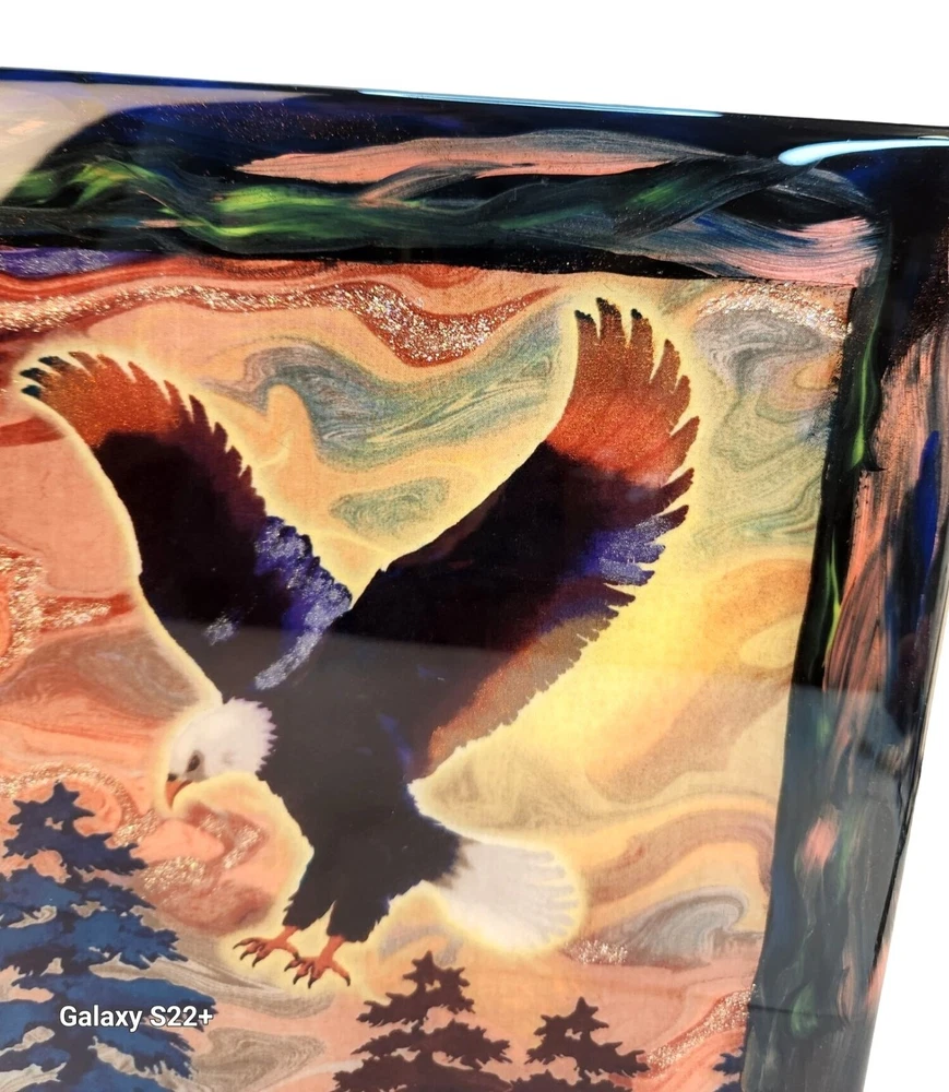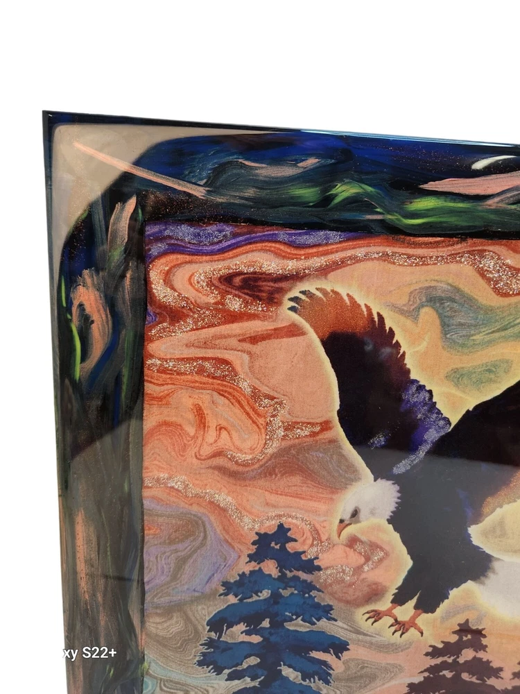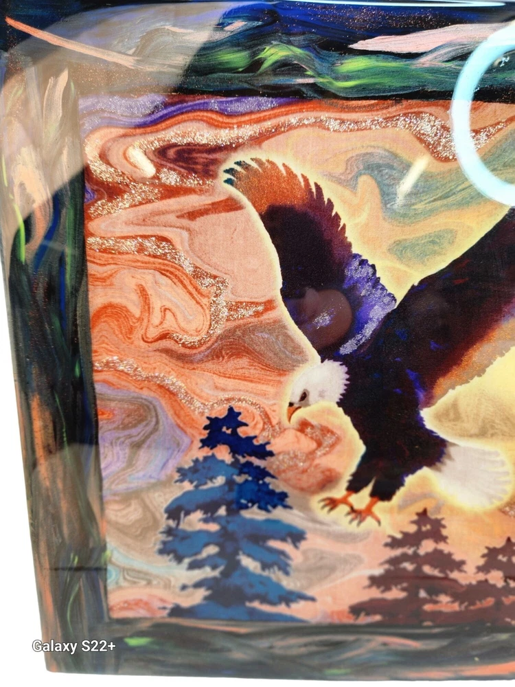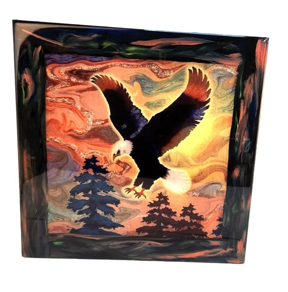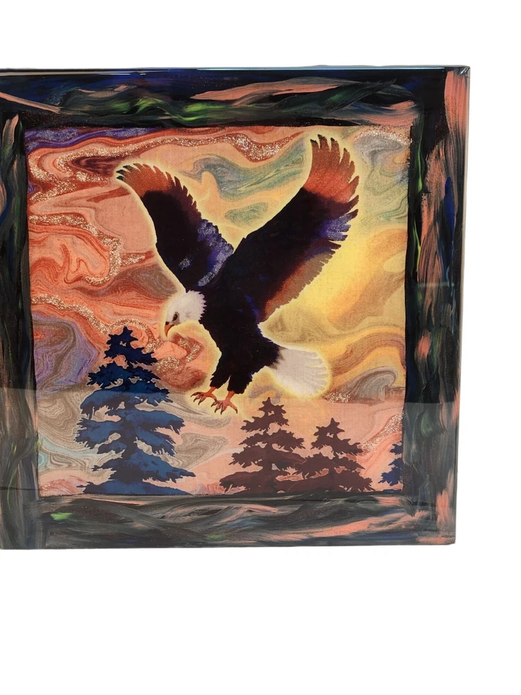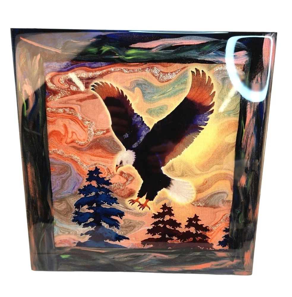 This handcrafted wall art piece features an eagle soaring against an abstract backdrop. It adds a touch of nature-inspired elegance to any space. The vibrant colors and detailed depiction make it an eye-catching addition to home or office decor. Some of this item will glow in the dark. Has a cork backing so you can use it on a table top. • Square shape • Multicolor abstract background • Eagle design focal point • Handmade craftsmanship • Showcases a detailed American Eagle design • Made from high-quality, materials • Large size perfect for any pot or pan heat resistant up to 100 degrees. • Easy to clean and maintain, just use window cleaner • Ideal for house warming gifts Item will be well packed to prevent shipping damage.