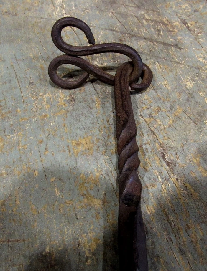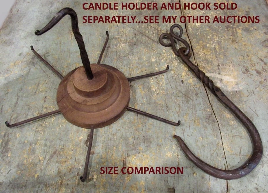 Offered is an early hand forged iron hook found in New Hampshire. Total length is 9 3/5 inches. Hook portion stands out 4 inches. Notice the decorative turnings on the wrought iron hook. Great age and wear for a hand forged primitive piece. The last picture shows a wood candle dryer that could be used with the hand forged iron hook. This auction is only for the hand forged iron hook. See my other auctions for the wood candle dryer.