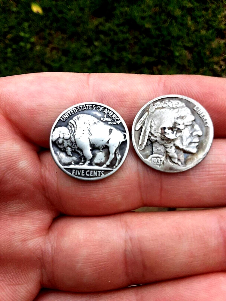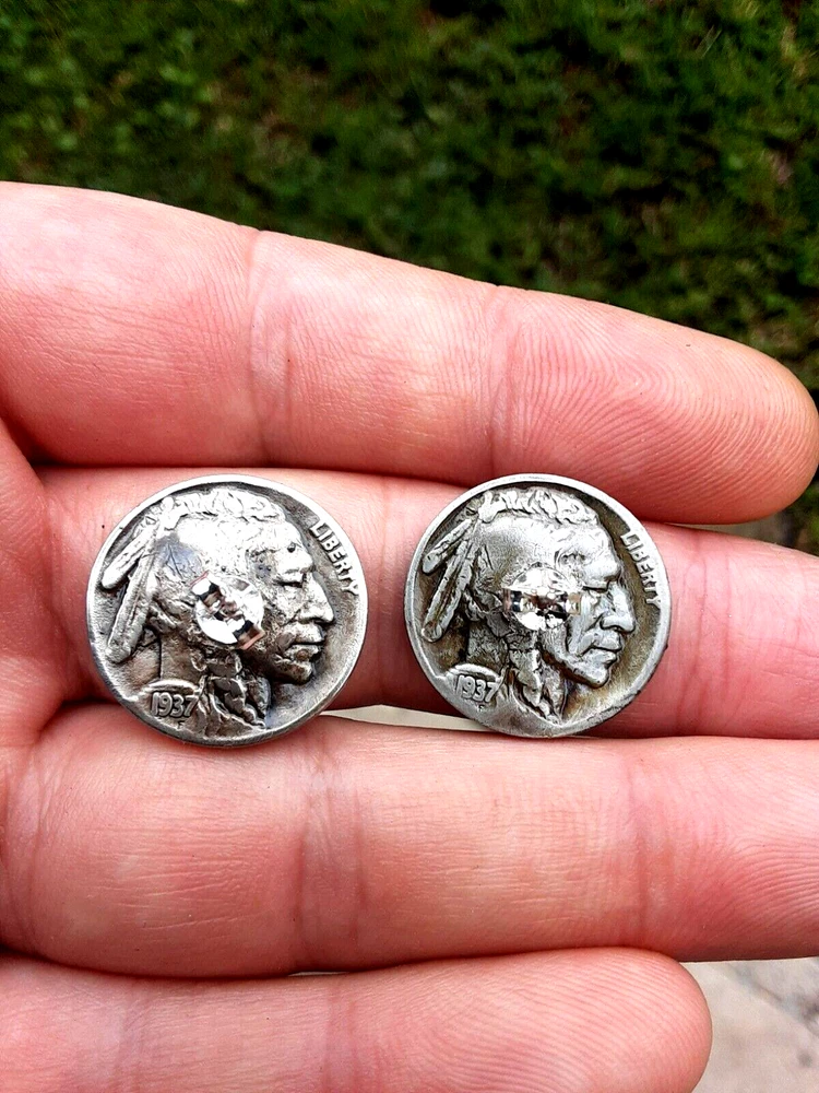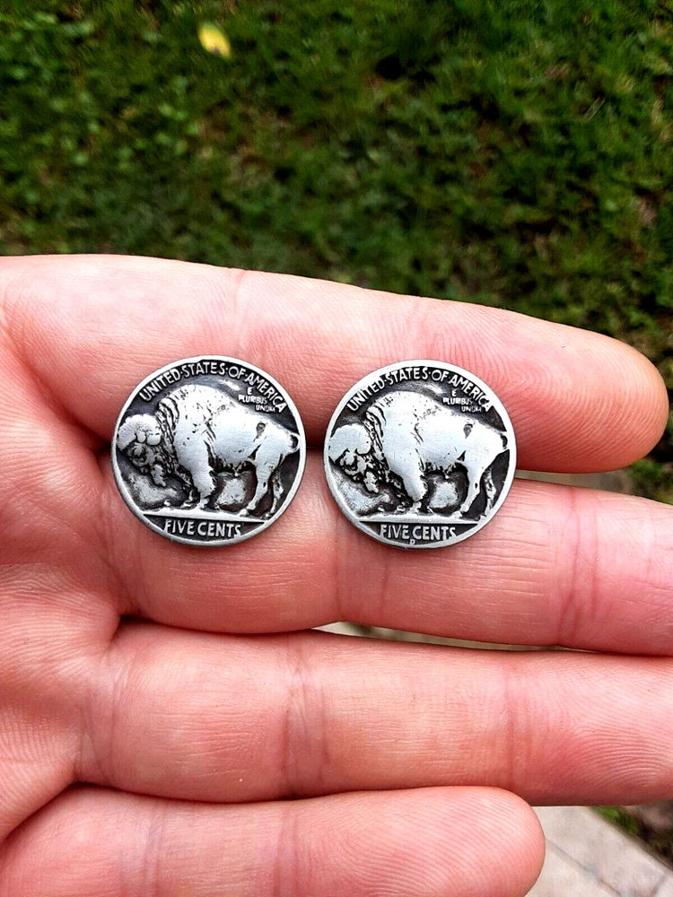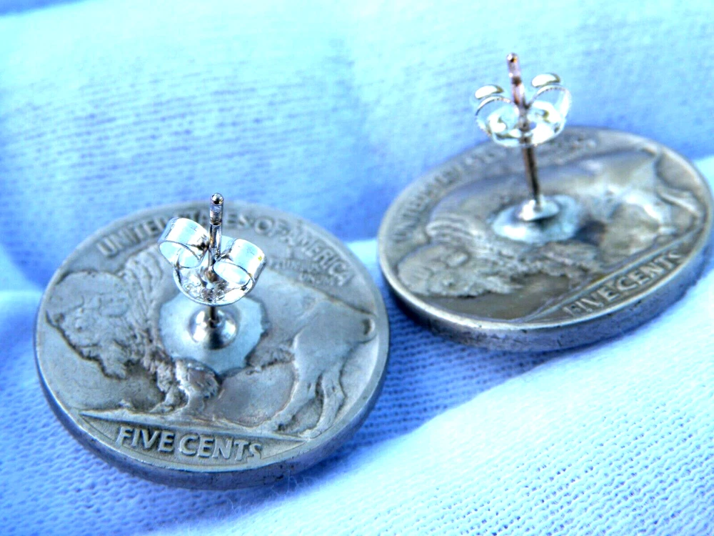 Thank you for your interesting. This is Old Vintage 1937 authentic Buffalo Indian Nickel coins nickel and brass metal cleaned and polished Buffalo showing side two coins I can make both Indian or Indian and Buffalo showing side if you prefer. Please let me know when you purchased other wise you will receive Buffalo showing side ear ring. Sterling silver stud soldered to coin. Please check my other items. I make necklace, bracelet and ring with same coins or any other coins too. Also, I make bracelet with genuine American Buffalo Bison leather with vintage silver pieces and it will be customize to your wrist size.