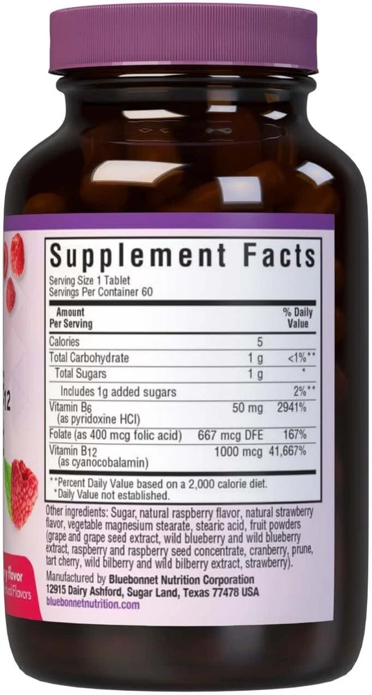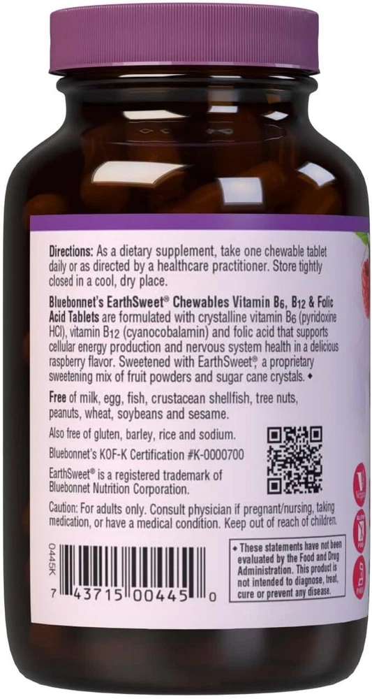 Bluebonnet Nutrition Earth Sweet Vitamin B6, B12, Plus Folic Acid Chewable Tablets, Vegan, Vegetarian, Gluten Free, Soy Free, Milk Free, Kosher, 60 Chewable Tablets, Raspberry Flavor