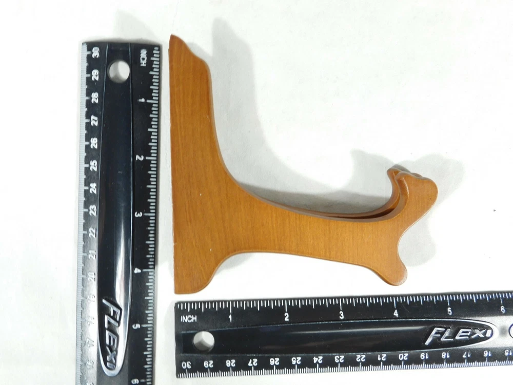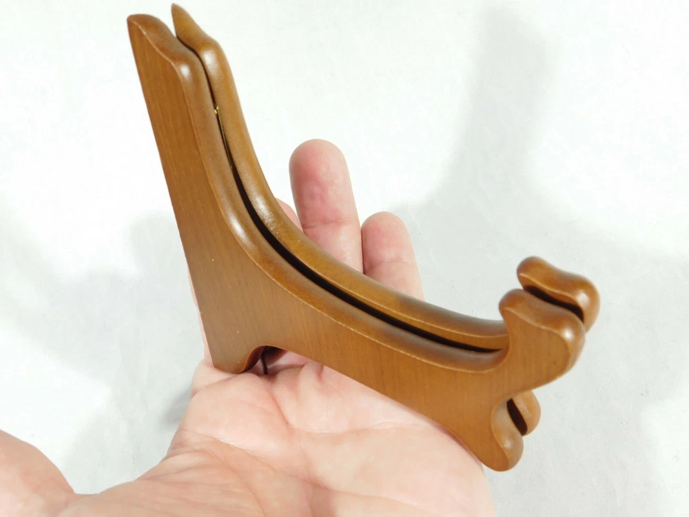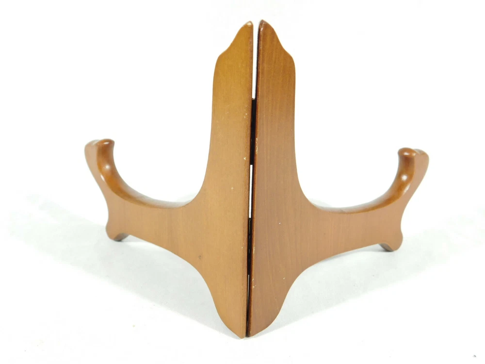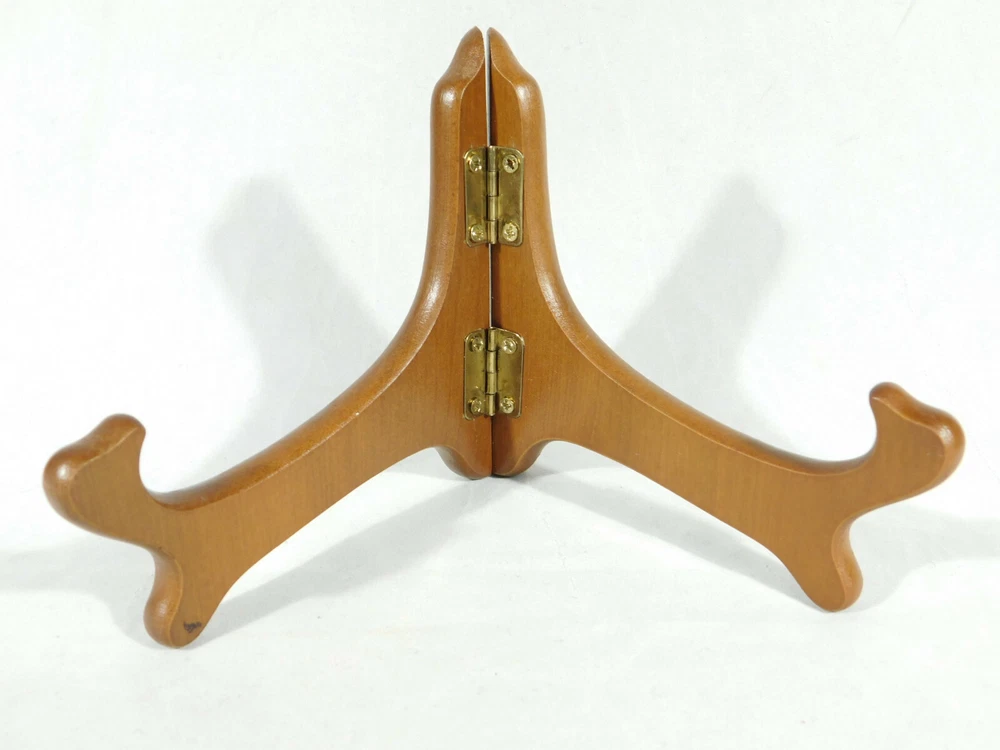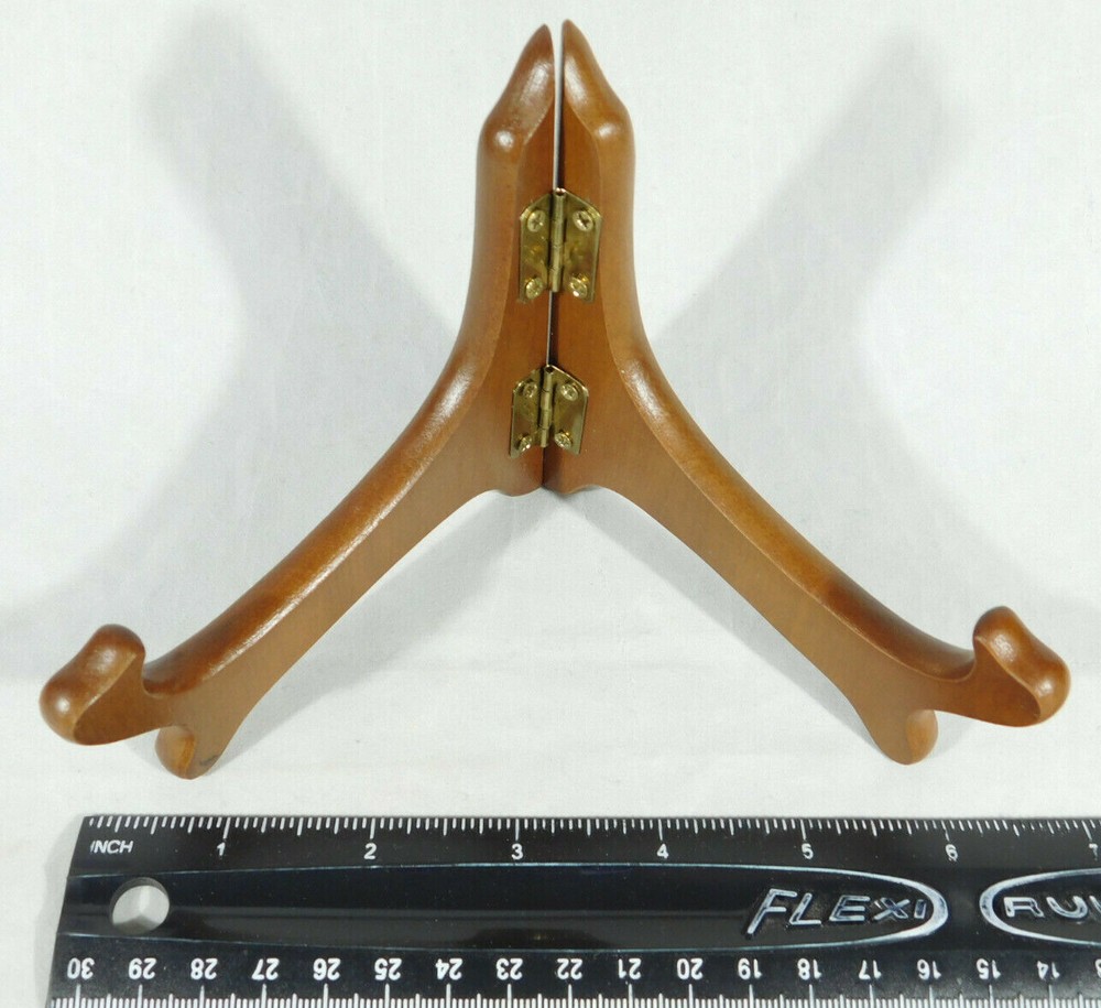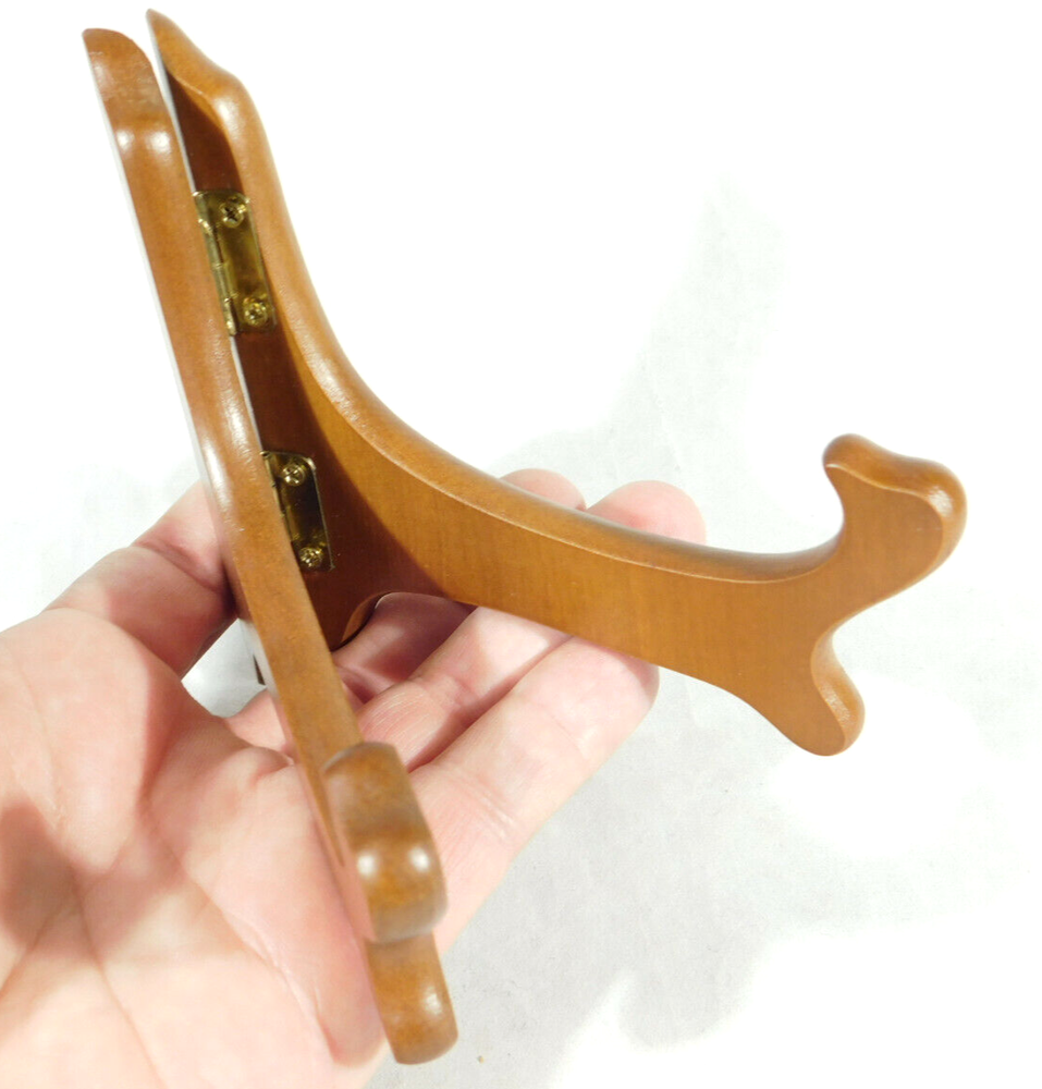 Hello, here is a small sized solid Wood folding and or adjustable Easel display stand with gold colored hinges! These are great for Bowls, plates, books or any other items you may want to display. This stand Opened measures around 6 1/2" at its widest and the back is 4 1/8" high by 4 1/2" deep. Please note that this stand does have a lower or short sized back and it will not hold taller pieces. Combine and save on shipping. INTERNATIONAL BUYERS PLEASE NOTE: Import duties and taxes are not included in the item price or the shipping charges. These are the buyers responsibility. If you are concerned about them, please check with your country's customs office before buying RETURN POLICY We guarantee you will be satisfied with your item or we'll refund your purchase price, less shipping charge, upon safe return of the item in original condition within 30 days. Prior to returning the item, please contact us within 48 hours of receiving item. If your item arrives damaged, please contact us within 24 hours of receiving as we will be happy to resolve any issue. Buyer is responsible for all return shipping charges.