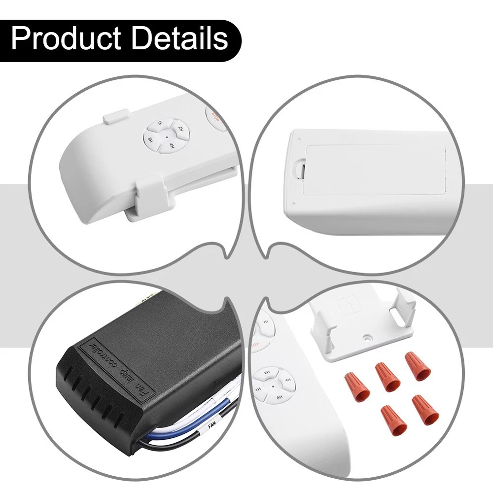 Easily Operable Ceiling Fan Light Remote Controller Set for Modern Homes DESCRIPTION Features: - Brand new and high quality - Made of high quality material, - EASY INSTALLATION - Installation of the ceiling fan remote control kit is a breeze. - Sensitive keys: and sensitive keys, marked in English, easy and quick to operate, long service life. - Stable Receiver: The sturdy material is , the heat dissipation is even, and the service life is long. - Textured shell: Made of high-quality materials, anti-fall and , streamlined design, comfortable grip curvature. Specification: - Name: Ceiling Fan Light Remote Control Kit - Remote control size: 136*50*18mm - Product model: 110V, 220V (optional) - Battery type: No. 7 AAA battery - Applicable voltage: 90-265V - Product material: PC - Remote control distance: ≥30 meters - Receiving size: 115*53*25mm - Speed gear: high, medium and low three gears - Timing function: 1, 2, 4, 8 hours Package includes: 1*set ceiling fan lamp remote control kit Notice: 1. Due to various factors such as display brightness and light brightness, the actual color of the product may be slightly different from the website picture. 2. Please allow a slight deviation between the data and the manual measurement. POLICES Shipping Payment WARRANTY We only ship to confirmed Order addresses. Please comfirm that your Order address is in line with your shipping address. Please kindly note that the c ombined shipping is not provided because the shipping fee is calculated by weight. Also, the each additional item means exactly the the same color and size. It takes about 7 -15 working days to US; about 10-30 working days to other countries. for TRANSIT time may be a little delayed because of the bad weather and customs inspection . If you do not receive your item within 30 working days since payment finished, please contact us immediately for further assistance. Payment must be completed within 5 days. If you have any problems about payment, please contact us via message. We strive for 100% customer satisfaction! Positive is very important to us. If you have any questions, p lease feel free to contact us via "Ask seller a question" . We will reply your email within 24 working hours. On Nov 8, 2024 at 03:00:14 PST, seller added the following information: