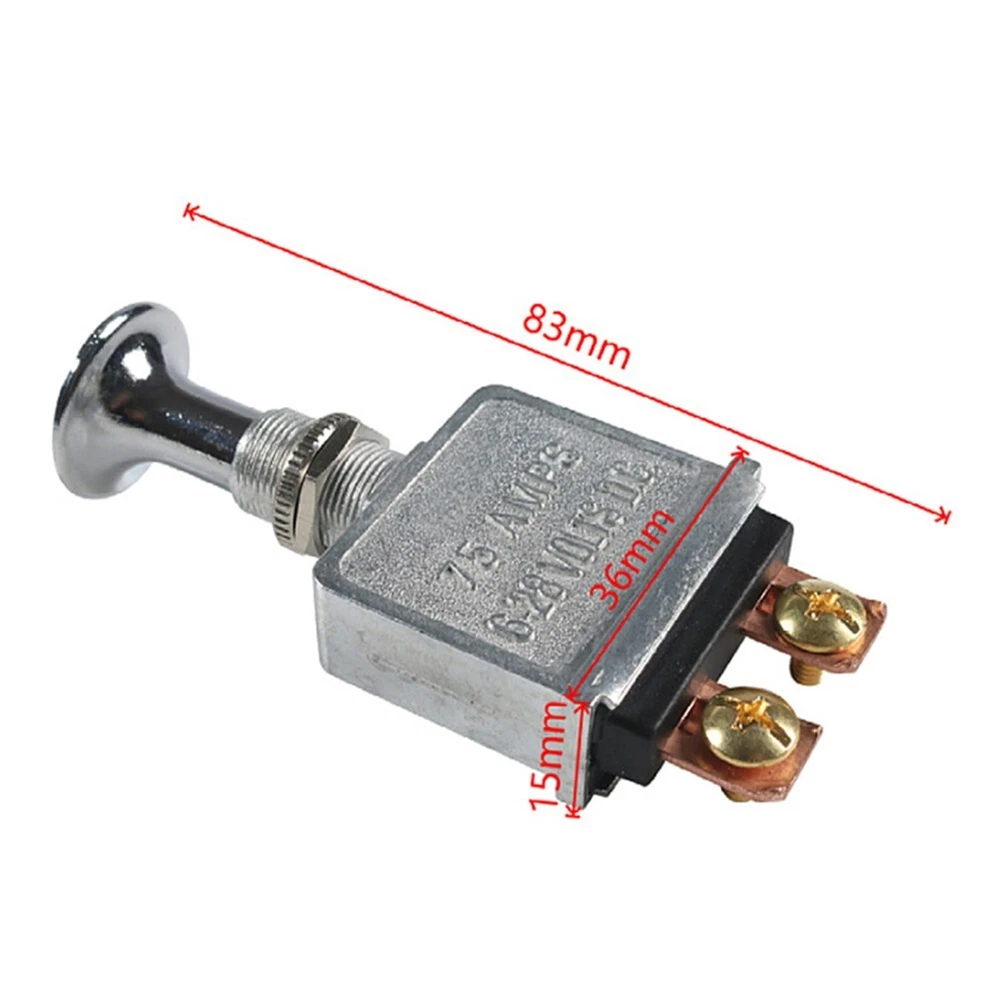 Product Description Features: *Heavy Duty 75A Push Pull Switch 6-28V DC: This switch is designed for heavy-duty applications, with a maximum rating of 75 Amps at 6-28 Volts DC. It is for high-power electrical systems. *2 Position On-Off: The switch features a 2-position design, allowing you to easily turn the circuit on and off as needed. It provides a convenient and reliable way to control the power supply. *The switch is equipped with a heavy-duty, which not only enhances its appearance but also provides a comfortable grip for easy operation. *Copper Screw Terminals and Zinc Alloy Body: The switch is built to last, with copper screw terminals that ensure secure connections and a zinc alloy body that can withstand harsh conditions. *Wide Application: This switch can be used in various push button switch applications, including cars, trucks, buses, ATV, RV, boats, marine, motorcycles, airplanes, helicopters, and heavy equipment. *Product function: mainly realize the start, stop, reversing and other functions of the main power supply or important components. Specifications: *Part Name:Heavy Duty Push Pull On-Off Switch *Material: switch body: zinc alloy; terminal: copper; knob: chrome-plated *Size: 8.3*3.6*2.2CM *Color: silver Product current: 75AMP Product voltage: 6-28V Product pin: 2P Product installation size: mounting rod length 5/8 inch(approximately equal to 15.875 mm), Diameter: 15/32 inch(approximately equal to 11.906 mm), Opening size: 12mm Package Content: 1*Heavy Duty Push Pull On-Off Switch Note: 1. The real color of the item may be slightly different from the pictures shown on website caused by many factors such as brightness of your monitor and light brightness. 2. Please allow slight manual measurement deviation for the data. Payment Payment must be completed within 5 days. If you have any problems about payment, please contact us via ebay message. Delivery details We only ship to confirmed ebay Order addresses. Please comfirm that your Order address is in line with your shipping address. Please kindly note that the c ombined shipping is not provided because the shipping fee is calculated by weight. Also, the each additional item means exactly the the same color and size. It takes about 7 -15 working days to US; about 10-30 working days to other countries. Transit time may be a little delayed because of the bad weather and customs inspection . If you do not receive your item within 30 working days since payment finished, please contact us immediately for further assistance. Contact us We strive for 100% customer satisfaction! Positive Feedback is very important to us. If you have any questions, p lease feel free to contact us via "Ask seller a question" . We will reply your email within 24 working hours.