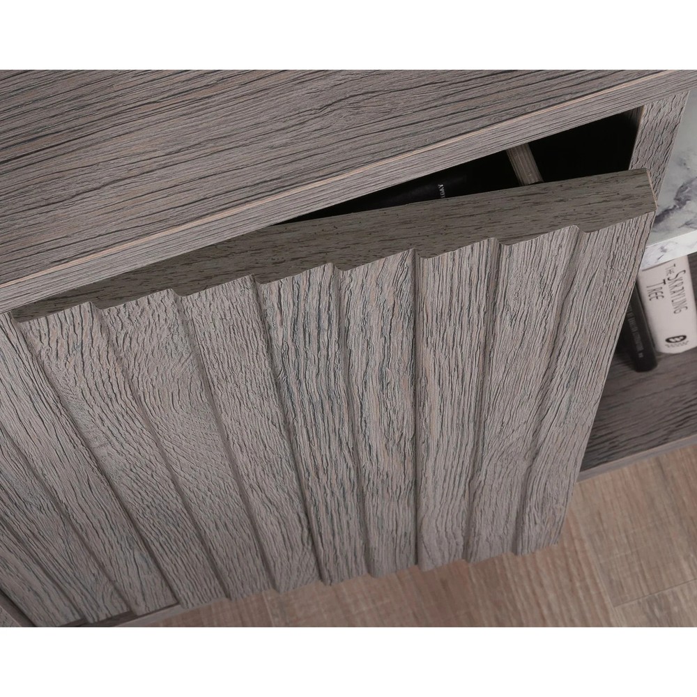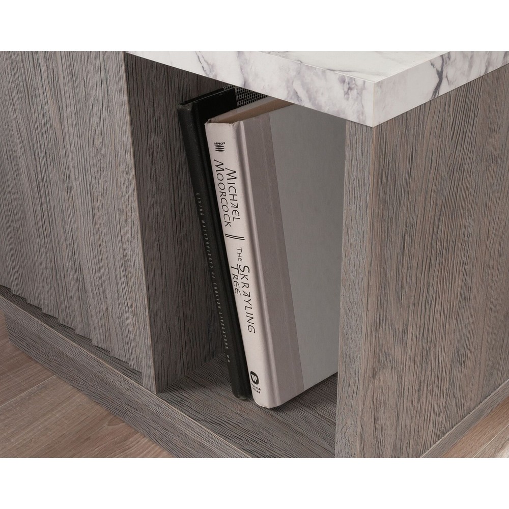 Complete your bedroom or living room aesthetic with a unique contemporary nightstand or end table. The nightstand with door from the East Rock® collection offers an uncommon modern style and bold design that will take your space to the next level. This nightstand with open shelf offers a spacious top surface with room to display items like an alarm clock, accent lamp, your smart phone, and a glass of water. The lower open shelf features a high-wear DuraGraph® faux white marble accent with cubbyhole storage underneath. To better accommodate your room layout, this contemporary end table can be assembled with the door and open storage area on the left or right side. A louvered door includes an adjustable shelf behind for convenient hidden storage. You can hide away books, the TV remote, Free Shipping Over $49.99* Details East Rock Nightstand Ao Product Description: Complete your bedroom or living room aesthetic with a unique contemporary nightstand or end table. The nightstand with door from the East Rock® collection offers an uncommon modern style and bold design that will take your space to the next level. This nightstand with open shelf offers a spacious top surface with room to display items like an alarm clock, accent lamp, your smart phone, and a glass of water. The lower open shelf features a high-wear DuraGraph® faux white marble accent with cubbyhole storage underneath. To better accommodate your room layout, this contemporary end table can be assembled with the door and open storage area on the left or right side. A louvered door includes an adjustable shelf behind for convenient hidden storage. You can hide away books, the TV remote, reading glasses, or a throw blanket. The end table with door is finished on all sides in Ashen Oak for a stunning bedside or chairside accompaniment to complete nearly any setting. Features Hidden storage behind door features an adjustable shelf. Cubbyhole and open shelf for additional storage. Unit can be assembled with door and open storage on left or right side. Finished on all sides for versatile placement. Ashen Oak finish with high-wear DuraGraph faux white marble accent. Dimensions: Bedside Table Assembled Product21.181 inches wide x 19.449 inches deep x 22.362 inches high