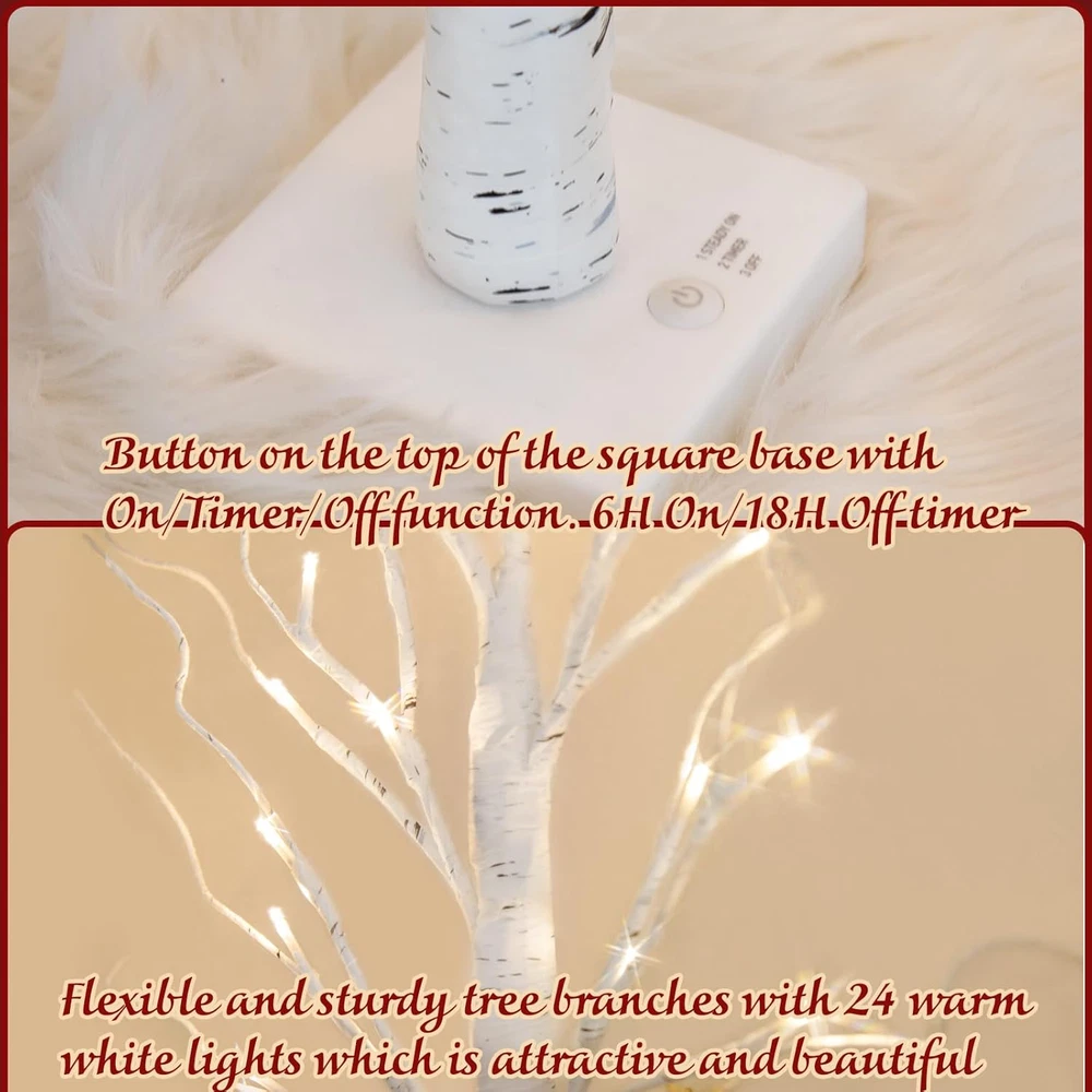 Store New Arrivals Add to Favorite View Feedback Contact Fast deliveries to the customer's home Quality customer service John Make the customers happy! Easter Decorations, 2FT Birch Tree with LED Lights, Warm White Light up Tree Lamp, Easter Tree for Home Table Inside, Easter Decor Indoor, Battery Powered, Timer (2PK) Description Easter Tree Decorations: Overall height of 2 FT with a 4 Inch square base and 24 warm white lights; The tree trunk and branches are wrapped in birch bark looking tape which is attractive and beautiful Lighted Tree Branches for Adjustable: The tree branch is flexible and can be reshaped just the way you want it; Also sturdy enough to hold lightweight accessories that refer to different festive atmosphere Batteries Powered: 3AA batteries powered (not included); Just install the batteries and no other additional installation required; Upgraded protection to ensure the safety of circuit board and wire inside Timer Function: Button on the top of the stand; that press once to steady on; twice for timer and a third time to turn off; No need to turn the tree light over to mess with the switch; 6H On/18H Off timer Versatile Decor for All Holidays: Just add and change hanging ornaments and you will get a versatile centerpiece all year round; Christmas decorations; Red heart for Valentines day; eggs for Easter etc; Ornaments are excluded Product Description The video showcases the product in use. The video guides you through product setup. The video compares multiple products. The video shows the product being unpacked. Are you still searching for the perfect Christmas decorations this year? Are you tired of the same old decorations year after year? Upgrade your Christmas decor with PEIDUO Birch Tree Lights. With unique design and warm white lights, they will add a touch of elegance to your holiday festivities. Experience the beauty of nature with its birch tree texture. 24 warm white lights create a cozy and enchanting atmosphere, bringing the charm into your home. The base also features a convenient button with 6H/18H timer, allowing you to customize the lighting duration to suit your needs. Powered by 3 AA batteries, these tree lamps offer long-lasting illumination, ensuring that your holiday spirit shines bright throughout the season. The flexible branches can be easily adjusted and shaped to your desired configuration, making installation effortless and hassle-free. Unleash your creativity and transform any occasion with these versatile tree lights. Whether it's a wedding, party, Christmas celebration, or Easter gathering, they are the perfect addition to create a captivating and festive ambiance. Let them grace your fireplace mantel, illuminate your dining table, or add a magical touch to your windowsill. Their versatility allows you to create a cozy and inviting atmosphere wherever you desire. Let your imagination run wild and impress your guests with your unique decorations. Christmas Decorations Add to Cart Add to Cart Add to Cart Add to Cart Add to Cart Add to Cart Add to Cart Customer Reviews 4.5 out of 5 stars 5,292 4.5 out of 5 stars 4,095 4.3 out of 5 stars 32 4.4 out of 5 stars 992 4.4 out of 5 stars 992 4.2 out of 5 stars 508 3.8 out of 5 stars 25 Price $19.99 $ 19 . 99 $17.99 $ 17 . 99 $59.99 $ 59 . 99 $24.99 $ 24 . 99 $24.99 $ 24 . 99 $29.99 $ 29 . 99 $41.99 $ 41 . 99 Height 2Ft 2Ft 12.4Inch 17.5inch 17.5inch / 32inch Light Amount 24LT each tree 24LT 40LT 48LT 36LT / 146LT Light Color Warm white Warm white Warm white Warm white RGB / Warm white Power Source Batteries Batteries Plug in Plug in Batteries or USB Plug in Plug in Function Timer Timer Move and Music Lighted Multi-function button projection & timer Move and Music Light Source Type LED Item model number DCD010B Style 2PK Birch Tree Number of Items 2 Power Source Battery Powered Number of Light Sources 24 Control Method Remote Switch Type Push Button Lighting Method LED Lamp Type Table Lamp Number of Pieces 2 Bulb Shape Size A19 Installation Type Tabletop Product Dimensions 4"D x 4"W x 24"H Material Plastic Efficiency low to medium Controller Type Push Button Specific Uses For Product Decoration Included Components 24 Warm White Lights Timer Function Indoor/Outdoor Usage Indoor Water Resistance Level Not Water Resistant Item Weight 1.3 Pounds Connectivity Technology USB Special Feature timer Shade Color White Mounting Type Tabletop Color White Is Cordless? Yes Base Material Plastic Is Waterproof False Voltage 4.5 Volts (DC) Recommended Uses For Product Decoration Size 2PK Birch Tree ABOUT US We offer the best prices around on high quality products. Our E-store includes media such as books, movies, music and games while offering electronics, toys, sporting apparel, clothing, tools, general home, garden items and more. SHIPPING We are always working hard to ensure your package arrives as soon as possible. Please understand that some factors like weather, high postal traffic, and the performance of shipping companies are outside of our control. We offer free shipping to the lower 48 states and ship within 2 business days of payment, usually sooner. We do not accept P.O. Boxes. Please provide a physical address. For shipping outside of the continental USA, we only use eBay's Global Shipping Program. The item is shipped to KY and then sent to the rest of the world. International customers are responsible for all duties and taxes. Continue to 'check out' to calculate costs for shipping the item to your country. Messages regarding eBay's Global Shipping Program MUST be directed at eBay EXCLUSIVELY. RETURNS We offer a 30-Day Return Policy on items in which you are not completely satisfied with. You have the option of a full-refund or an exchange of the item. No returns are available on items shipped outside of the USA PAYMENT We accept PayPal. CONTACT US This page content is yet to come Please ad us to your favorite seller and visit again later Thank You CUSTOMER SATISFACTION We try our very best to make 