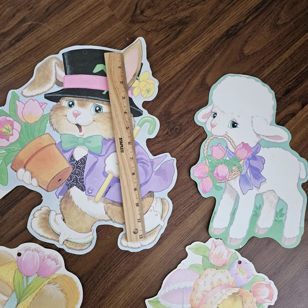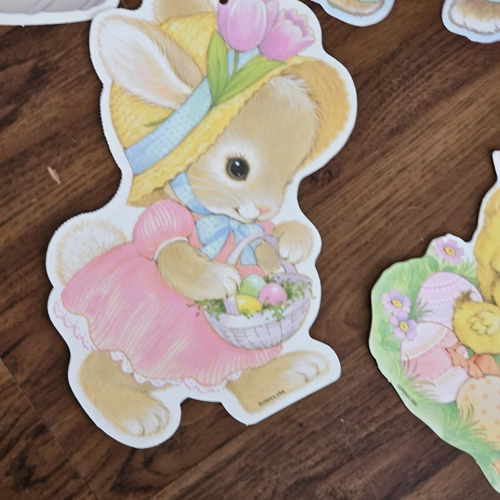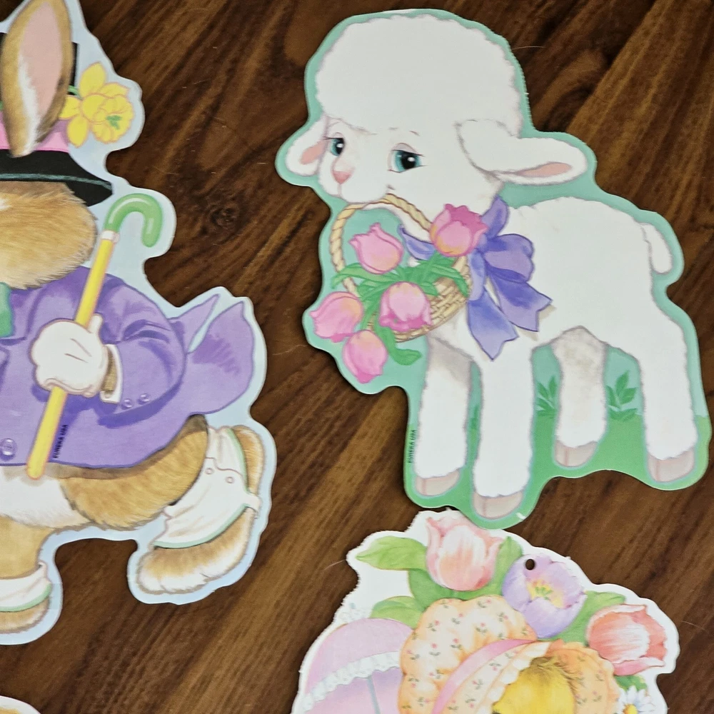 The product is a set of 5 vintage Easter die cuts featuring designs of bunnies, ducks, and lamps. These die cuts are made of paper and are two-sided. They are manufactured by Eureka in the United States. The designs are colorful and suitable for Easter decorations or crafts. See photos for some wear sold as is