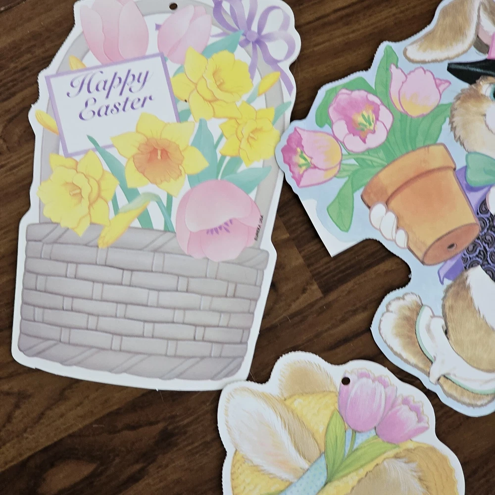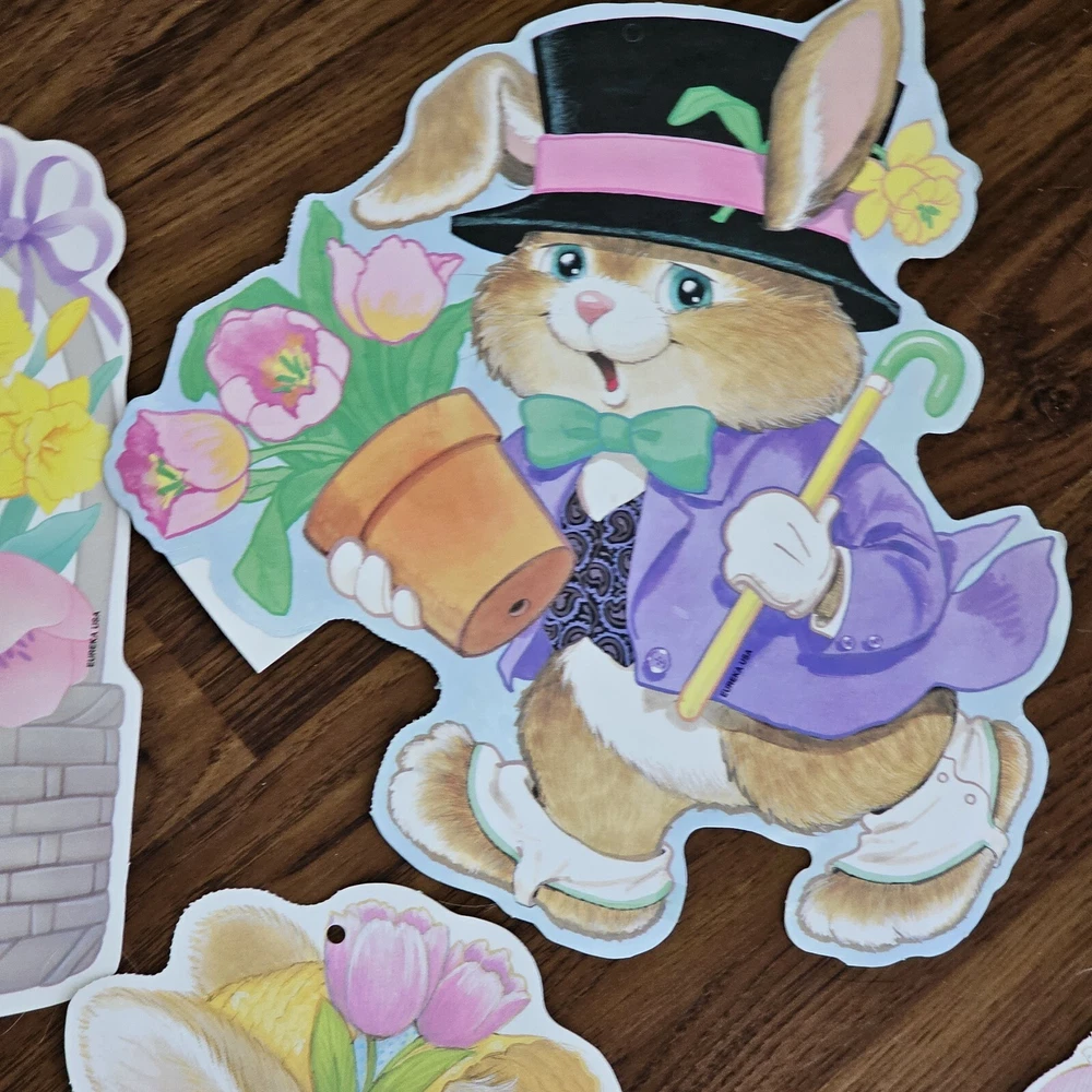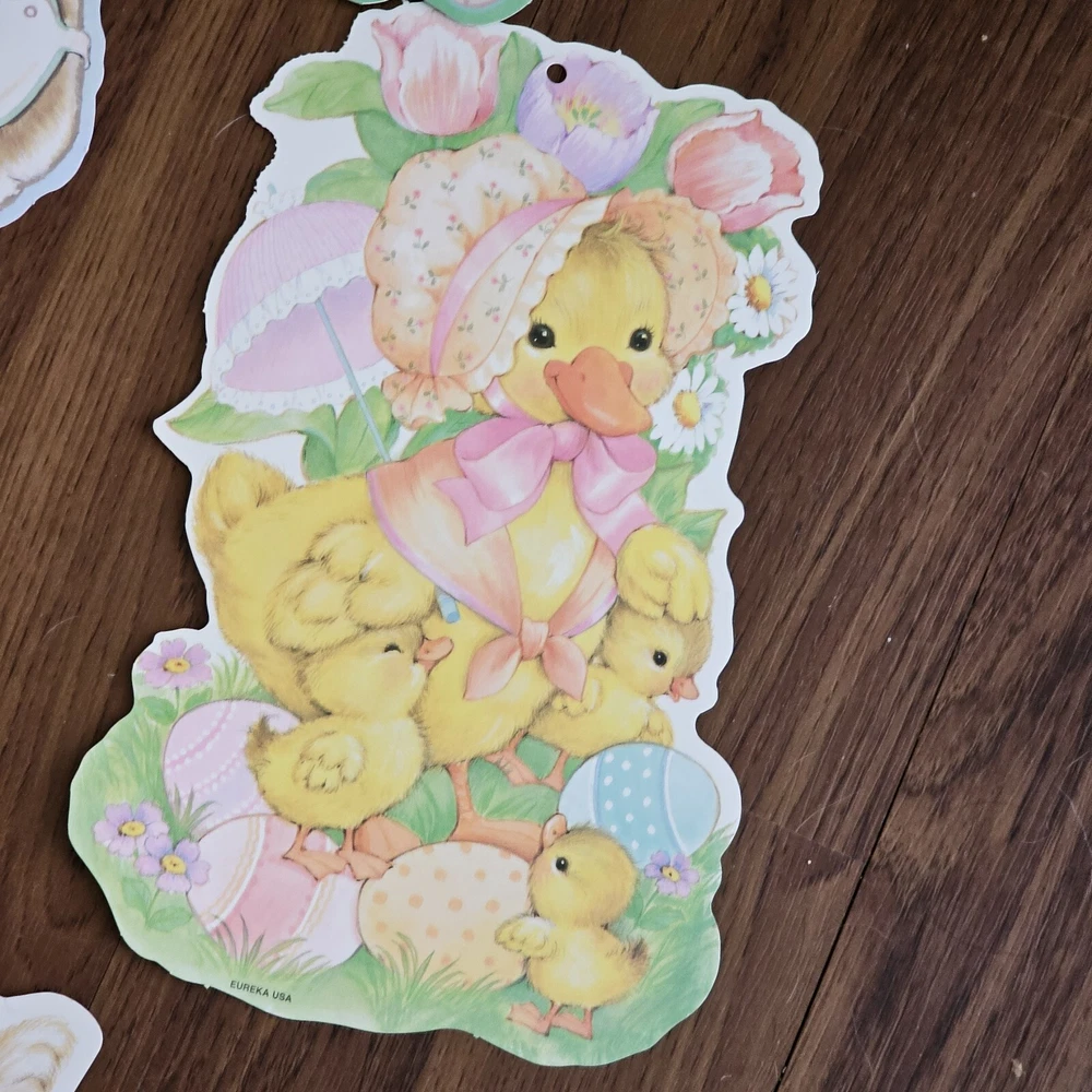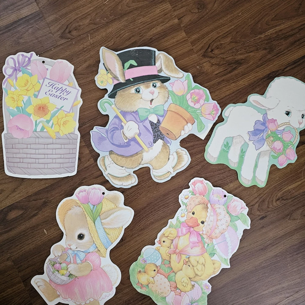 The product is a set of 5 vintage Easter die cuts featuring designs of bunnies, ducks, and lamps. These die cuts are made of paper and are two-sided. They are manufactured by Eureka in the United States. The designs are colorful and suitable for Easter decorations or crafts. See photos for some wear sold as is